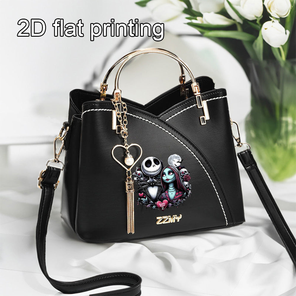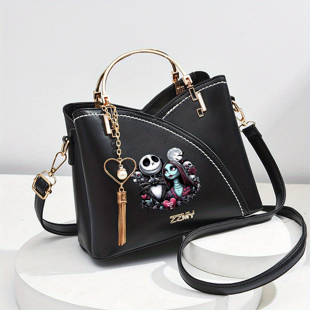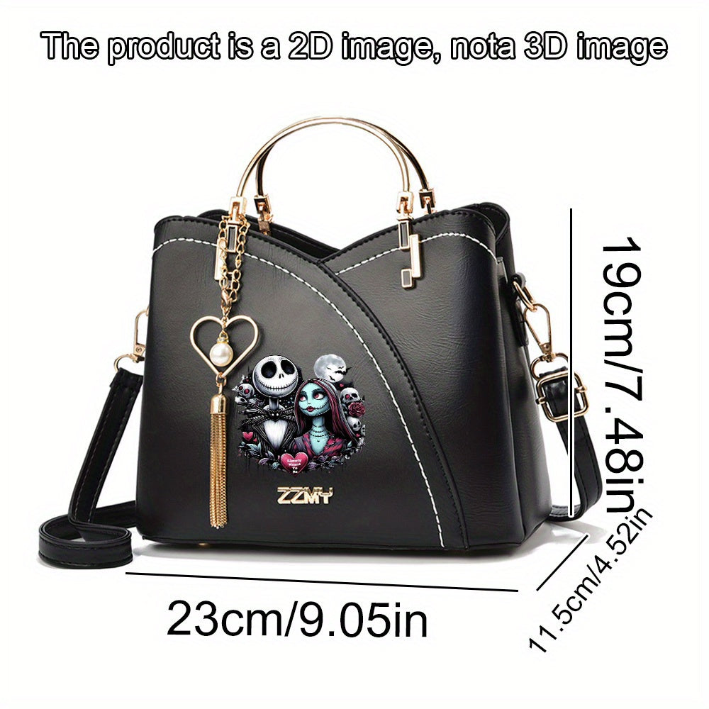 This officially licensed Disney The Nightmare Before Christmas crossbody bag features a vintage-inspired design in black PU leather-like material, accented with golden-tone hardware. Tailored for men, it includes a detachable shoulder strap for flexible carrying options. With multiple pockets, it offers practical organization for daily essentials, while the unique Jack Skellington and Sally pendant adds a distinctive touch reflecting the beloved characters. Made in Zhejiang, China, this durable and stylish bag seamlessly combines vintage aesthetics with modern functionality, making it an ideal accessory for fans and collectors alike.