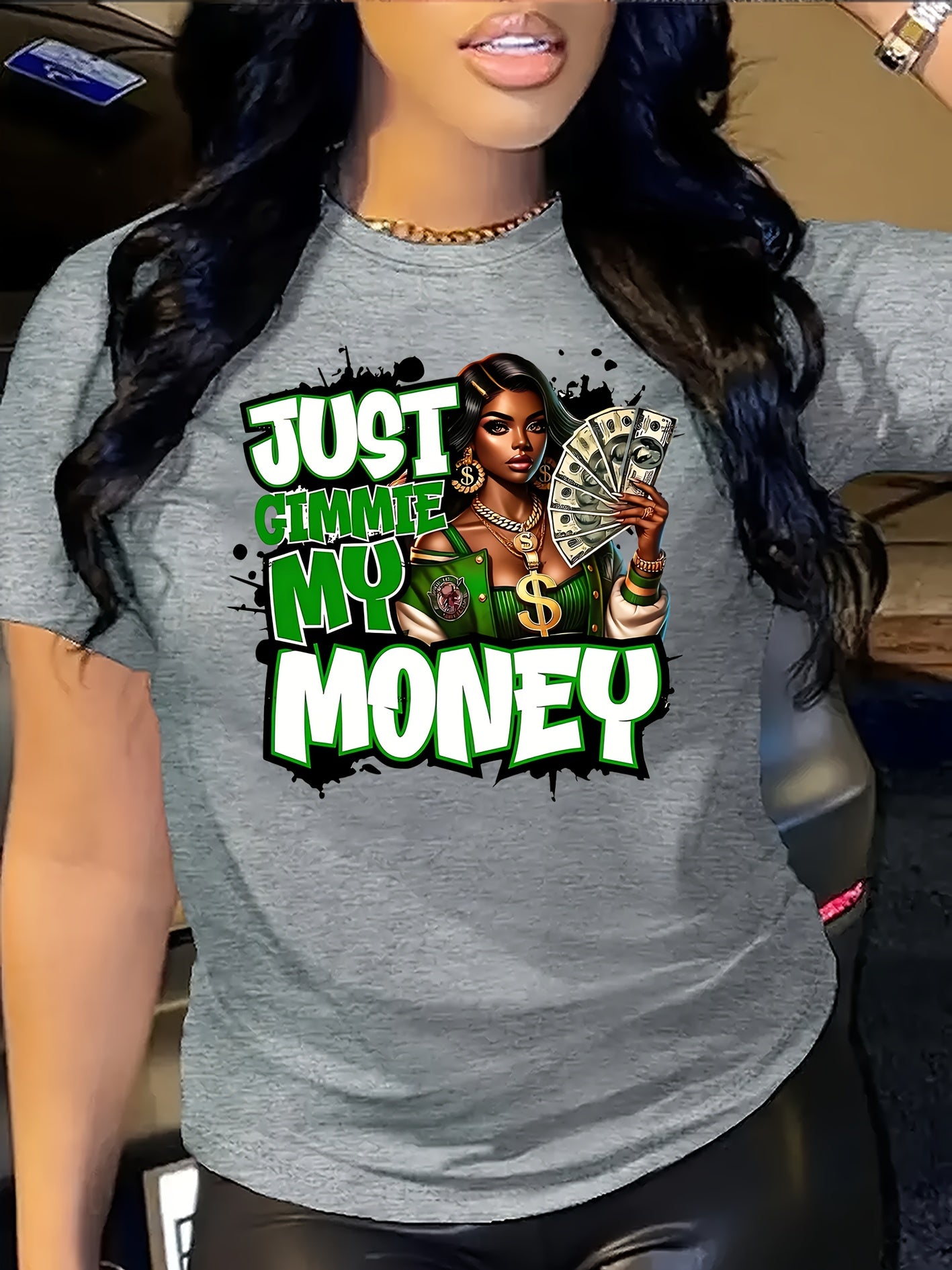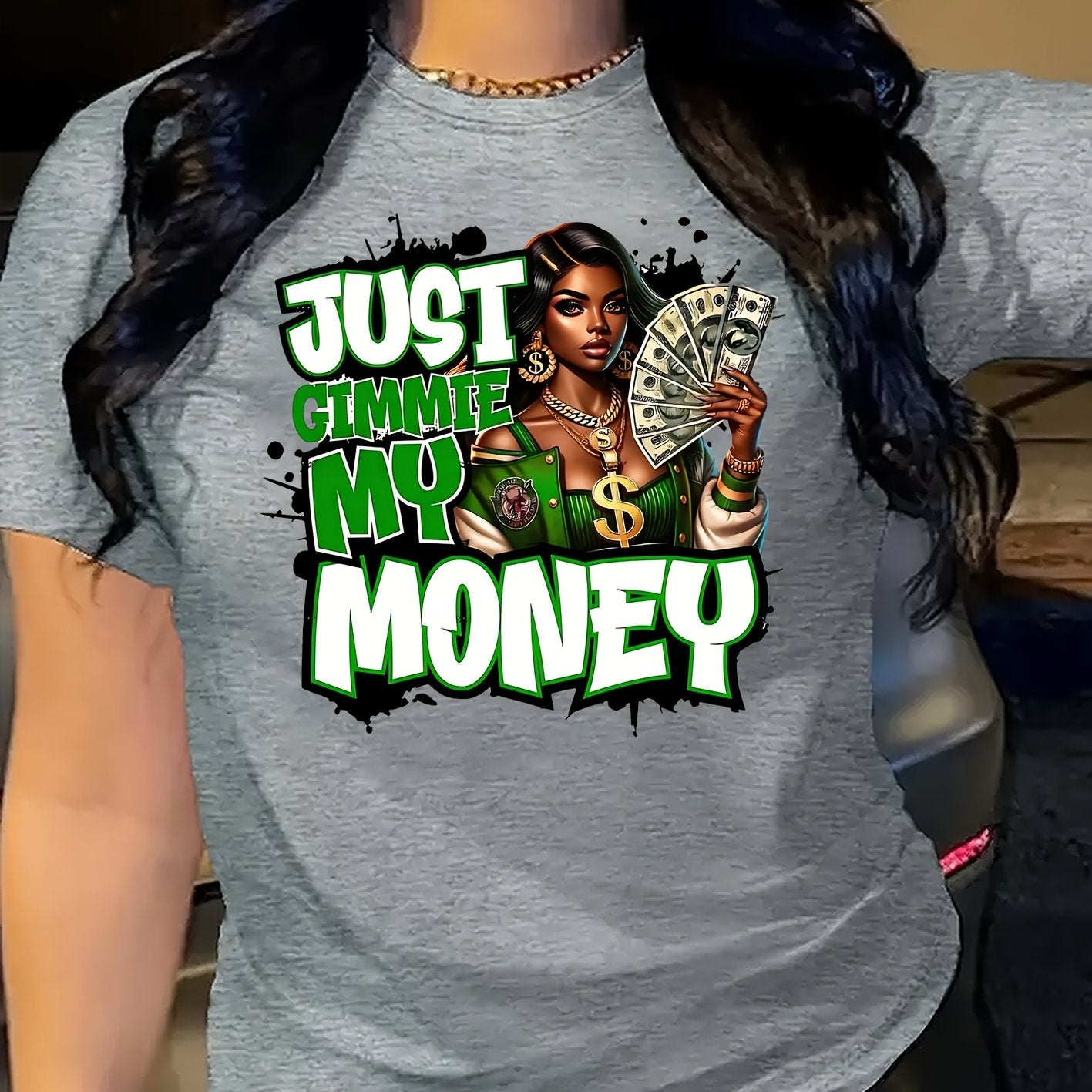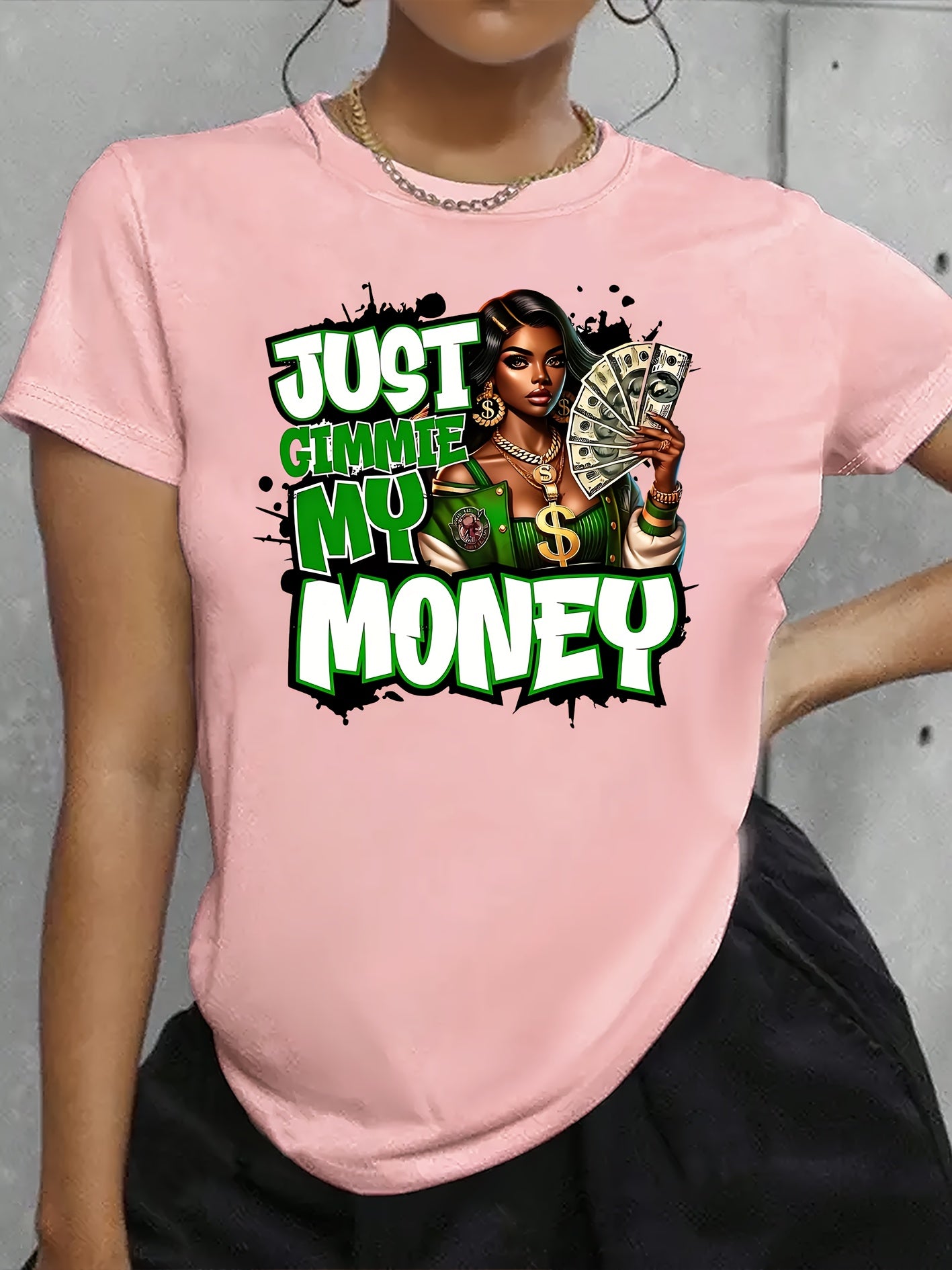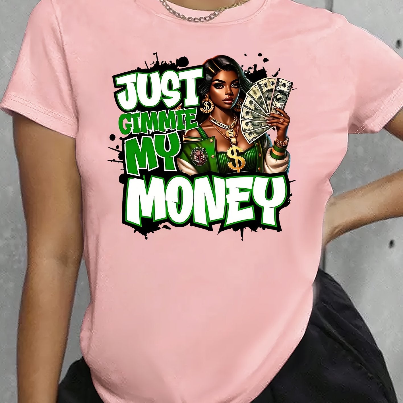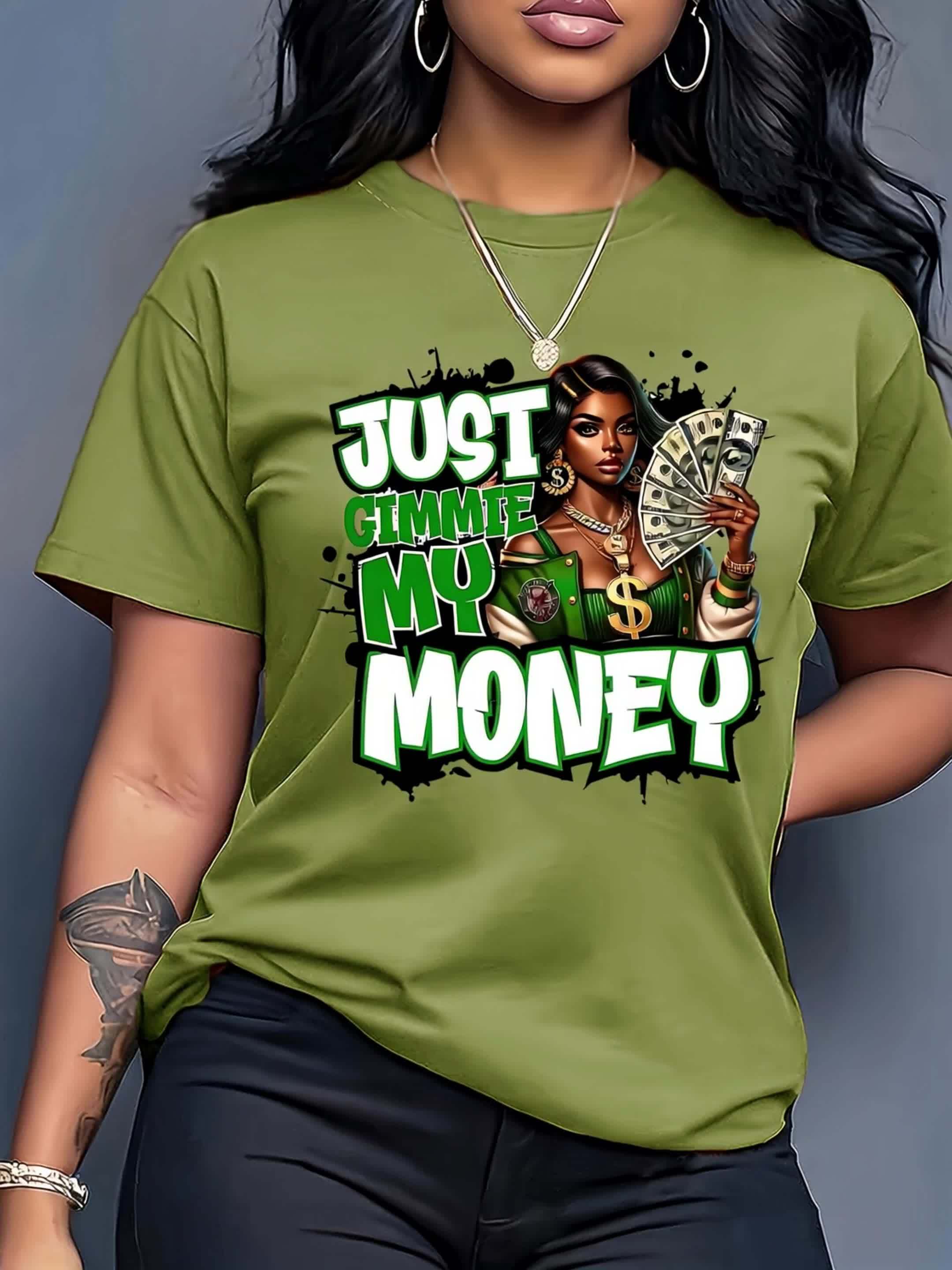 This women's graphic tee showcases a traditional crew neck and is made from 100% polyester knit fabric with moderate stretch, providing a comfortable and flexible fit. The eye-catching dollar bill graphic makes a bold statement for casual looks. Suitable for year-round wear, this t-shirt is machine washable, preserving its shape and graphic clarity after multiple washes. Produced in Guangdong, China, this durable yet stylish piece is a practical and fashionable choice for any collection.