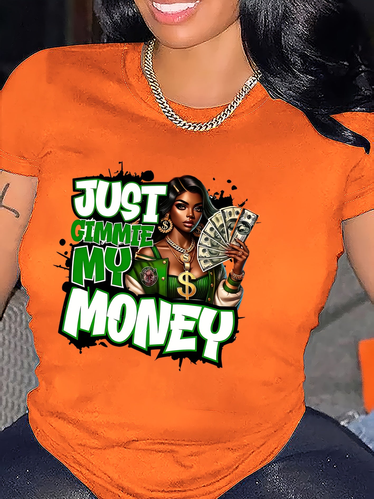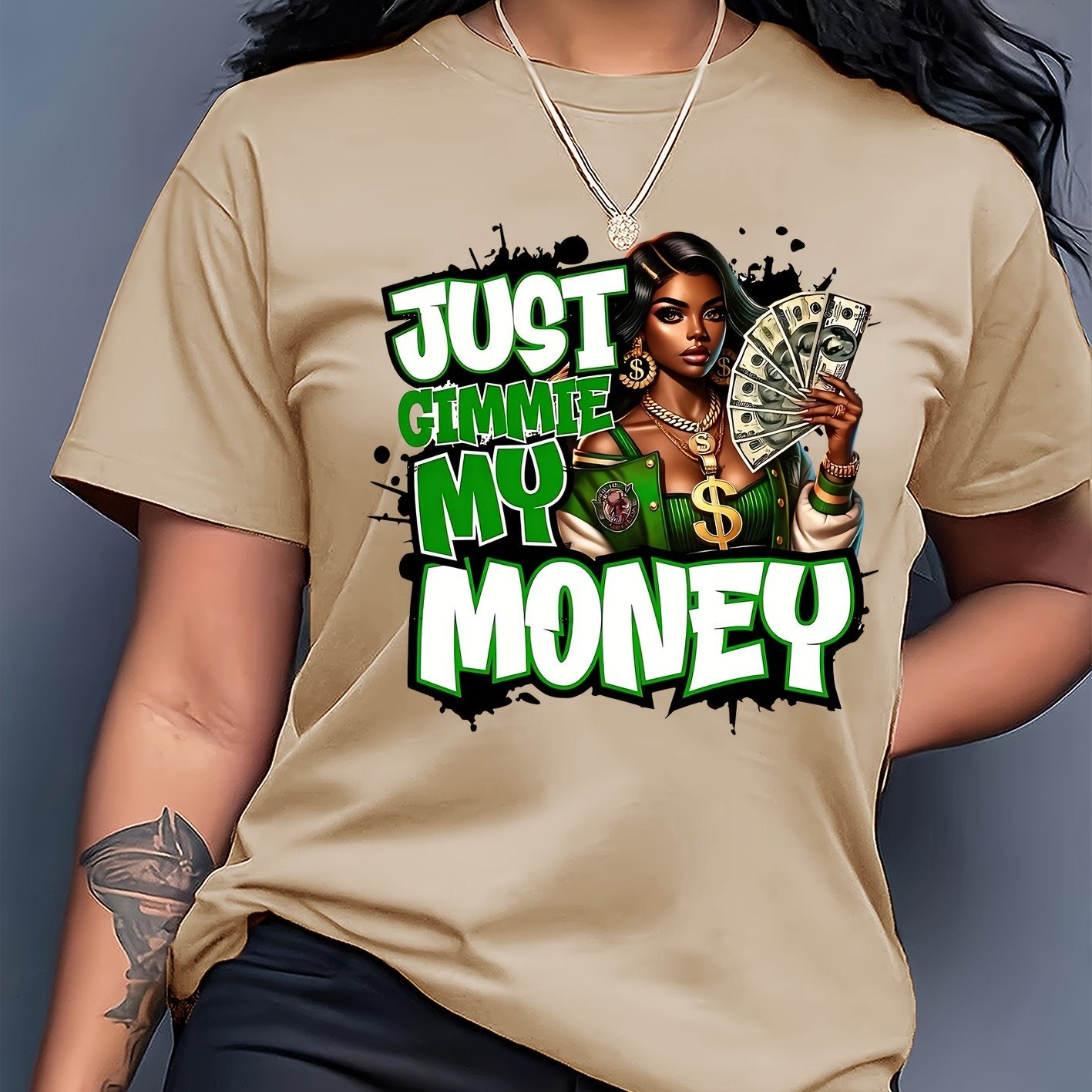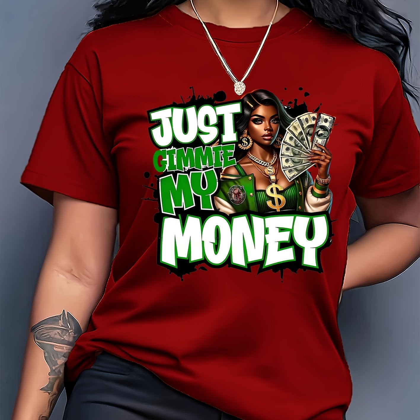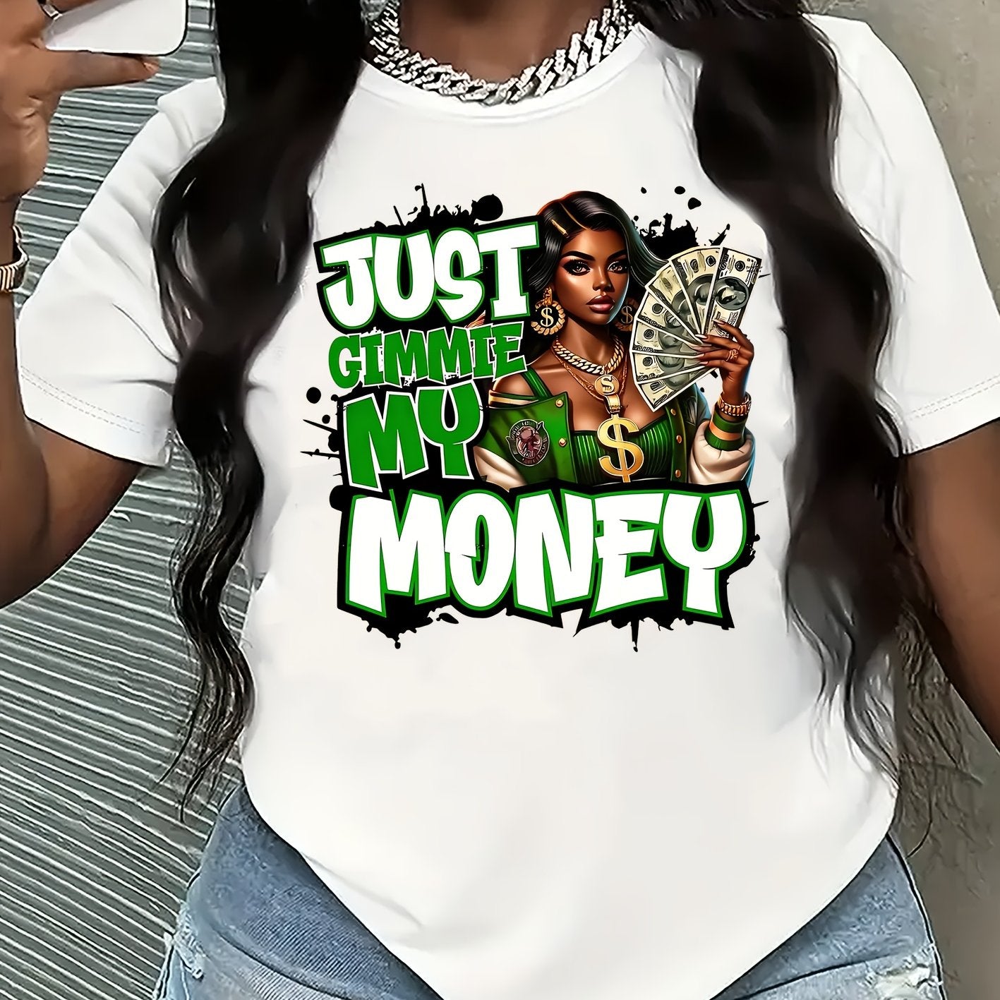 This women's graphic tee showcases a traditional crew neck and is made from 100% polyester knit fabric with moderate stretch, providing a comfortable and flexible fit. The eye-catching dollar bill graphic makes a bold statement for casual looks. Suitable for year-round wear, this t-shirt is machine washable, preserving its shape and graphic clarity after multiple washes. Produced in Guangdong, China, this durable yet stylish piece is a practical and fashionable choice for any collection.