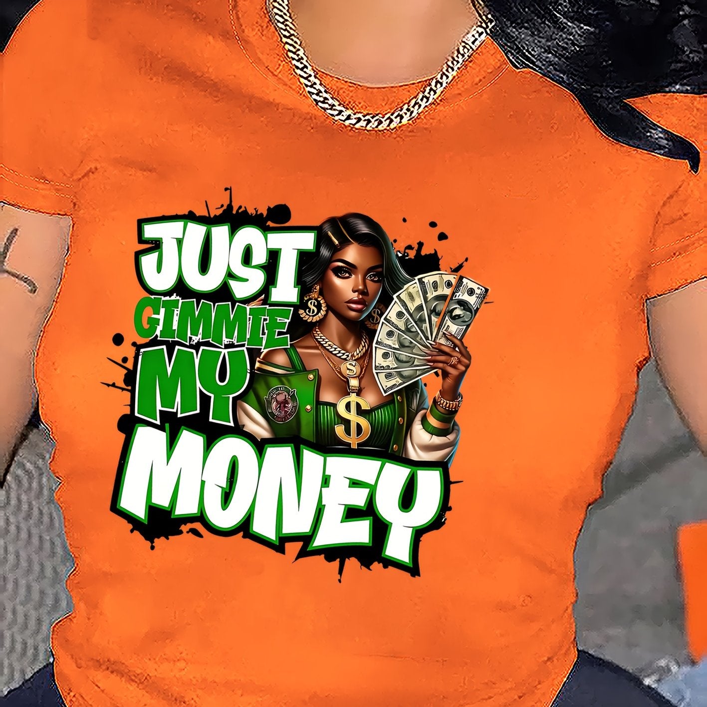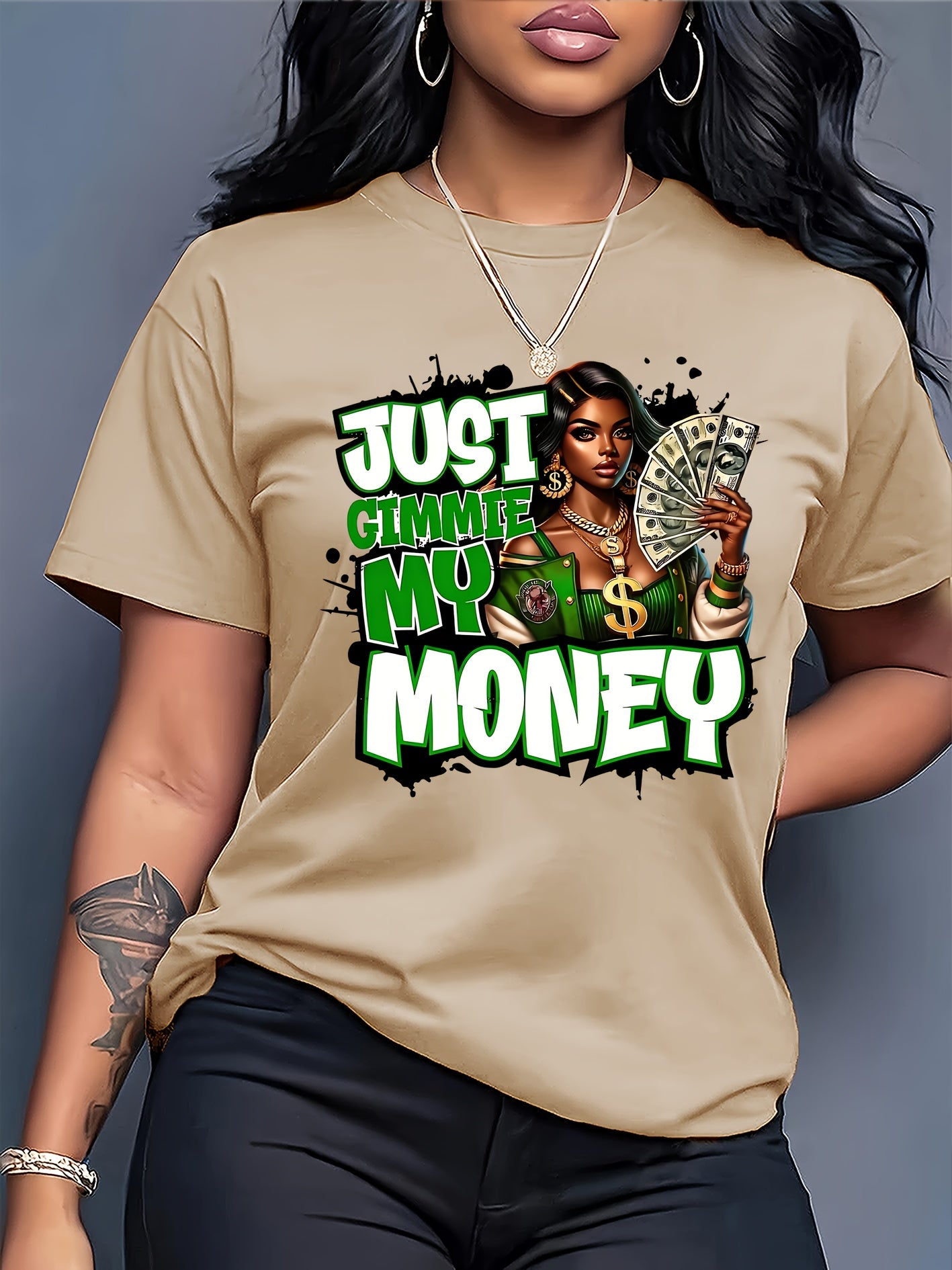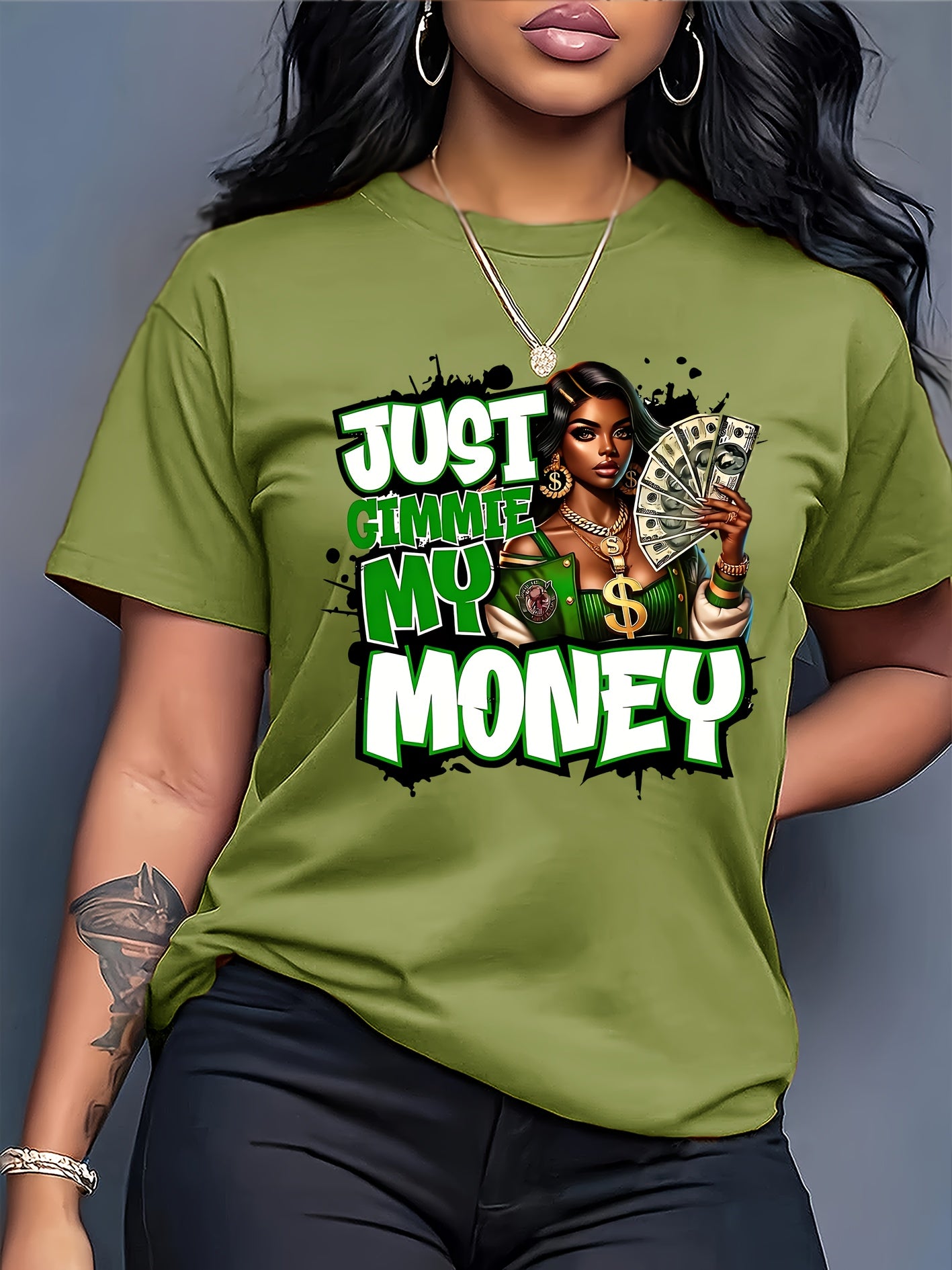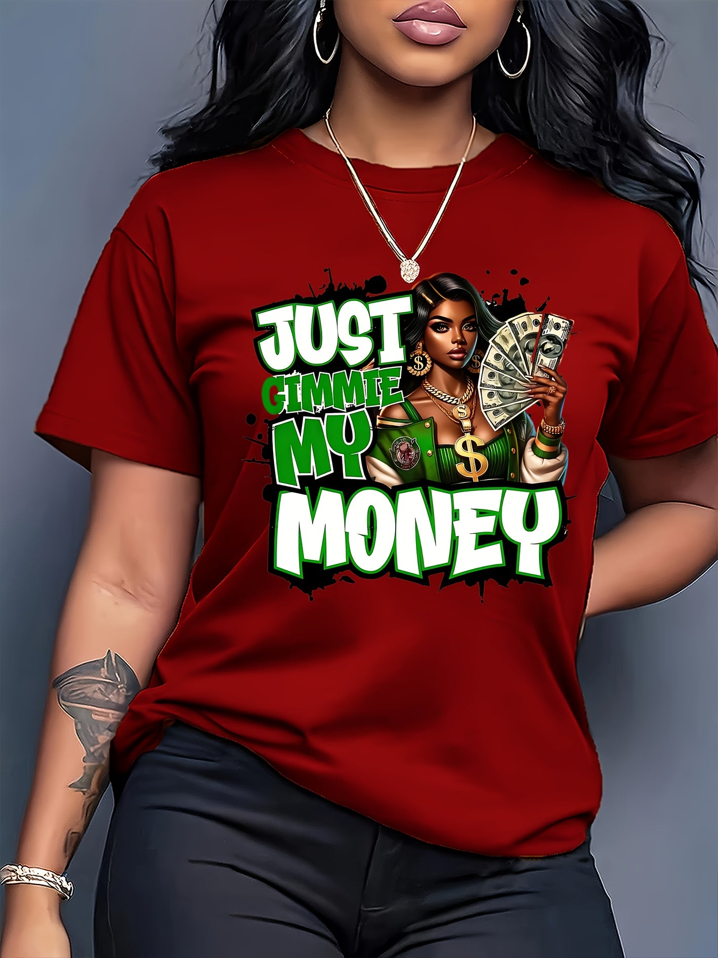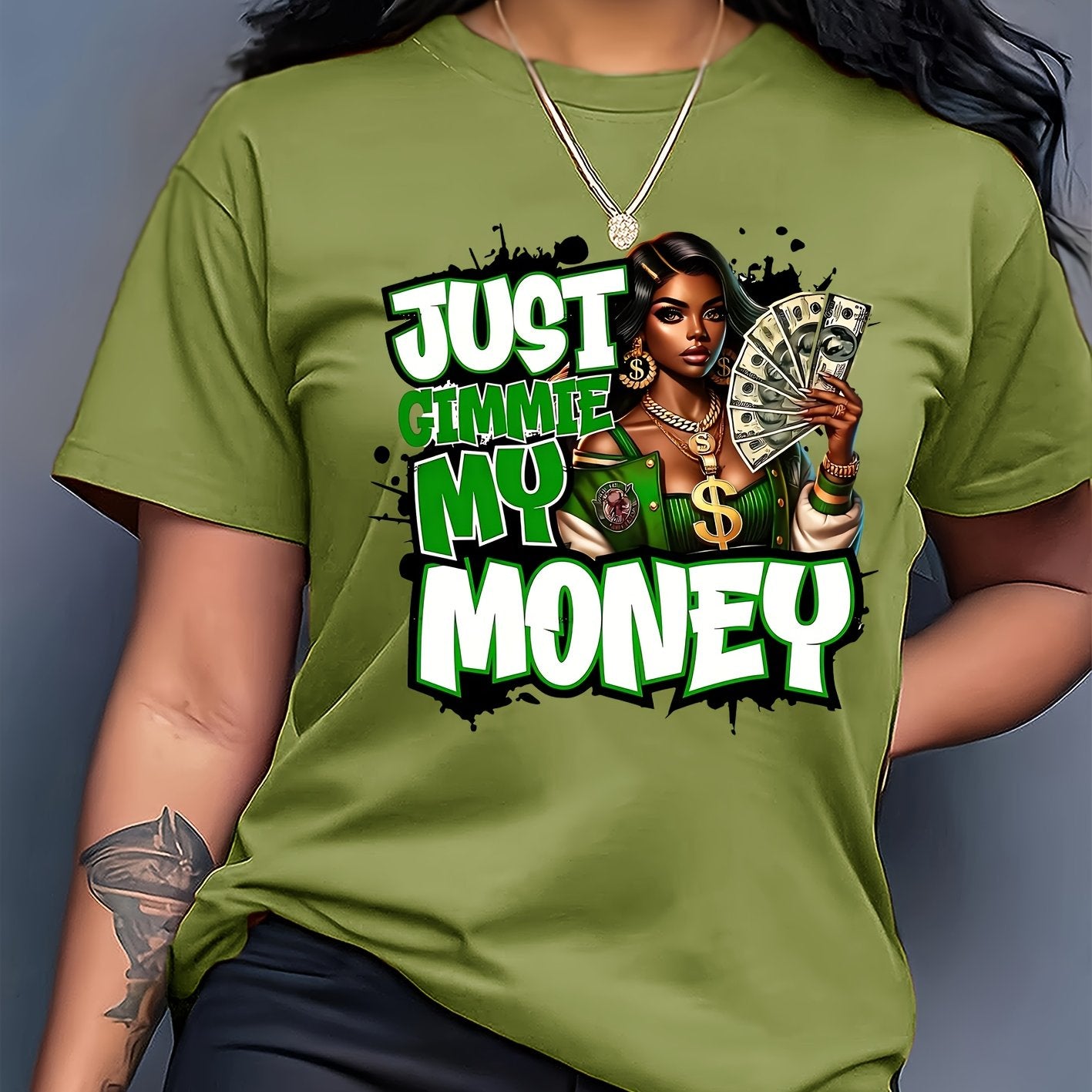 This women's graphic tee showcases a traditional crew neck and is made from 100% polyester knit fabric with moderate stretch, providing a comfortable and flexible fit. The eye-catching dollar bill graphic makes a bold statement for casual looks. Suitable for year-round wear, this t-shirt is machine washable, preserving its shape and graphic clarity after multiple washes. Produced in Guangdong, China, this durable yet stylish piece is a practical and fashionable choice for any collection.