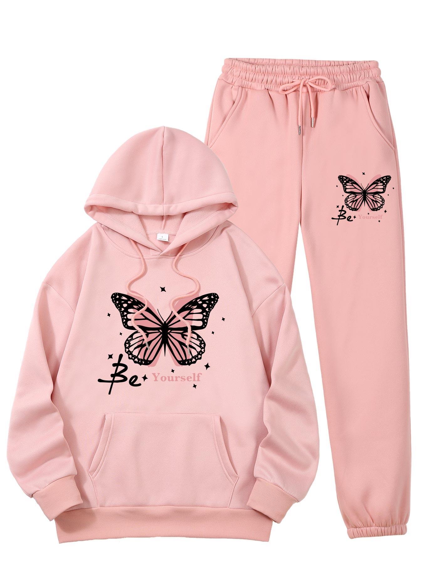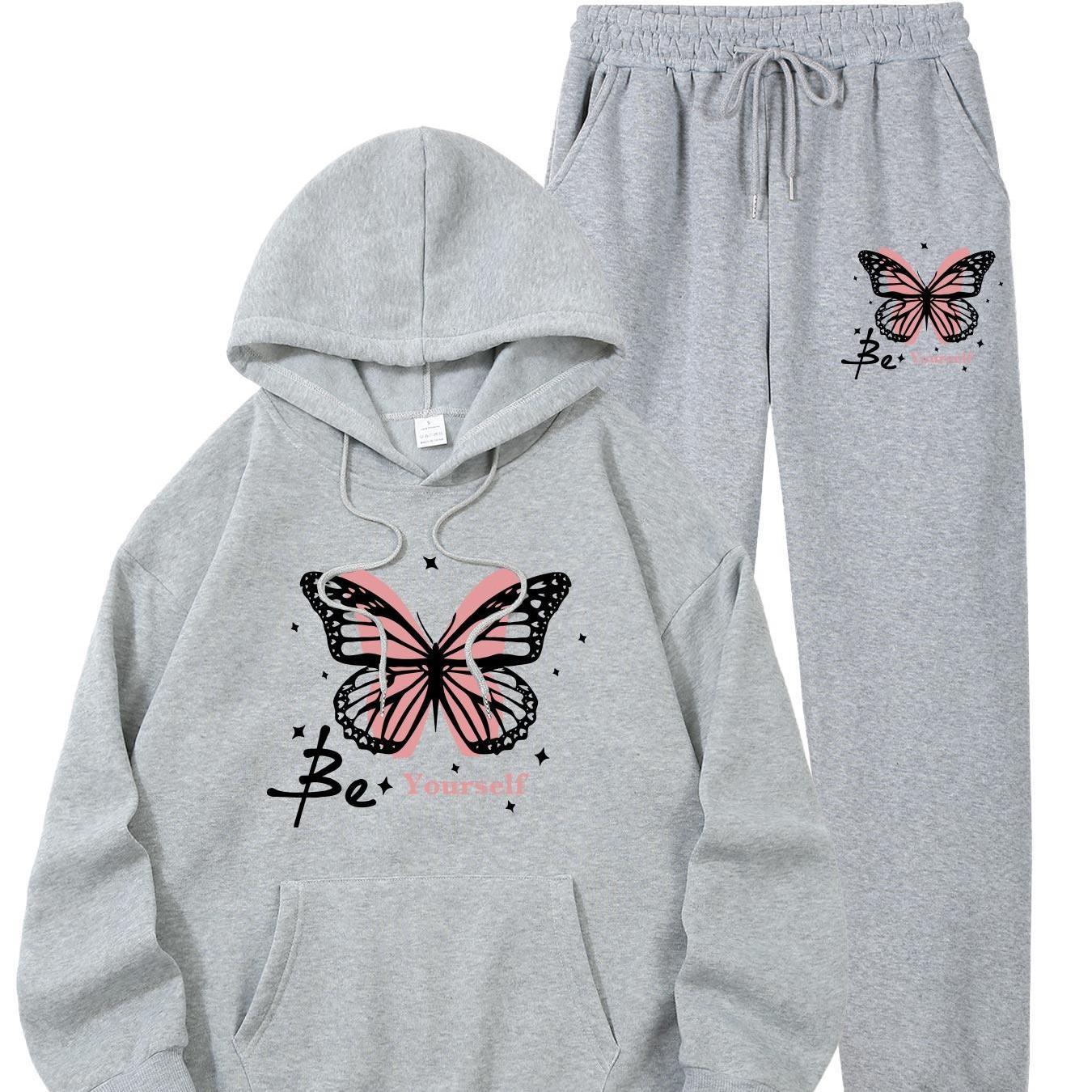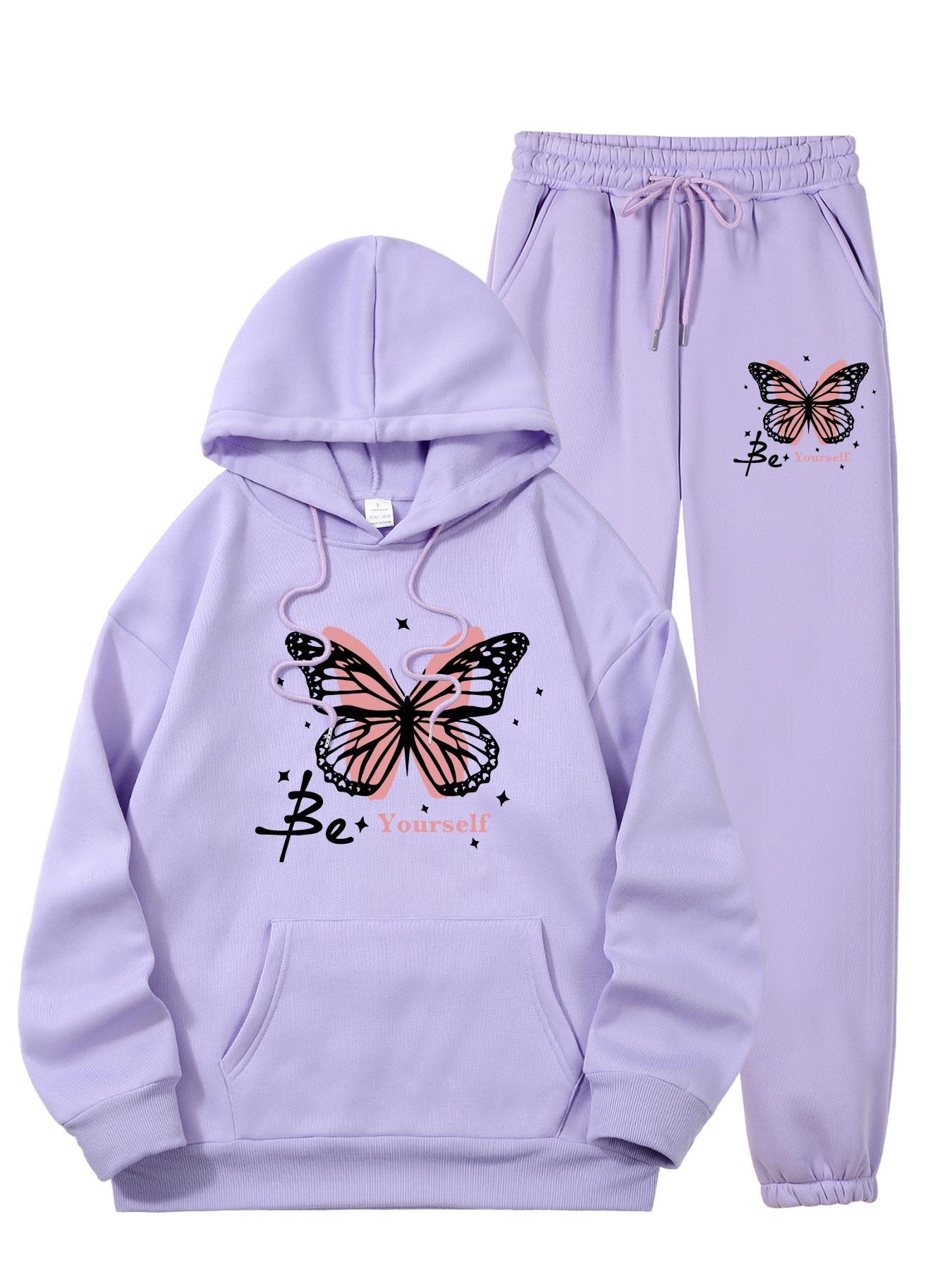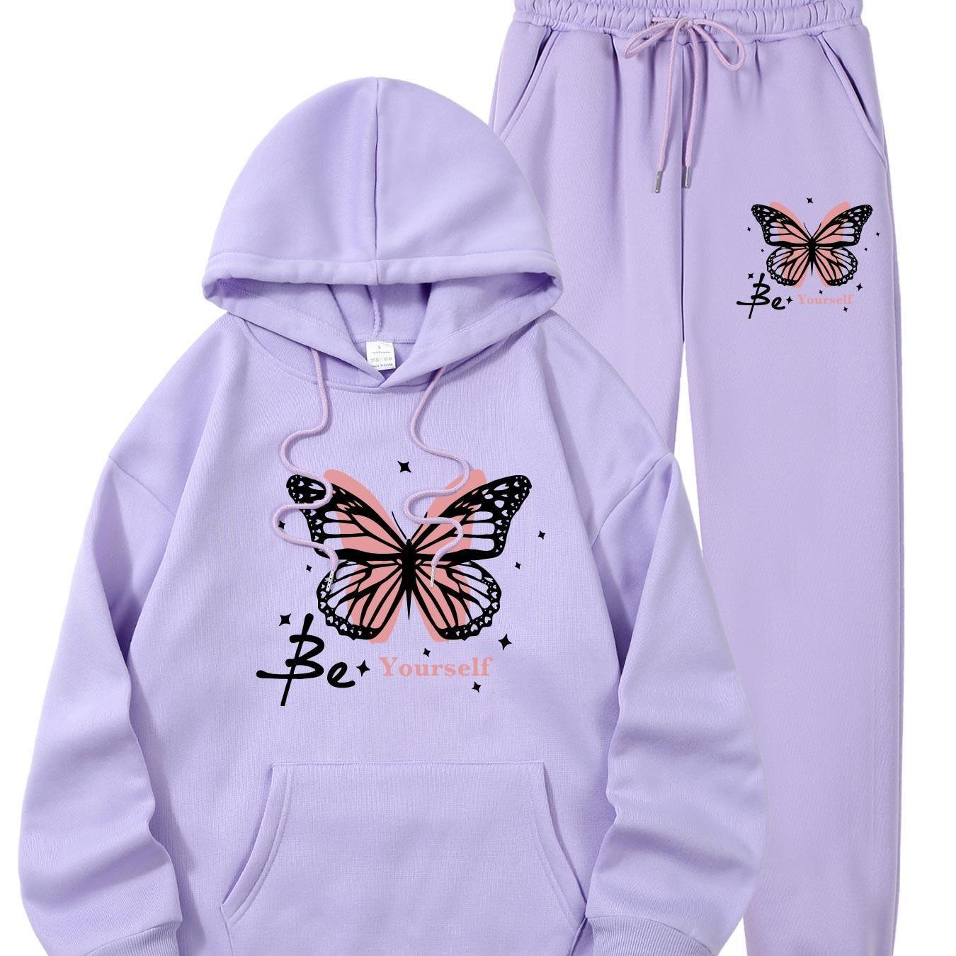 This casual loungewear set for women features a long sleeve hoodie with a practical pocket and coordinating joggers, ideal for all-season wear. Made from 100% polyester knit fabric with micro elasticity, it delivers gentle stretch while preserving softness and shape. The crew neck design paired with a butterfly positioning print offers understated elegance, suitable for lounging at home or casual outings. Machine washable for easy care, this lightweight and breathable set combines comfort with style. Produced in Guangdong, China, it ensures a versatile and flattering fit year-round.