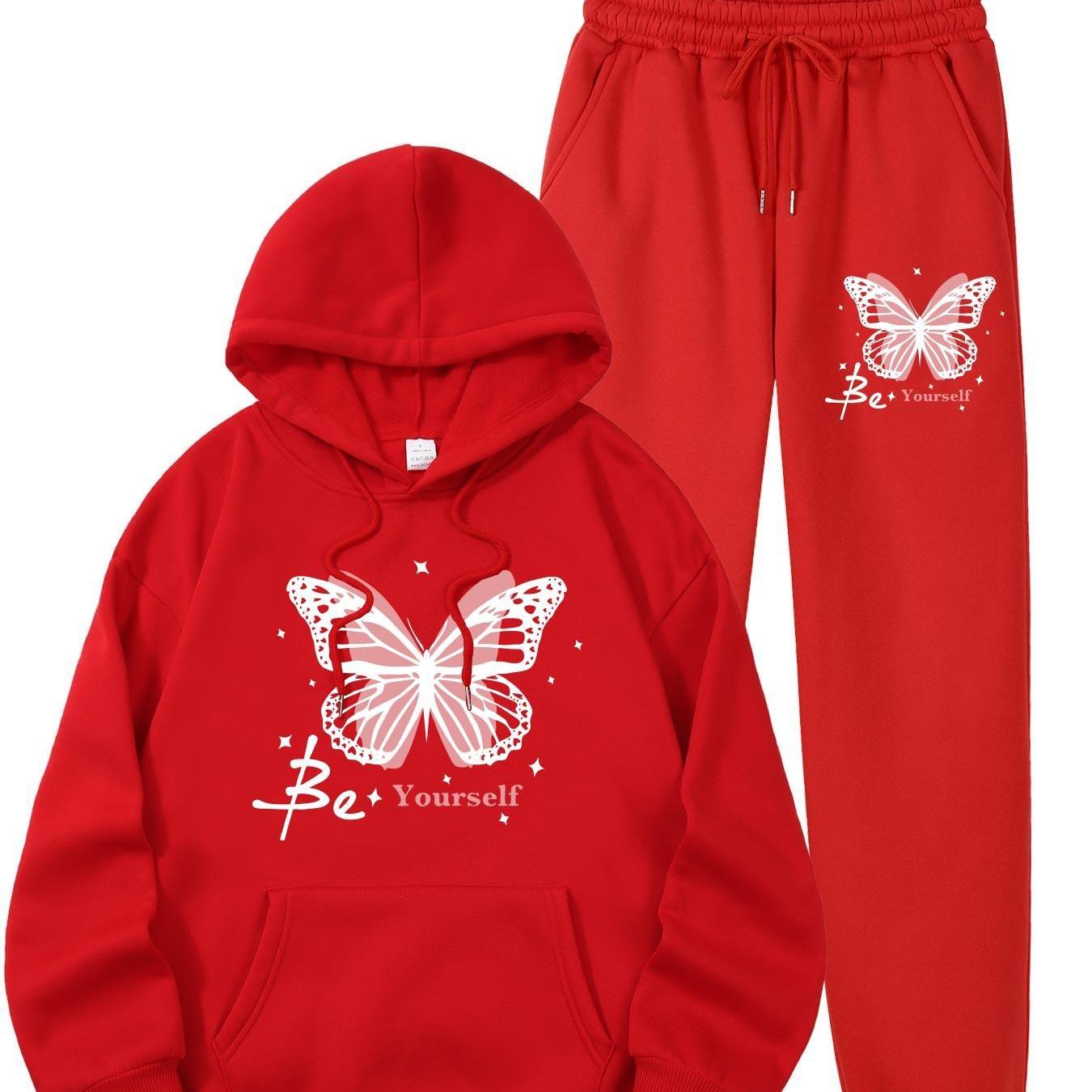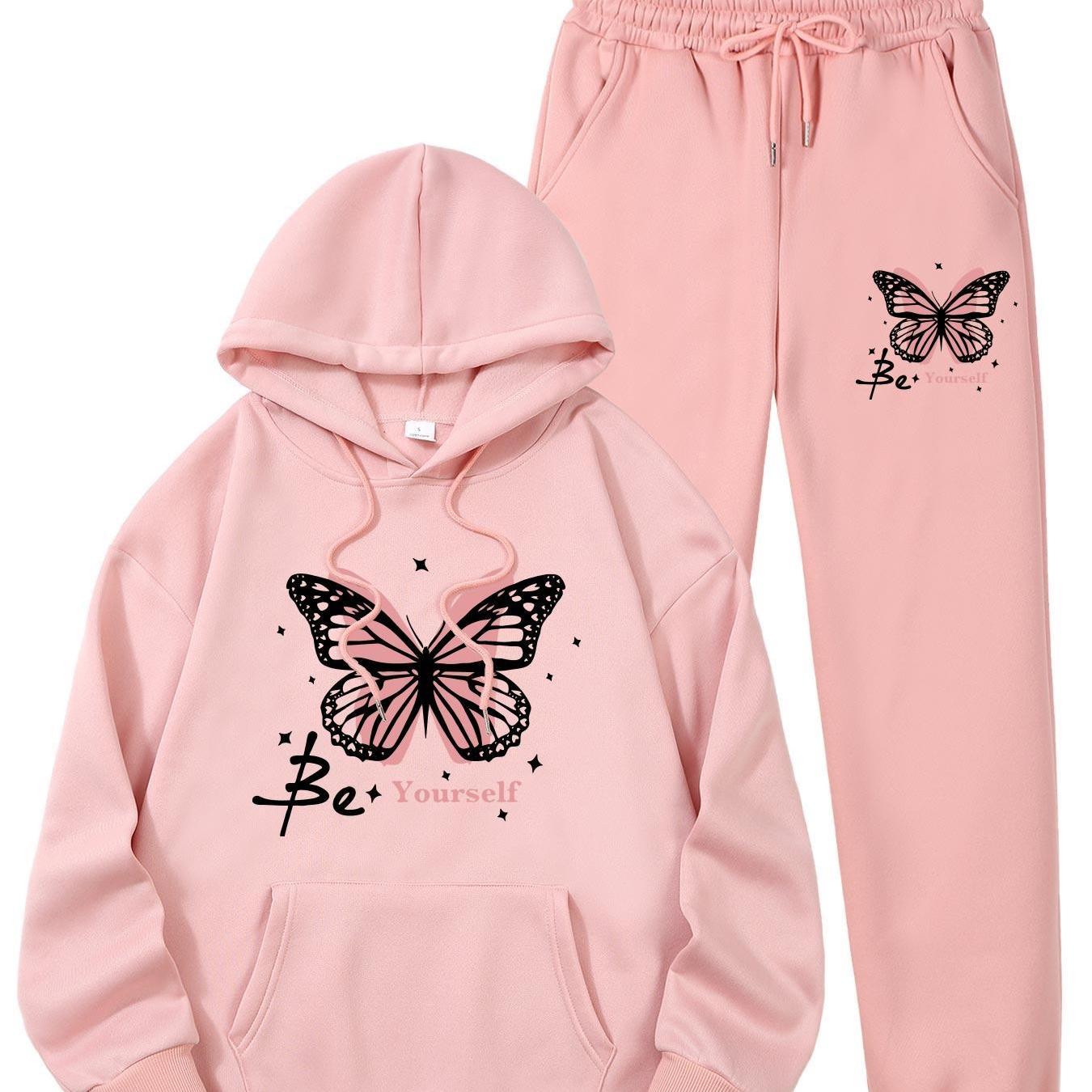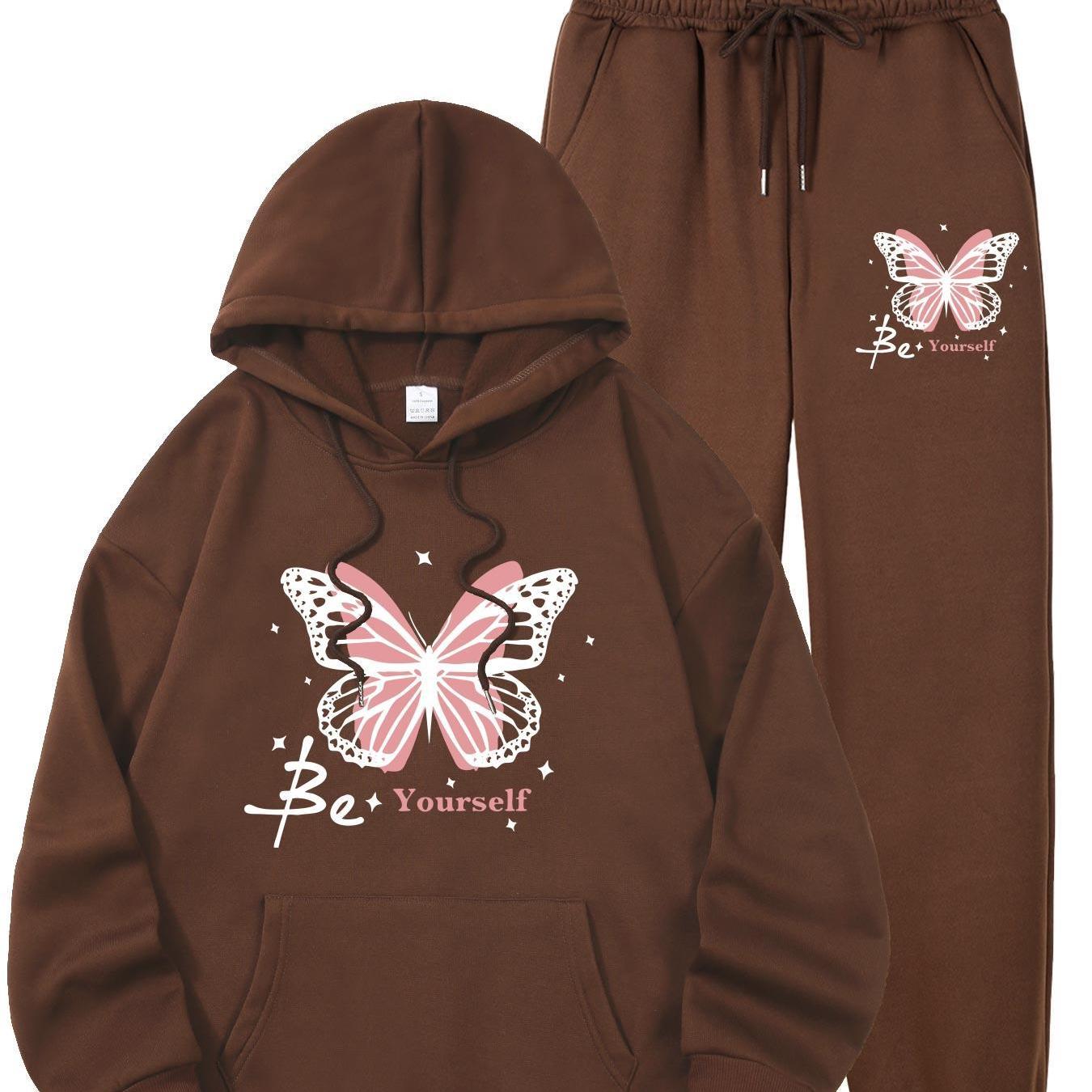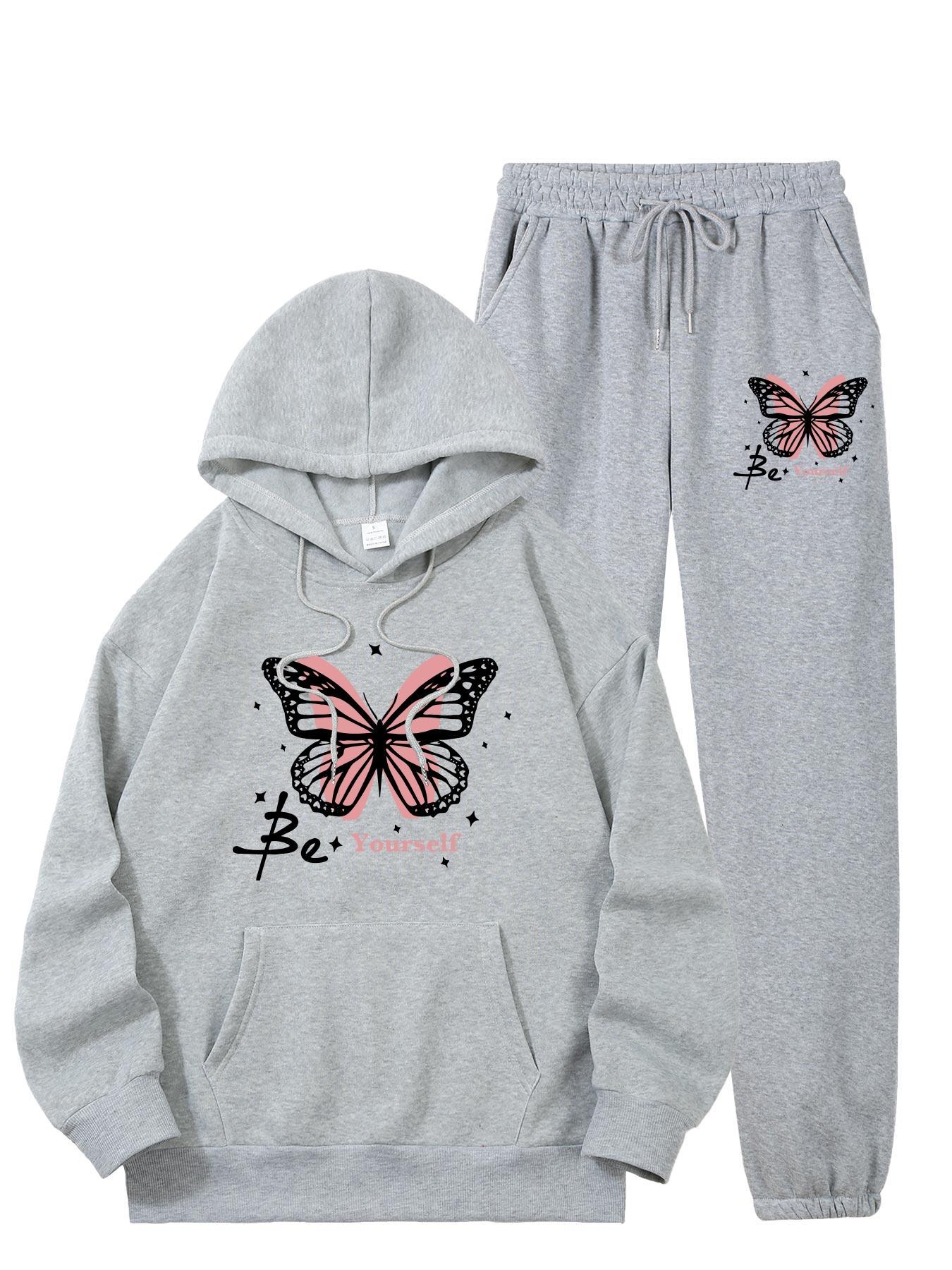 This casual loungewear set for women features a long sleeve hoodie with a practical pocket and coordinating joggers, ideal for all-season wear. Made from 100% polyester knit fabric with micro elasticity, it delivers gentle stretch while preserving softness and shape. The crew neck design paired with a butterfly positioning print offers understated elegance, suitable for lounging at home or casual outings. Machine washable for easy care, this lightweight and breathable set combines comfort with style. Produced in Guangdong, China, it ensures a versatile and flattering fit year-round.
