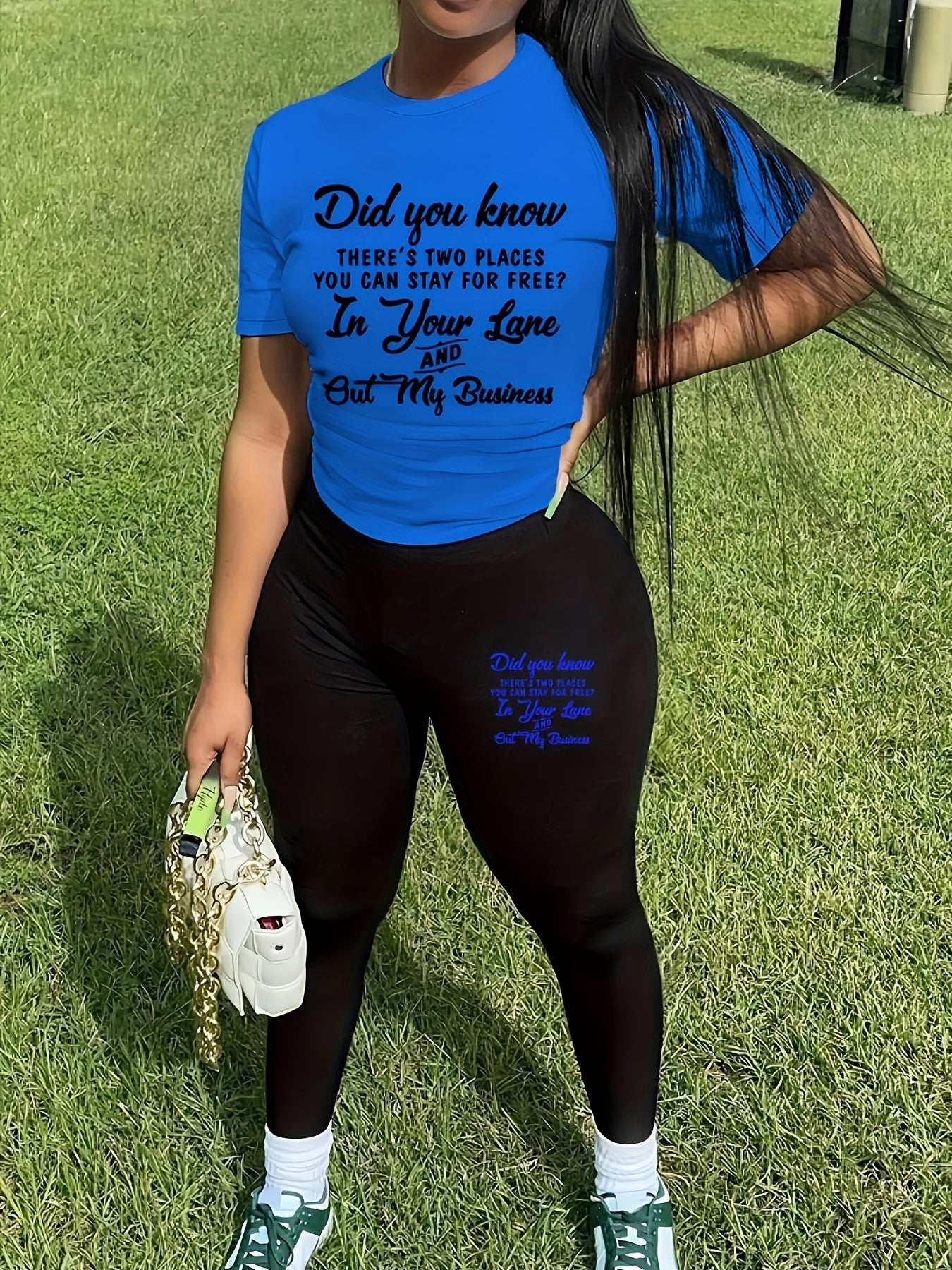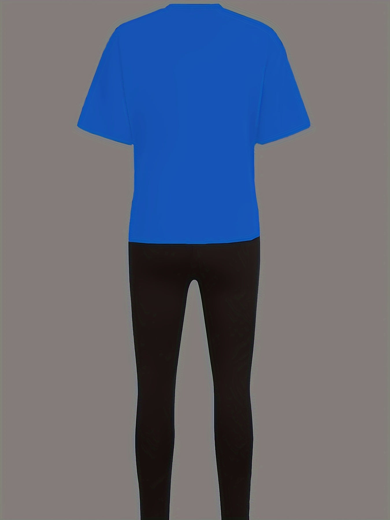 The Women’s Casual Two-Piece Set features a blue crew neck graphic tee adorned with "Did You Know" alphabet-themed positioning prints, paired with fitted black leggings. Both items are made from a medium-stretch knit fabric of 92% polyester and 8% elastane, providing optimal stretch for ease and comfort. Suitable for all seasons, this breathable and durable set is ideal for casual wear or lounging. It is easy to care for, compatible with machine washing or professional dry cleaning. Manufactured in Fujian, China, this set blends practicality with a contemporary casual style.