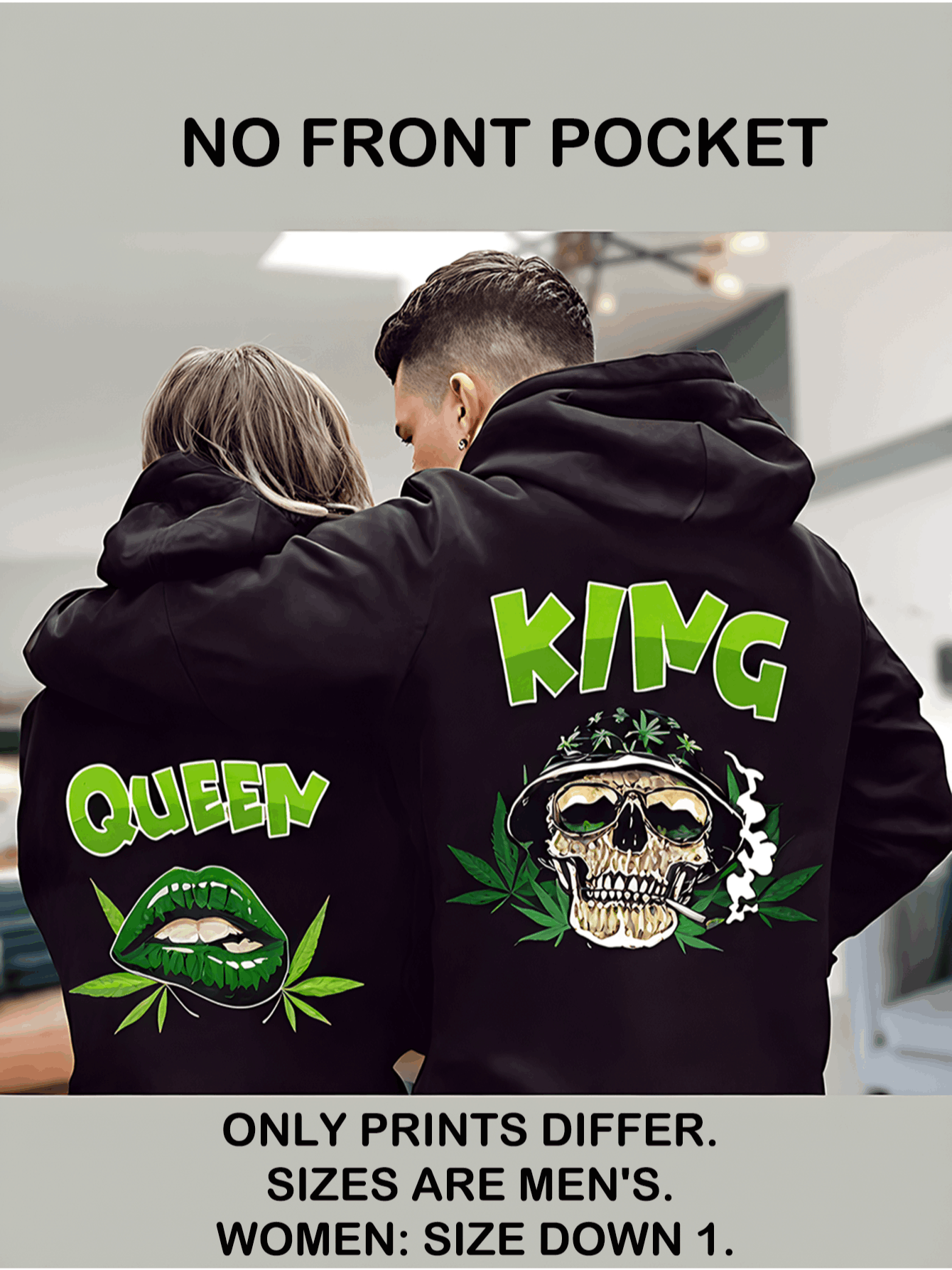These men's hooded sweatshirts offer a comfortable, regular fit with a classic crew neck design, crafted from a 50% cotton and 50% polyester blend for durability and softness. Featuring a lightweight, slightly stretchy knit fabric weighing 320 grams, they ensure ease of movement and all-day comfort. The sweatshirts are machine washable for easy care, with heat transfer printing on the back showcasing a striking “KING & QUEEN” design, perfect for couples wanting coordinated style. With long sleeves and solid colors, they serve as versatile basics suitable for everyday wear. Made in Shandong, China.