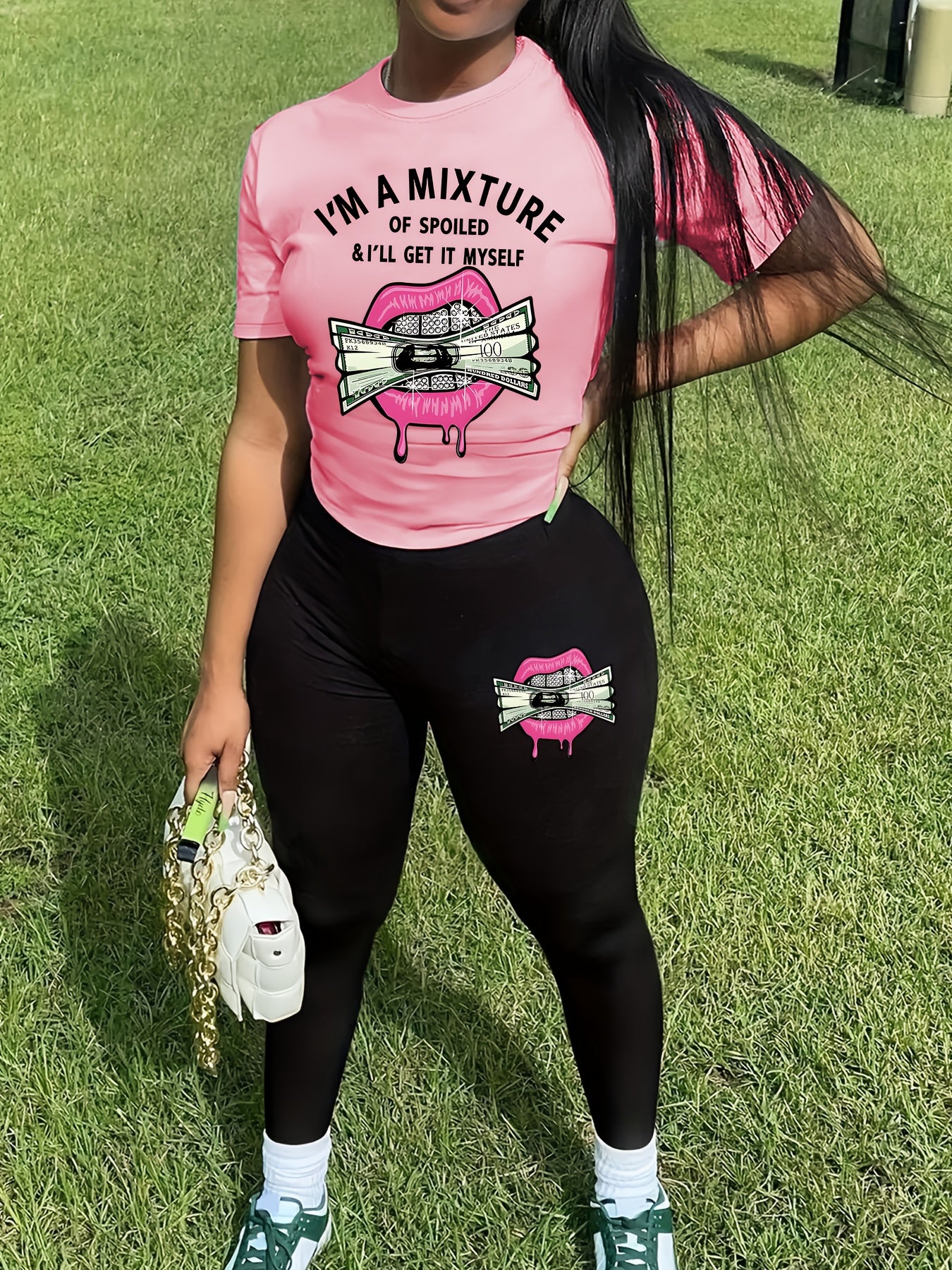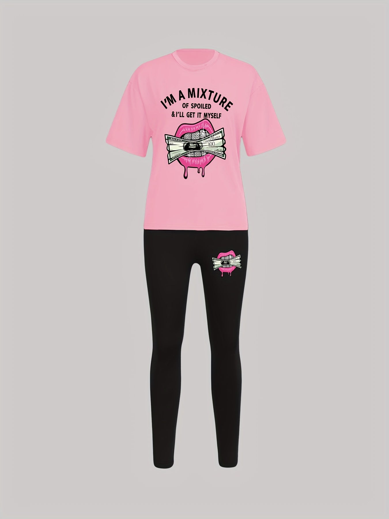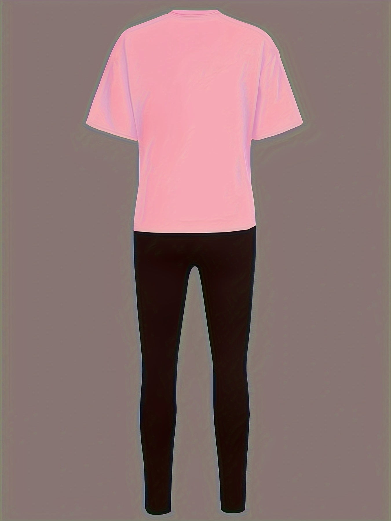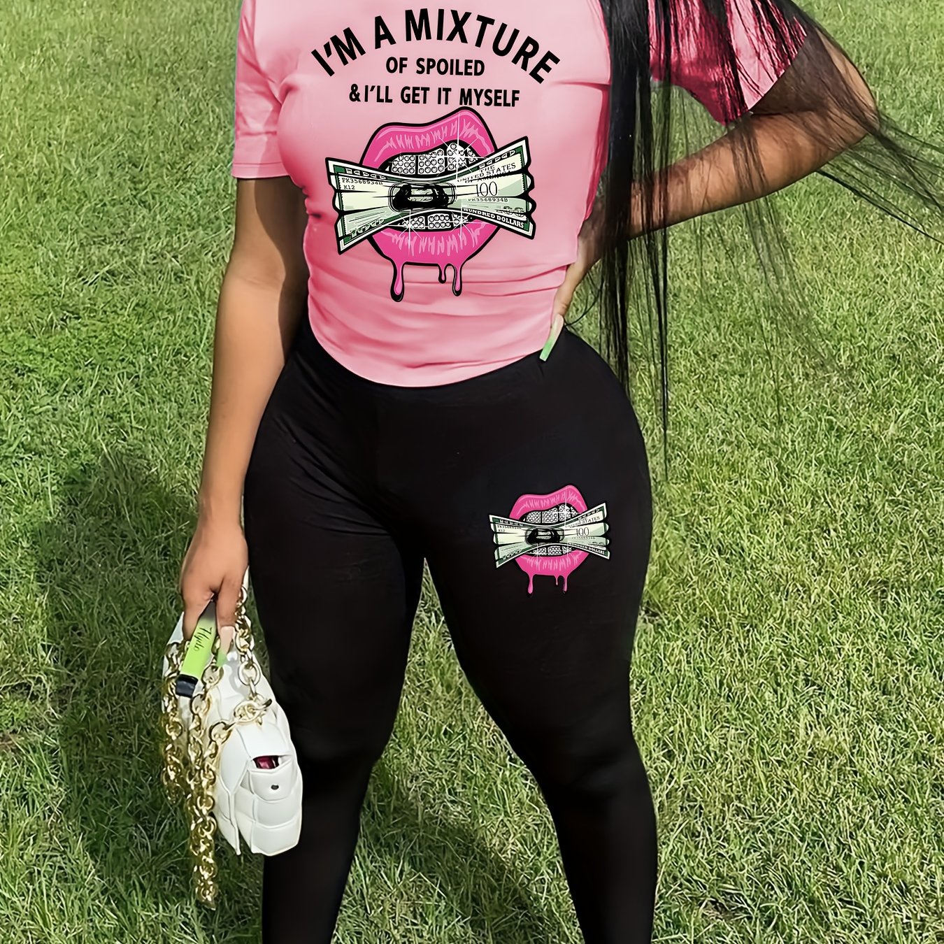 This stylish Alphabet Print Pants Set for women is made from a soft polyester-knit blend containing 92% polyester and 8% elastane, providing moderate stretch for comfort and a flattering silhouette. The set includes a casual round neck short sleeve top and matching long pants, both featuring a distinctive alphabet print applied through precise positioning printing. Suitable for year-round casual wear, the knit fabric offers durability without being sheer. Easy to maintain with machine washing or professional dry cleaning, this set from Fujian, China delivers a blend of comfort and contemporary elegance, perfect as a thoughtful gift for the fashion-conscious woman.