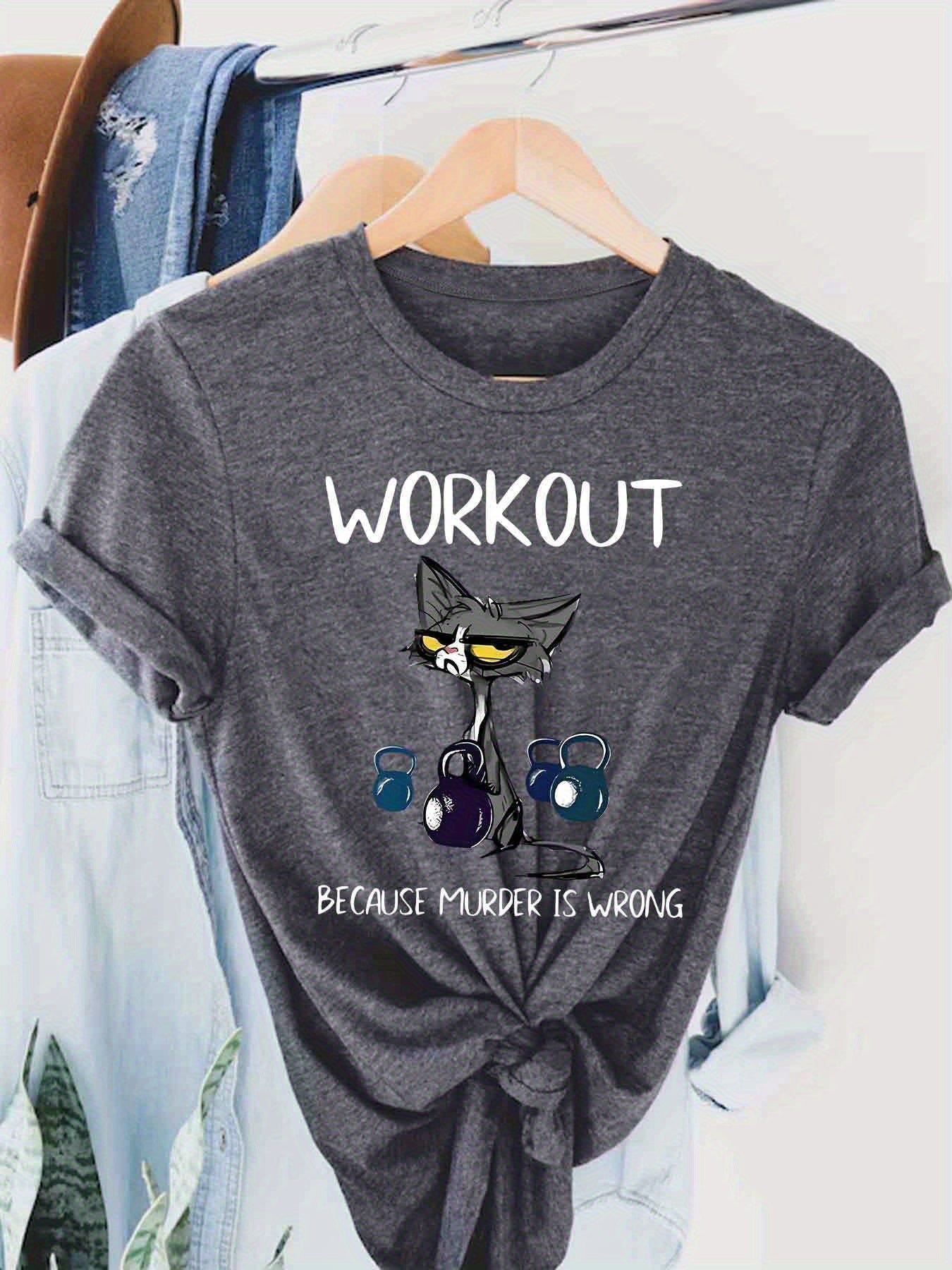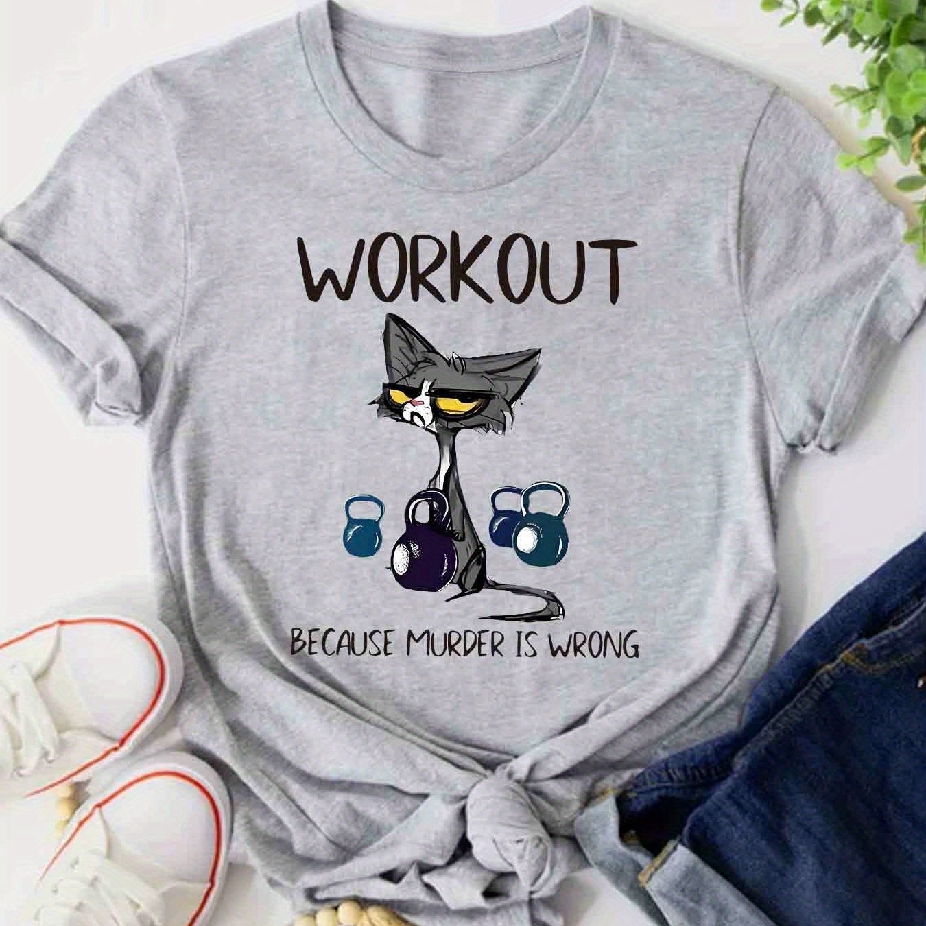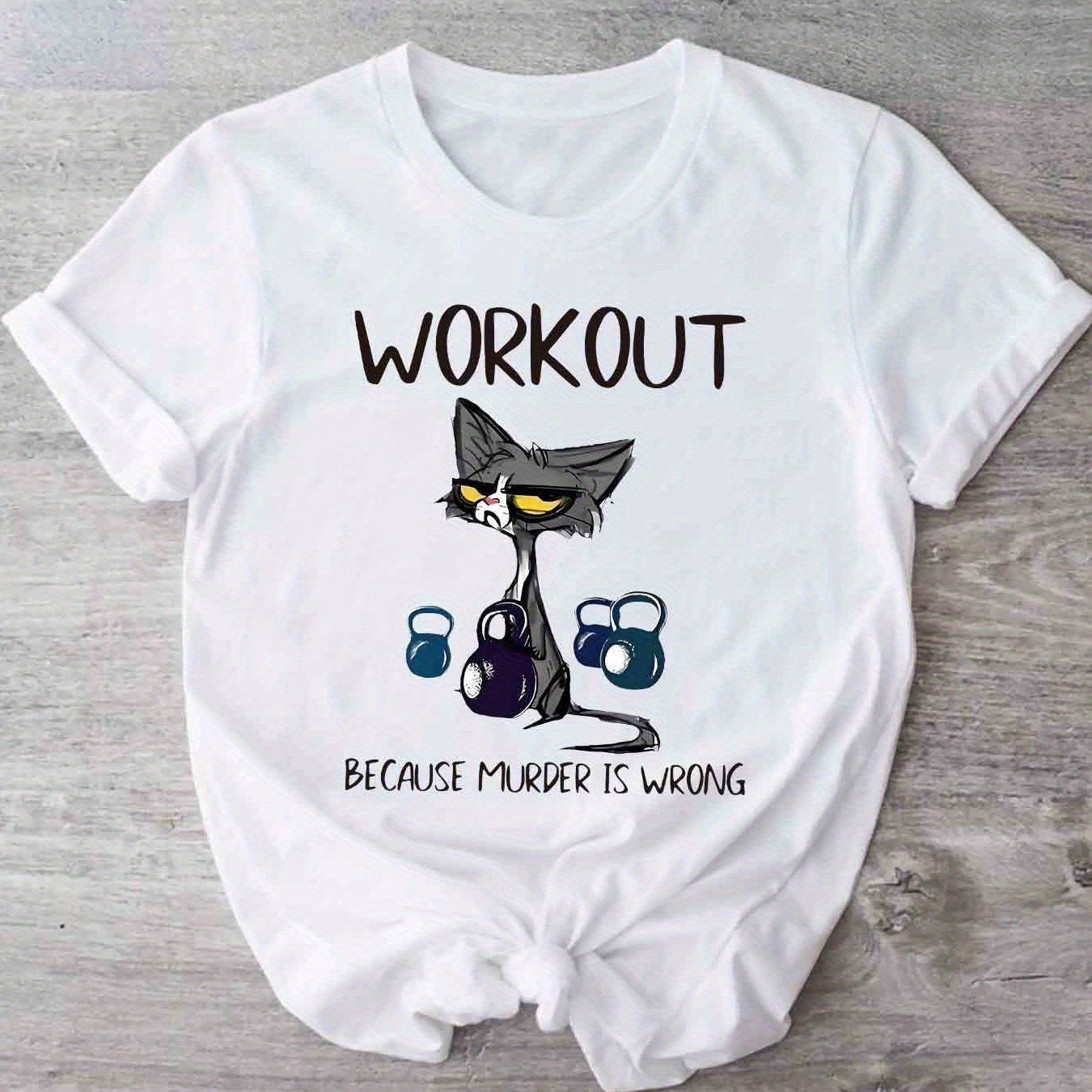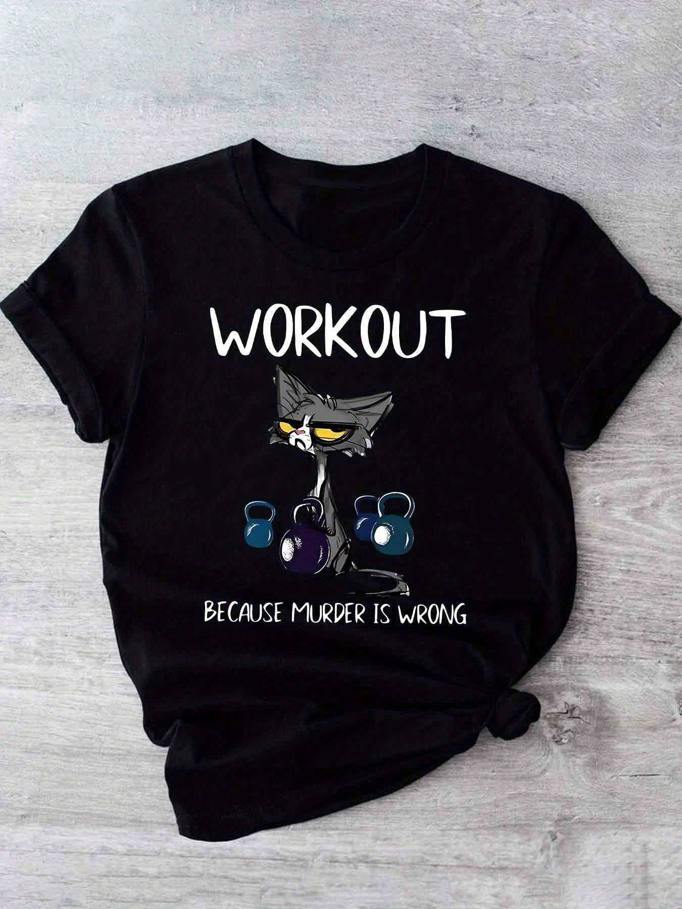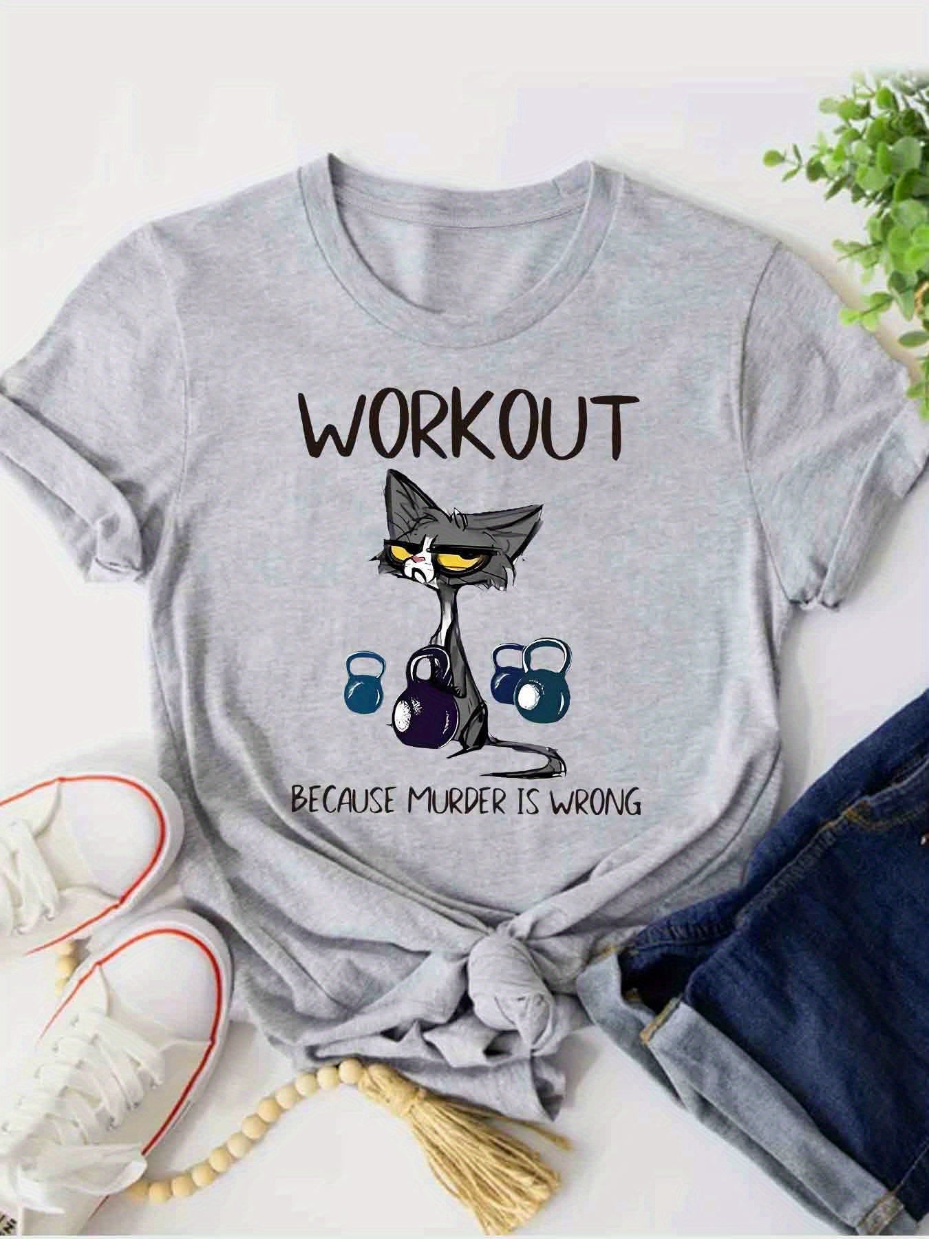 This women's casual short sleeve T-shirt uniquely combines humor and functionality with its distinctive cat and dumbbell graphic paired with the clever slogan, "Workout Because Murder Is Wrong." Constructed from 100% polyester with micro elasticity, it provides a comfortable and flexible fit that adapts to your movements during exercise or daily wear. Featuring a timeless crew neck and standard length, this shirt offers a flattering and adaptable look. The positioning print ensures the vivid design remains intact through multiple wears. Made from knit fabric in Guangdong, China, it is machine
