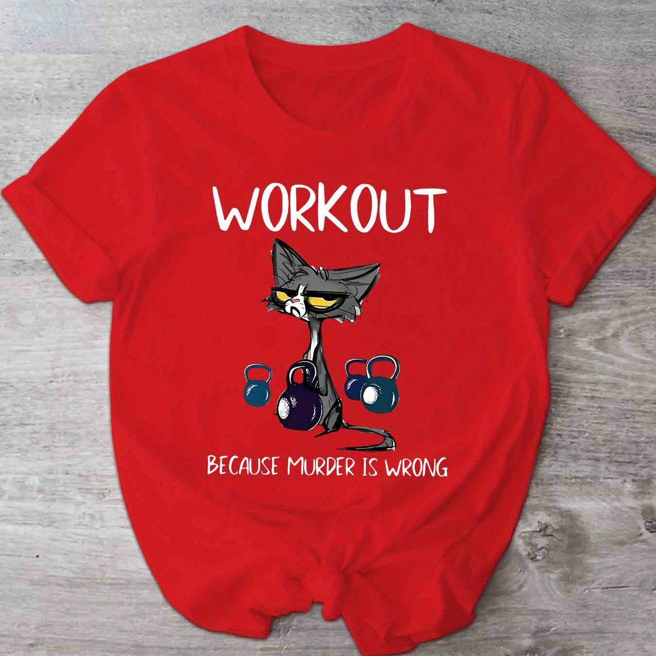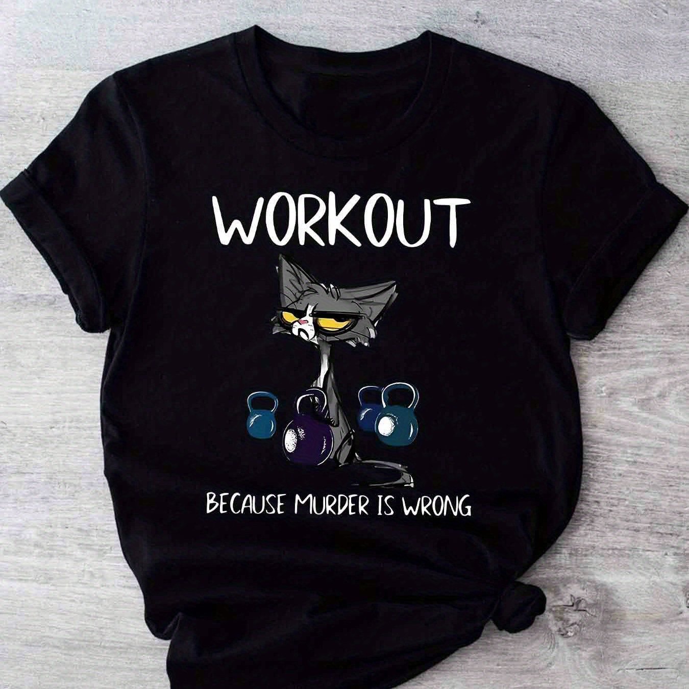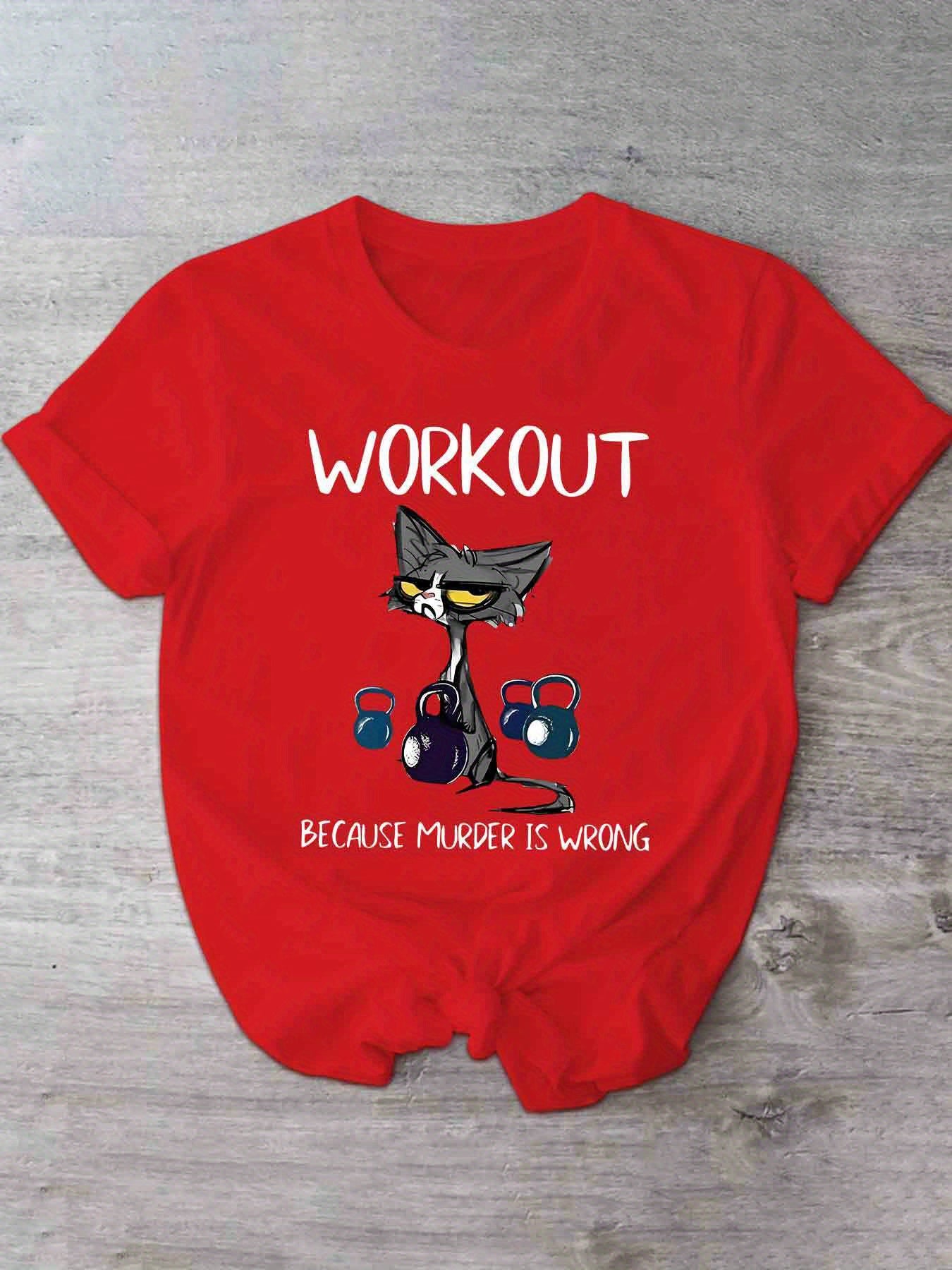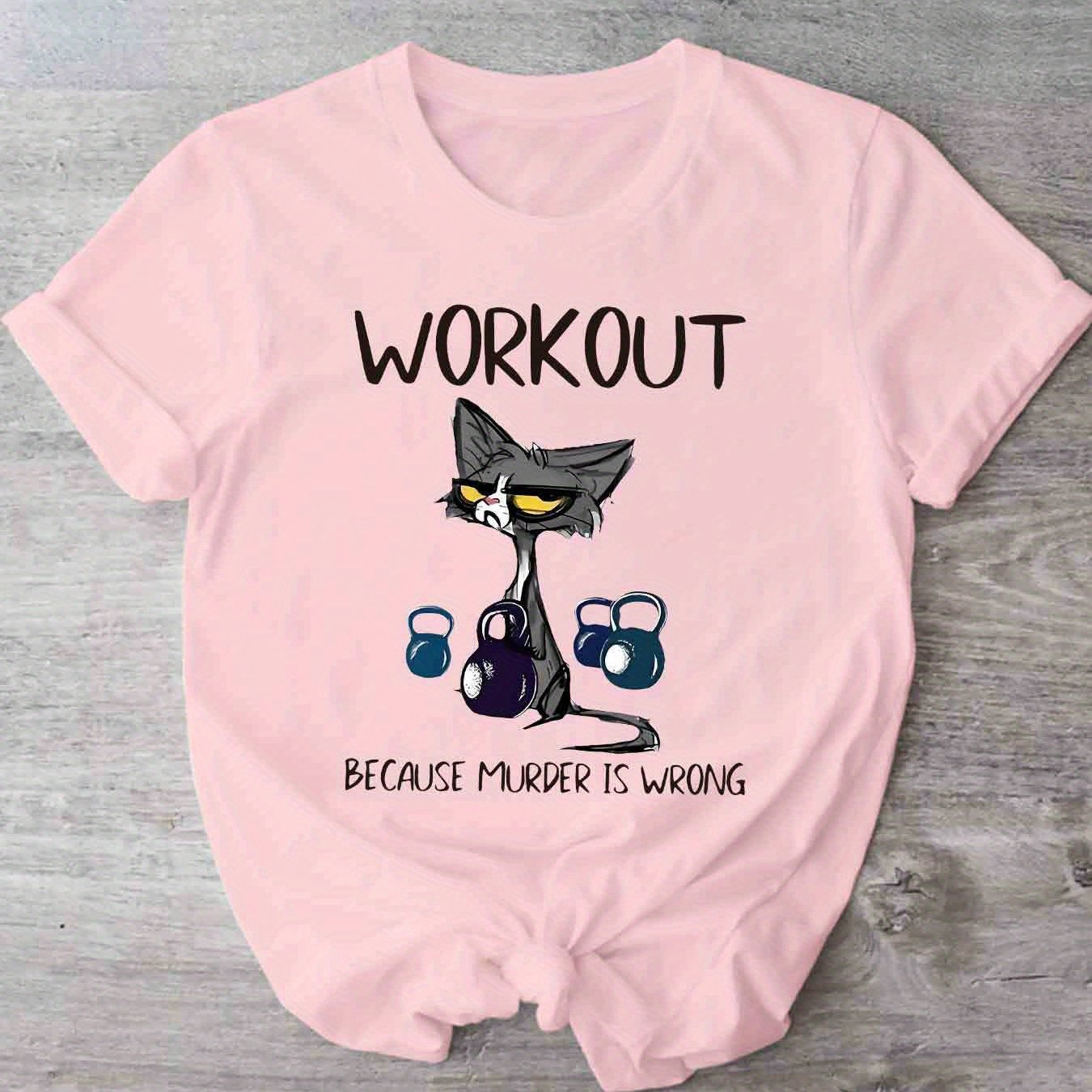 This women's casual short sleeve T-shirt uniquely combines humor and functionality with its distinctive cat and dumbbell graphic paired with the clever slogan, "Workout Because Murder Is Wrong." Constructed from 100% polyester with micro elasticity, it provides a comfortable and flexible fit that adapts to your movements during exercise or daily wear. Featuring a timeless crew neck and standard length, this shirt offers a flattering and adaptable look. The positioning print ensures the vivid design remains intact through multiple wears. Made from knit fabric in Guangdong, China, it is machine
