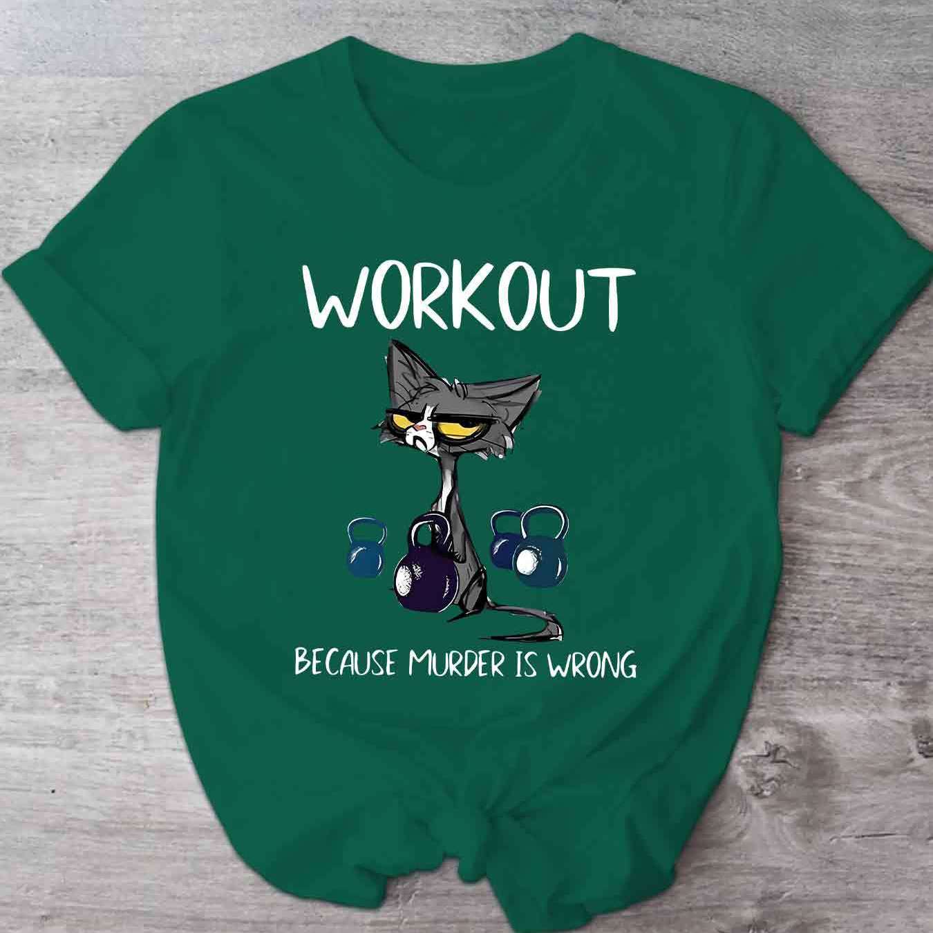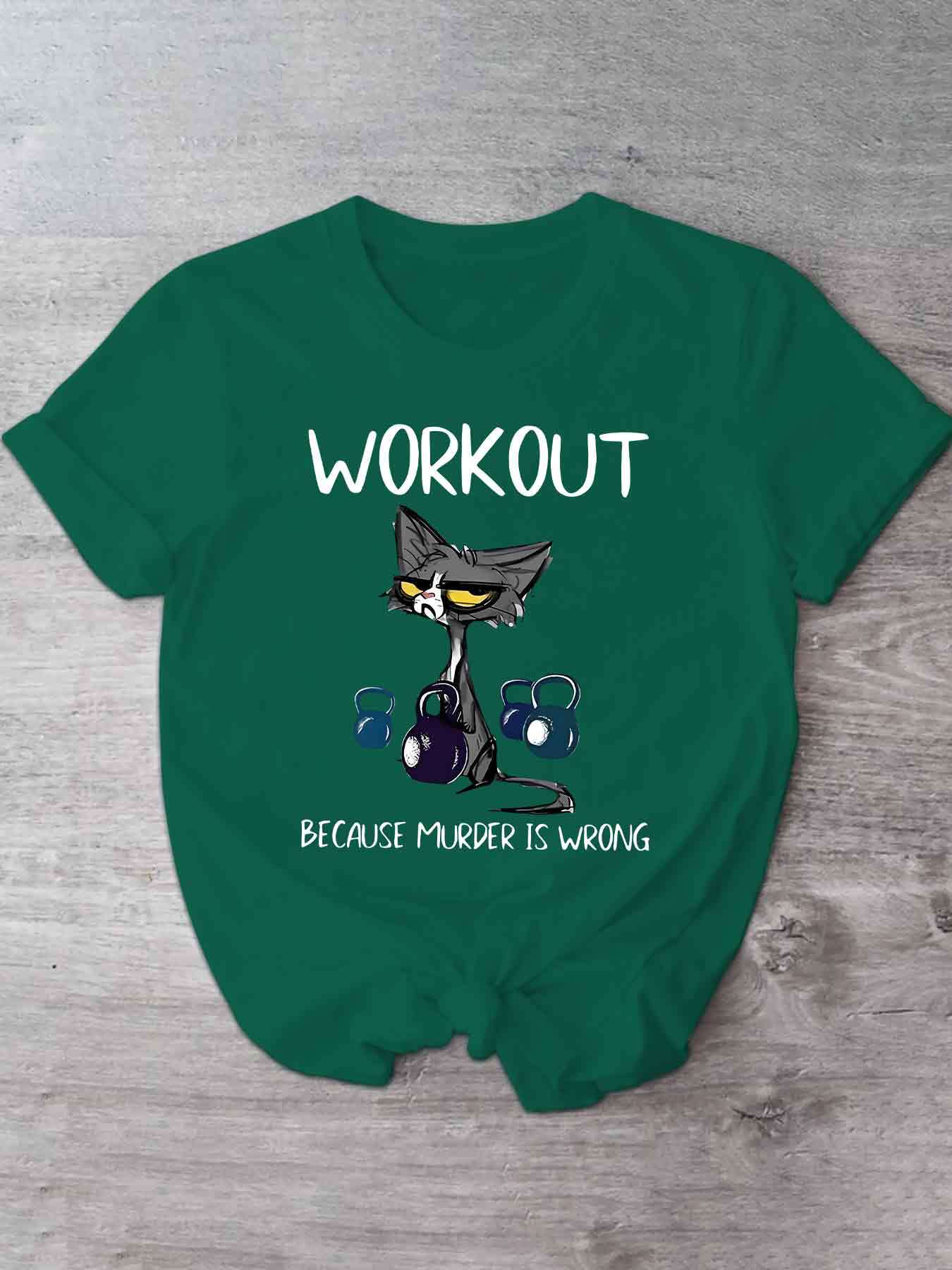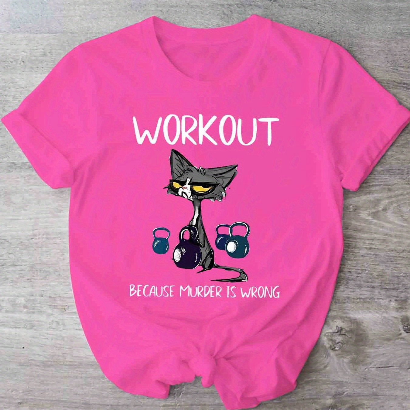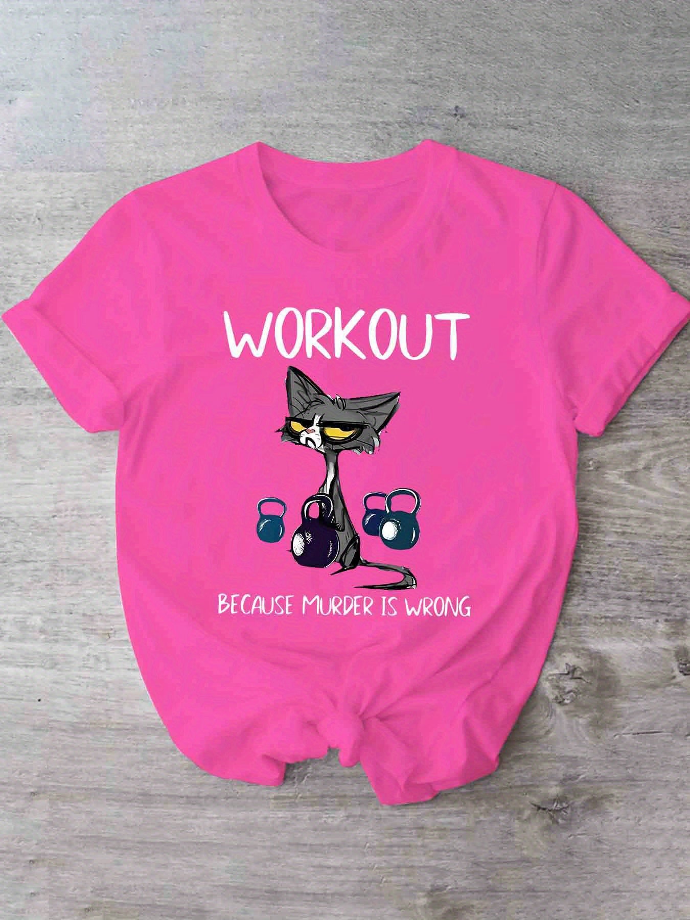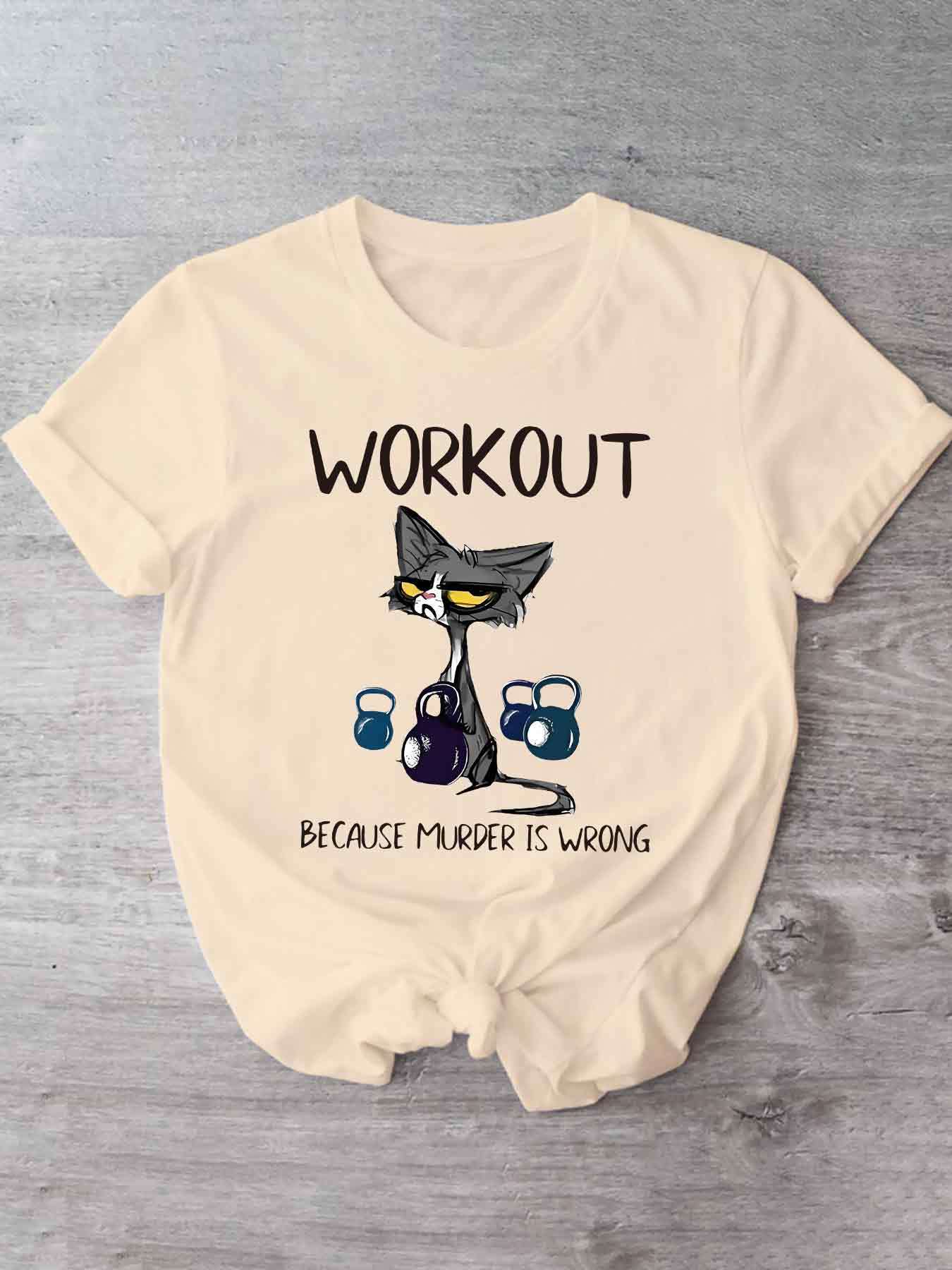 This women's casual short sleeve T-shirt uniquely combines humor and functionality with its distinctive cat and dumbbell graphic paired with the clever slogan, "Workout Because Murder Is Wrong." Constructed from 100% polyester with micro elasticity, it provides a comfortable and flexible fit that adapts to your movements during exercise or daily wear. Featuring a timeless crew neck and standard length, this shirt offers a flattering and adaptable look. The positioning print ensures the vivid design remains intact through multiple wears. Made from knit fabric in Guangdong, China, it is machine