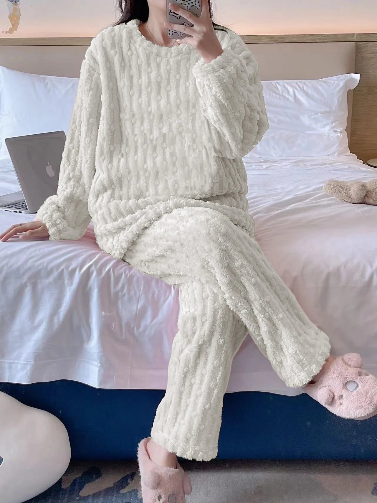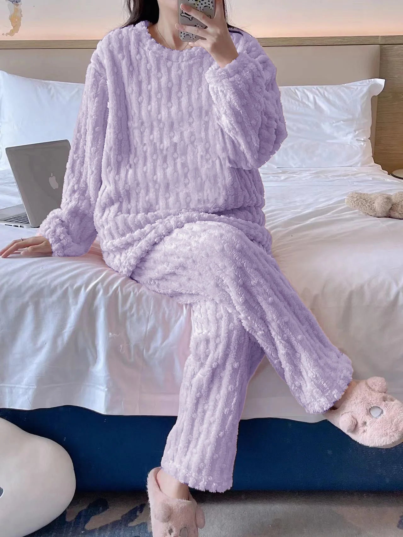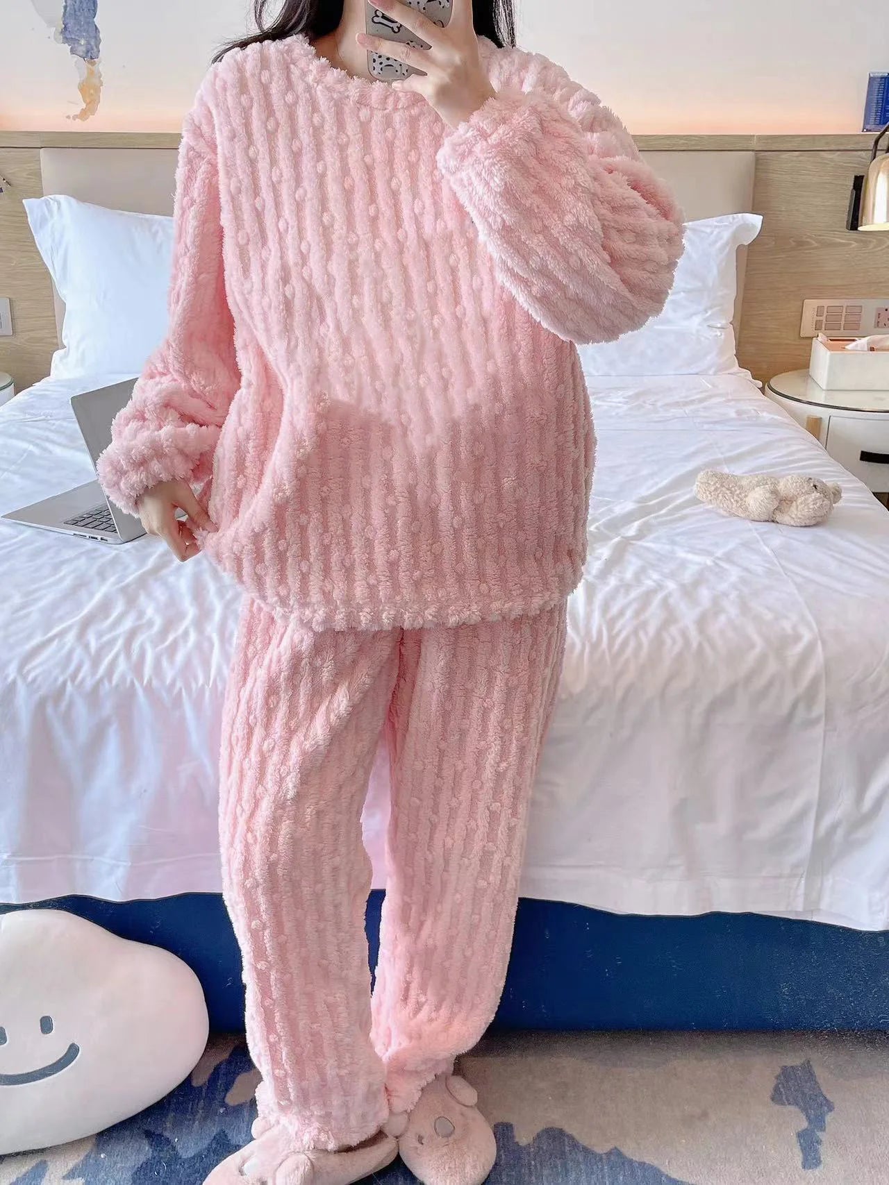 Autumn Winter Plush Sleepwear Women Cute Cartoon round Neck Coral Fleece Striped Embroidery Warm Home Clothes Cozy Set
