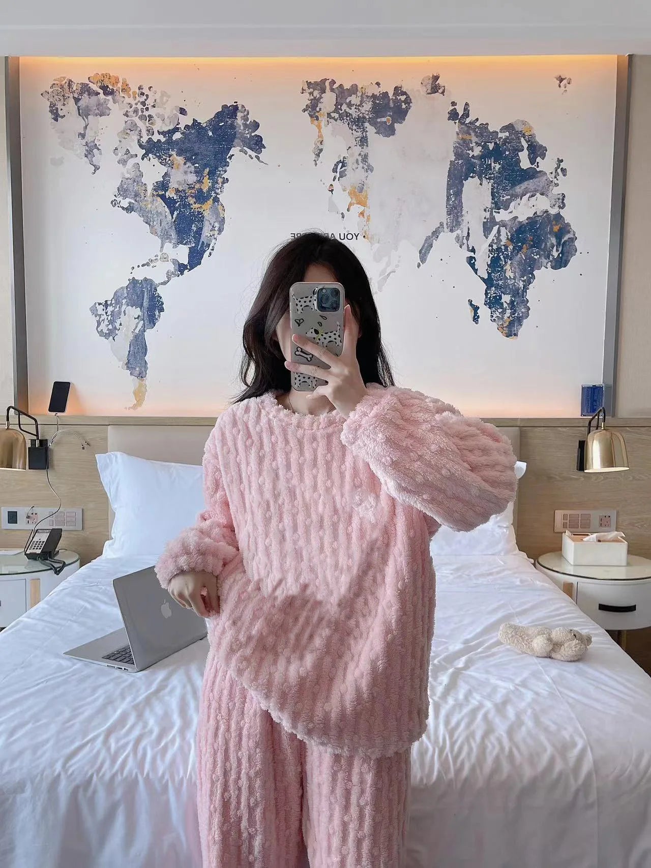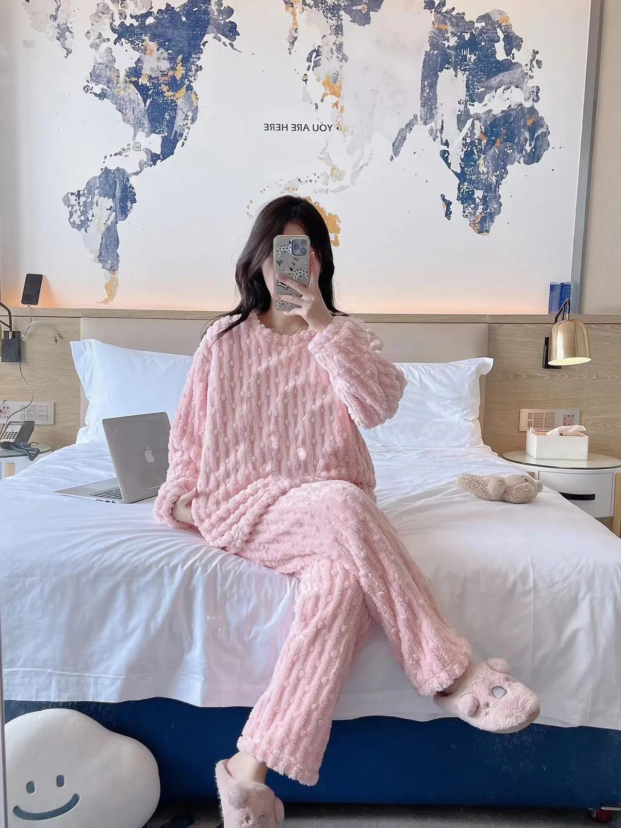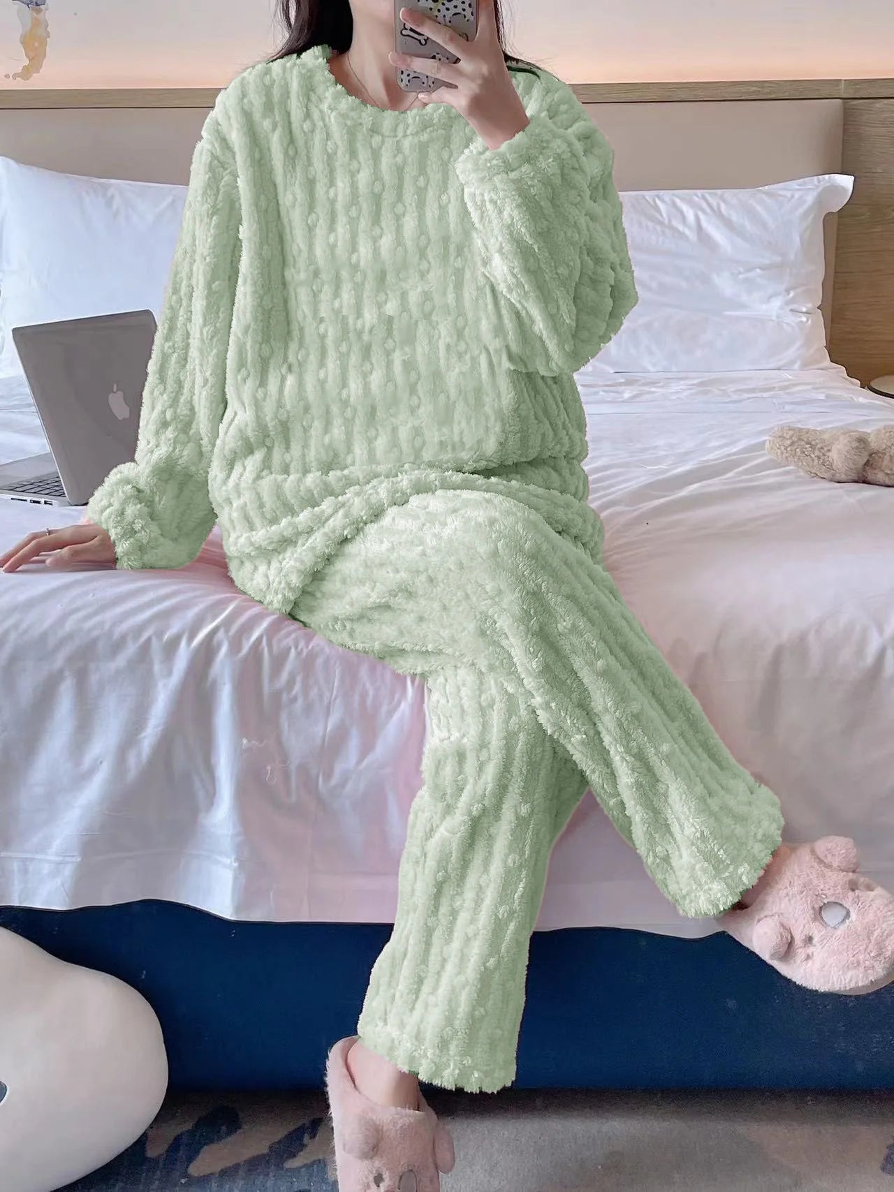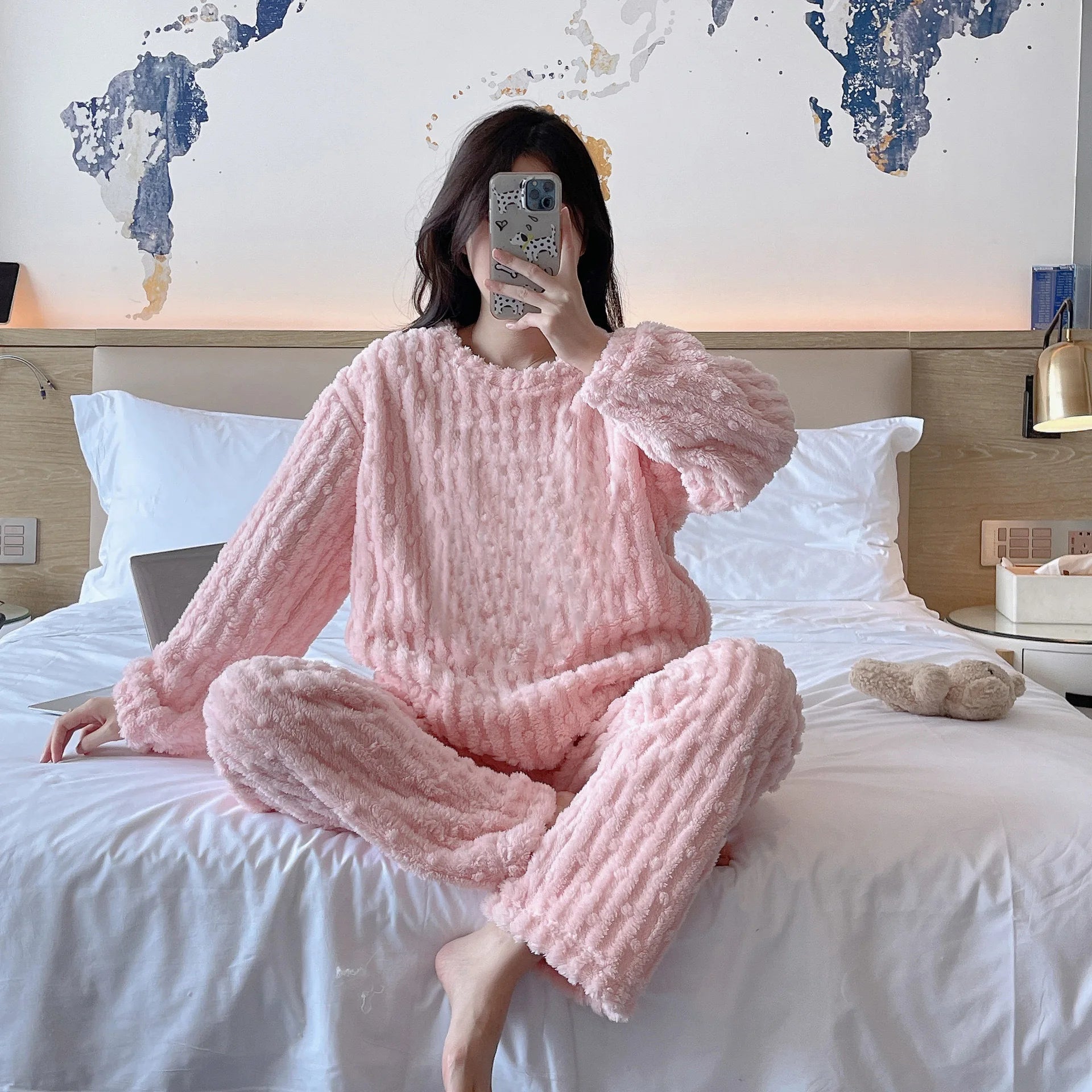Autumn Winter Plush Sleepwear Women Cute Cartoon round Neck Coral Fleece Striped Embroidery Warm Home Clothes Cozy Set