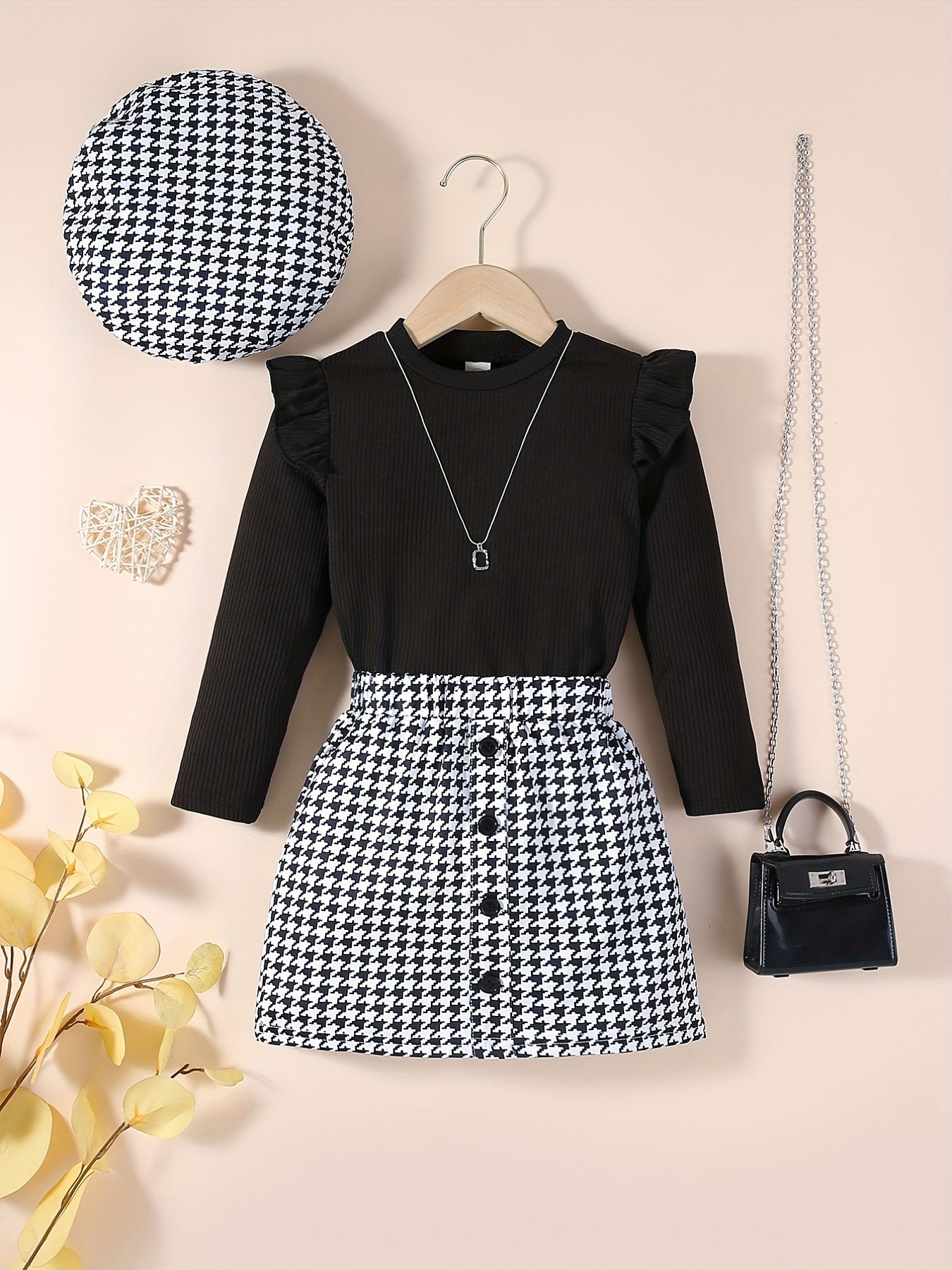 This sophisticated three-piece ensemble for girls features a ribbed long sleeve crew neck top, a fashionable beret hat, and a houndstooth pencil-fit midi skirt with button accents. Suitable for toddlers aged 12 and under, the outfit is crafted from a knit fabric blend of 95% polyester and 5% spandex, providing gentle stretch for comfort and flexibility. The solid-colored top paired with the timeless houndstooth skirt offers a polished look ideal for fall and winter wear. Easy to maintain with machine washable fabric, this set combines charming style with functional design, perfect for casual outdoor occasions.