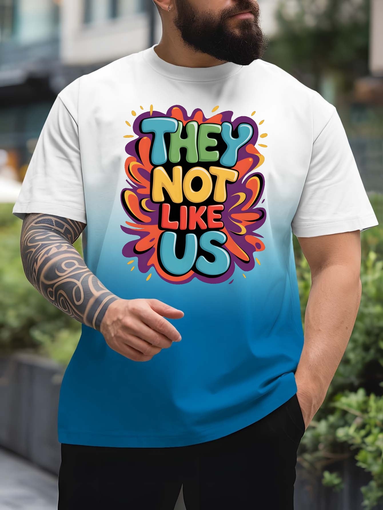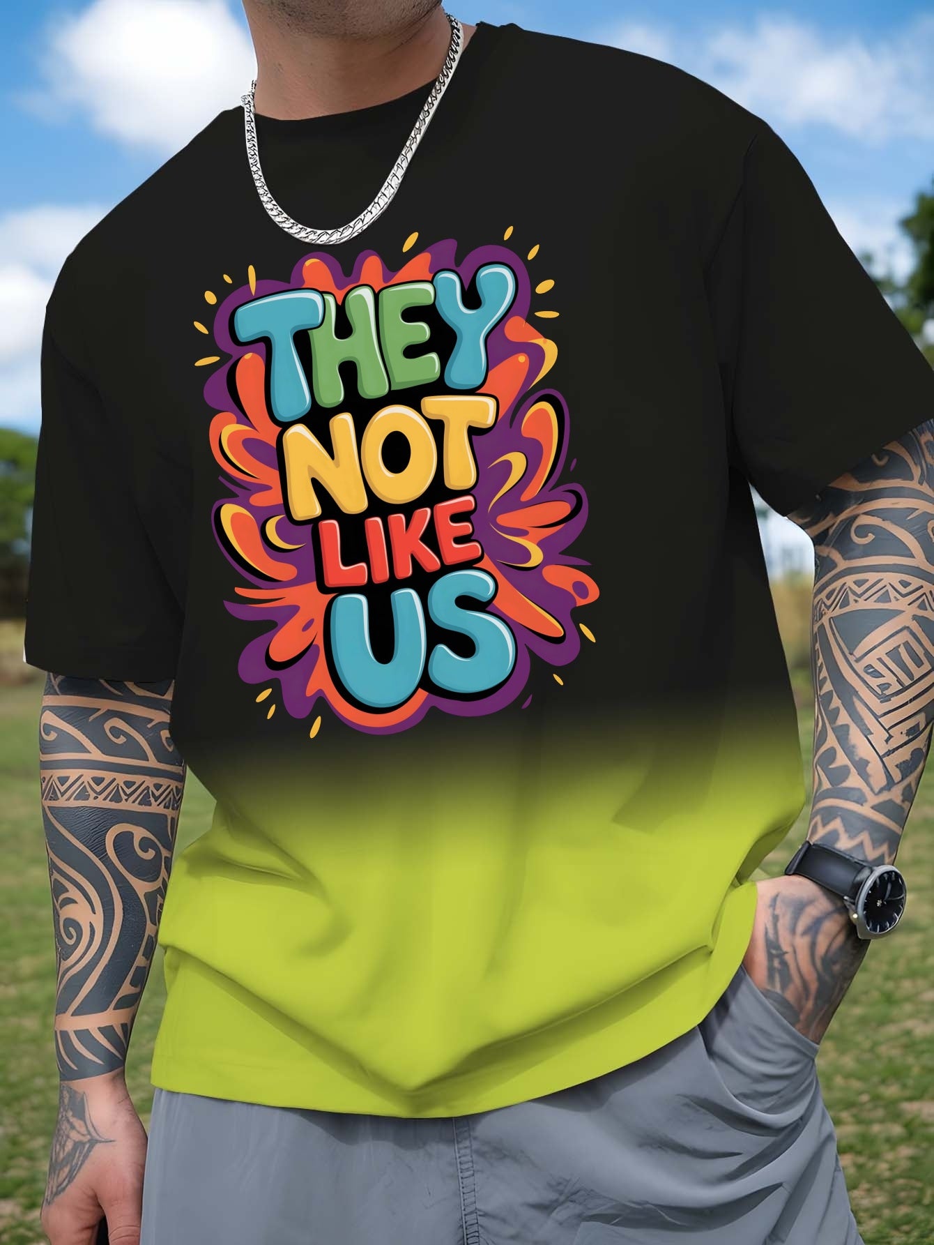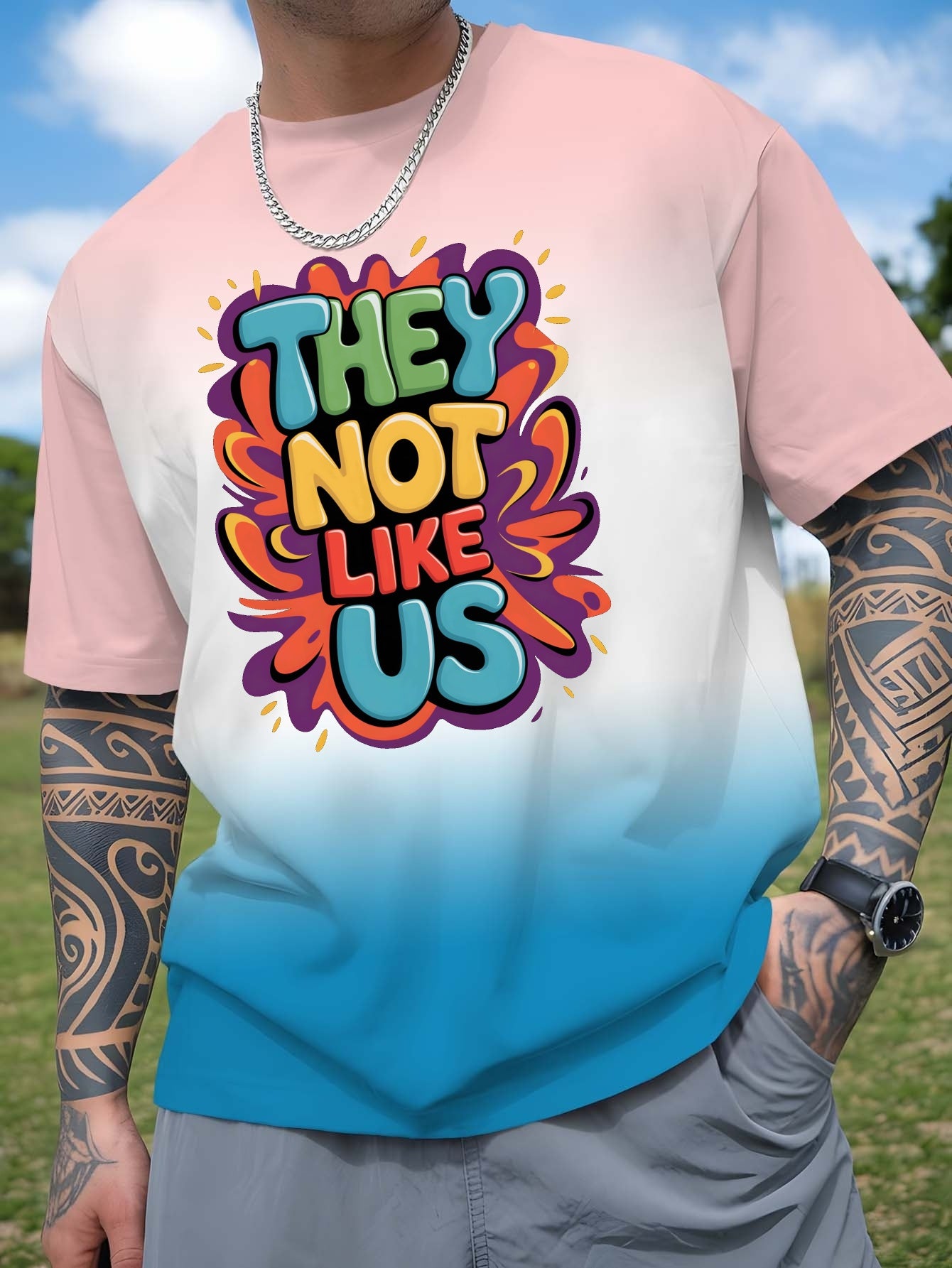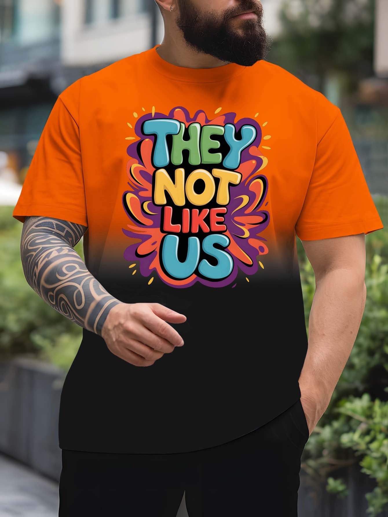 This men's short-sleeve crew neck t-shirt showcases a striking gradient color effect alongside the bold "They Not Like Us" slogan, creating a modern and distinctive look. Constructed from 100% polyester knit fabric with slight stretch, it offers a regular fit that delivers comfort and flexibility, perfect for casual summer wear. The tie-dye design combined with positioning printing adds visual interest, making this shirt a unique addition to any wardrobe. Produced in Guangdong, China, it is designed for durability and should be cared for with hand washing or professional dry cleaning to preserve its vibrant colors and quality.
