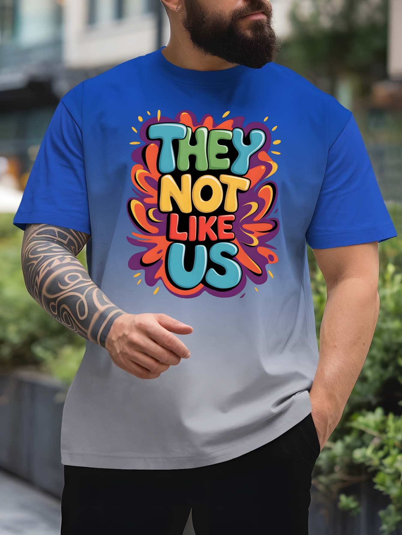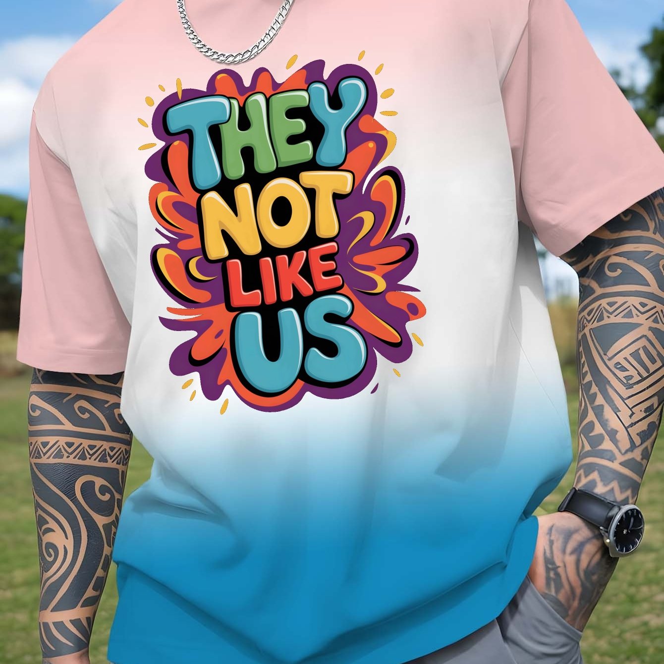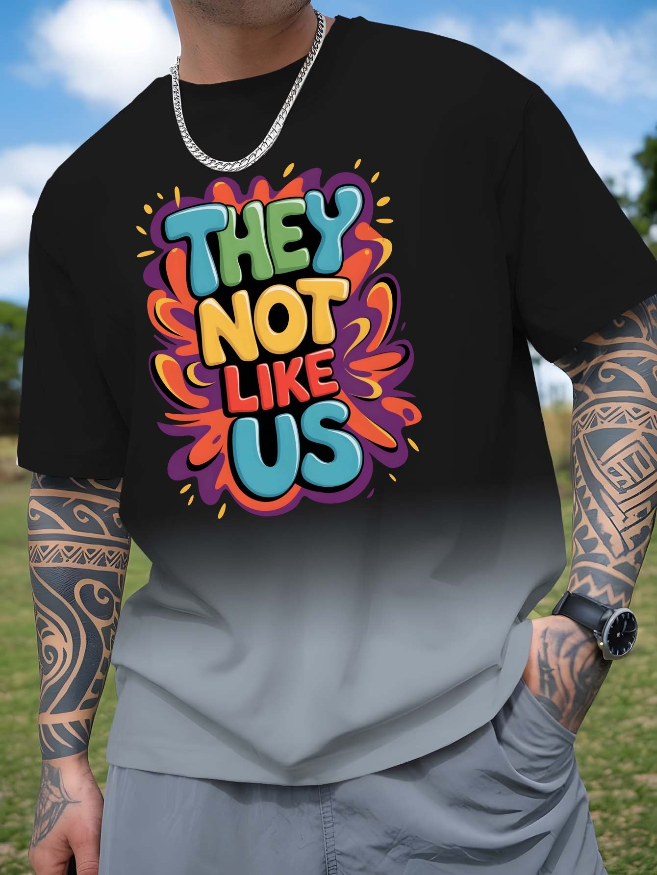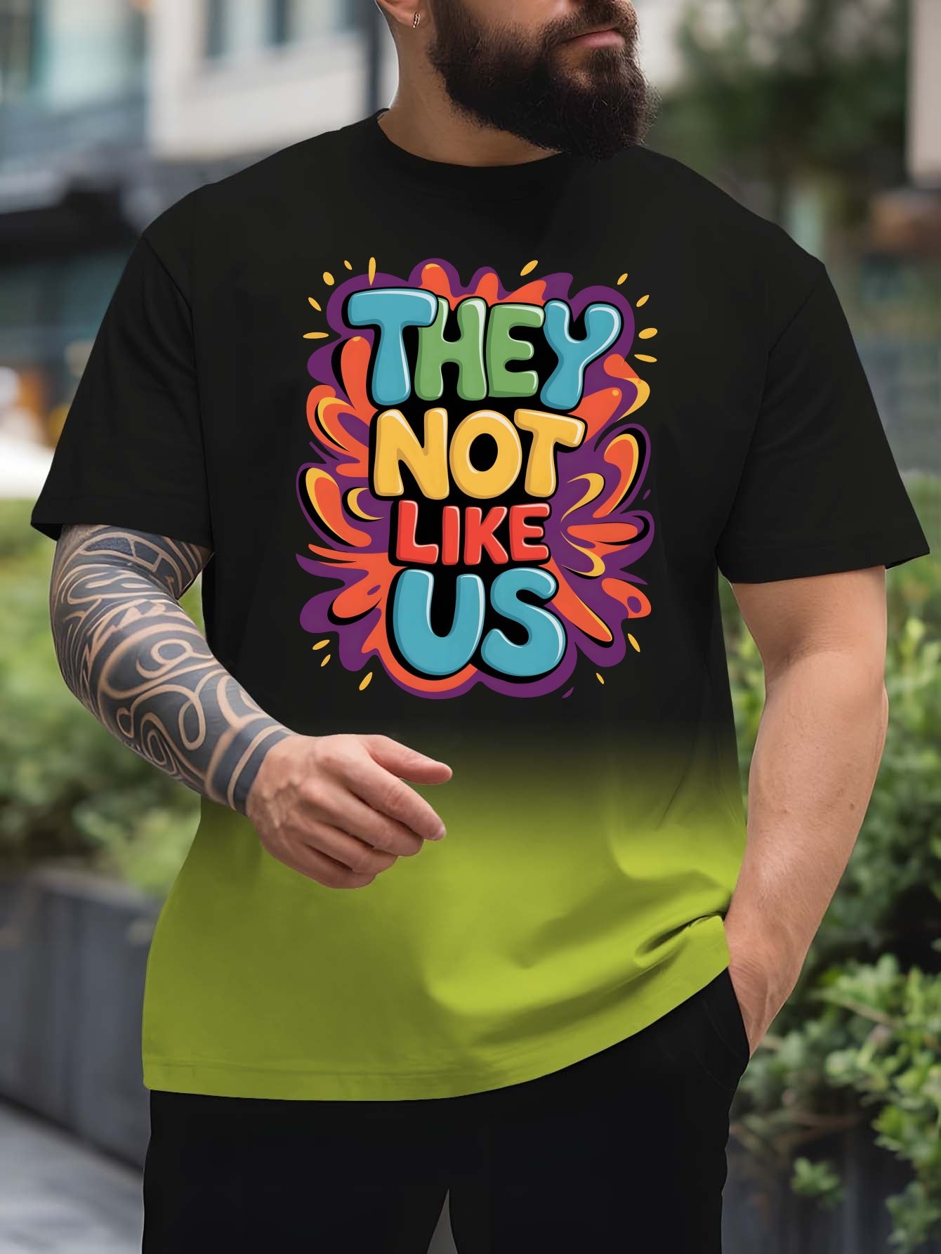 This men's short-sleeve crew neck t-shirt showcases a striking gradient color effect alongside the bold "They Not Like Us" slogan, creating a modern and distinctive look. Constructed from 100% polyester knit fabric with slight stretch, it offers a regular fit that delivers comfort and flexibility, perfect for casual summer wear. The tie-dye design combined with positioning printing adds visual interest, making this shirt a unique addition to any wardrobe. Produced in Guangdong, China, it is designed for durability and should be cared for with hand washing or professional dry cleaning to preserve its vibrant colors and quality.