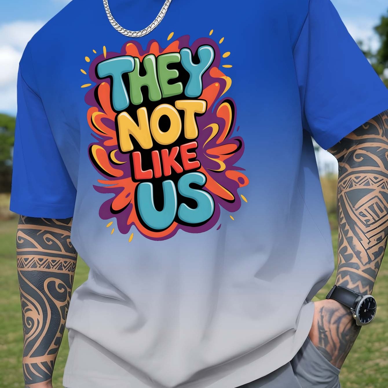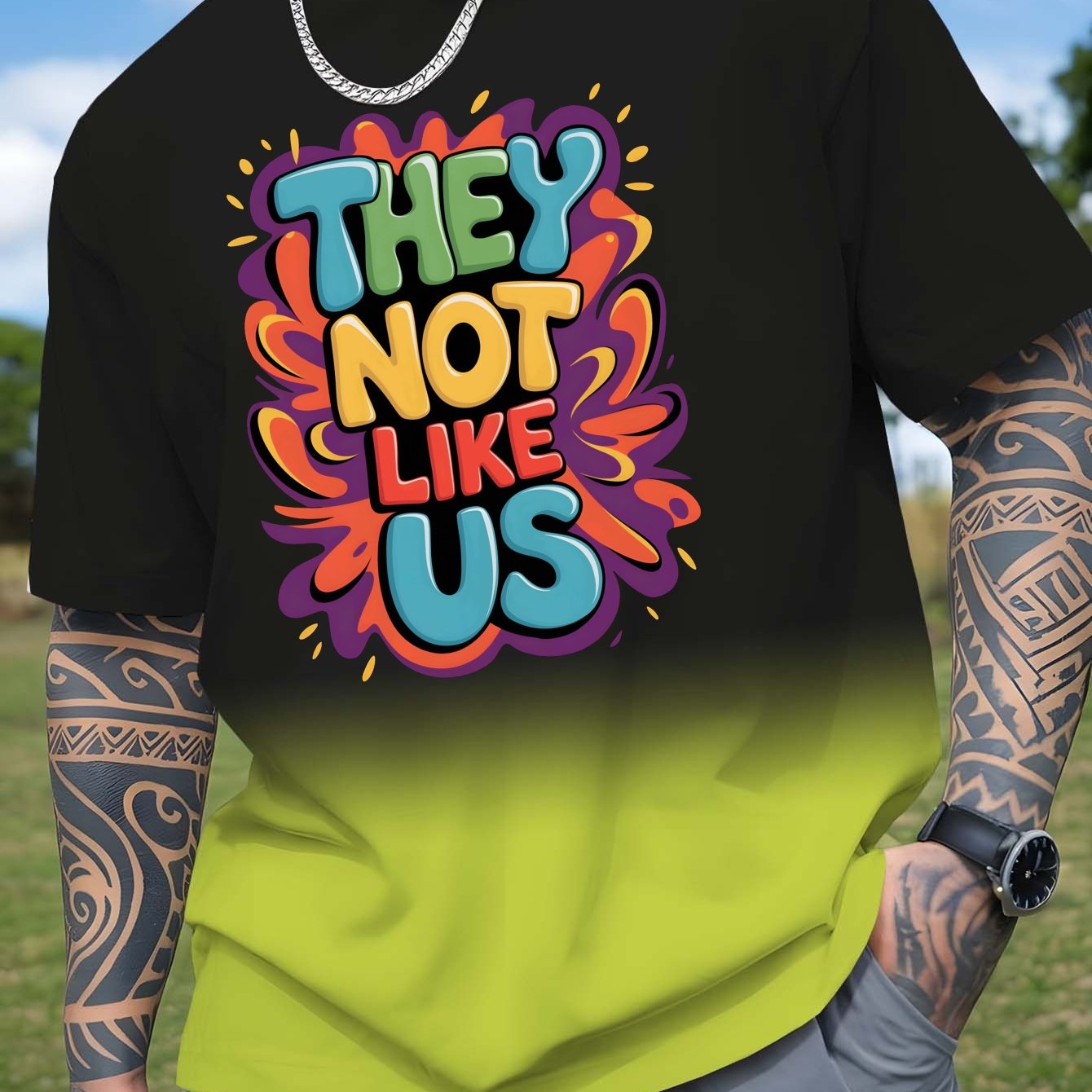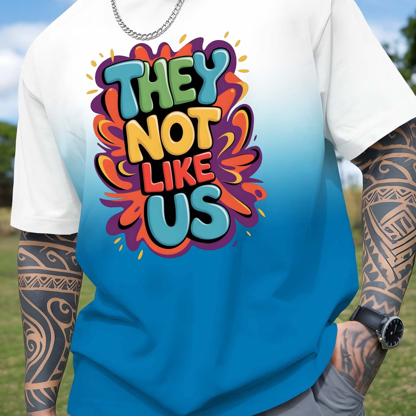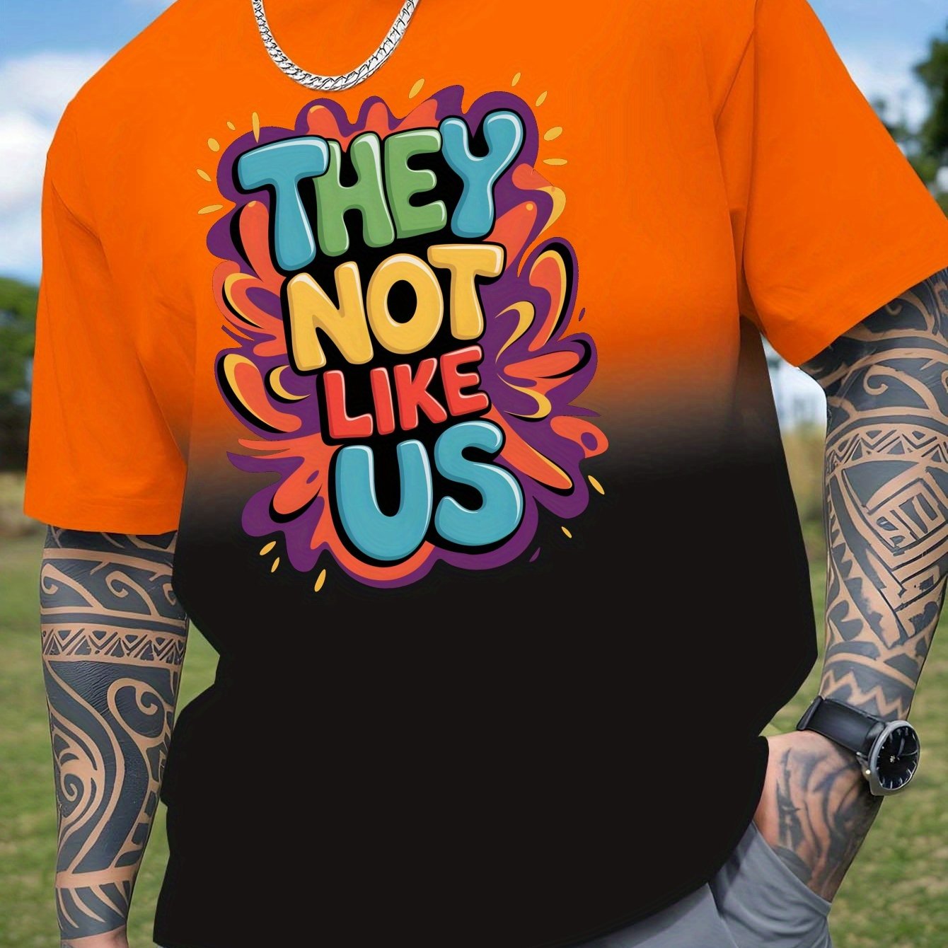 This men's short-sleeve crew neck t-shirt showcases a striking gradient color effect alongside the bold "They Not Like Us" slogan, creating a modern and distinctive look. Constructed from 100% polyester knit fabric with slight stretch, it offers a regular fit that delivers comfort and flexibility, perfect for casual summer wear. The tie-dye design combined with positioning printing adds visual interest, making this shirt a unique addition to any wardrobe. Produced in Guangdong, China, it is designed for durability and should be cared for with hand washing or professional dry cleaning to preserve its vibrant colors and quality.