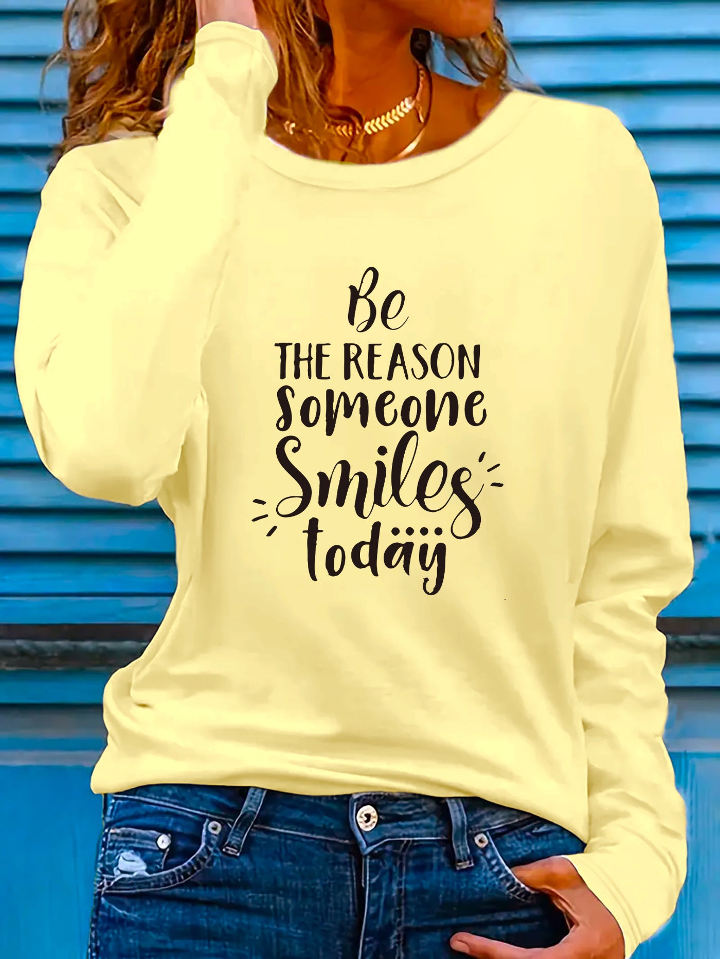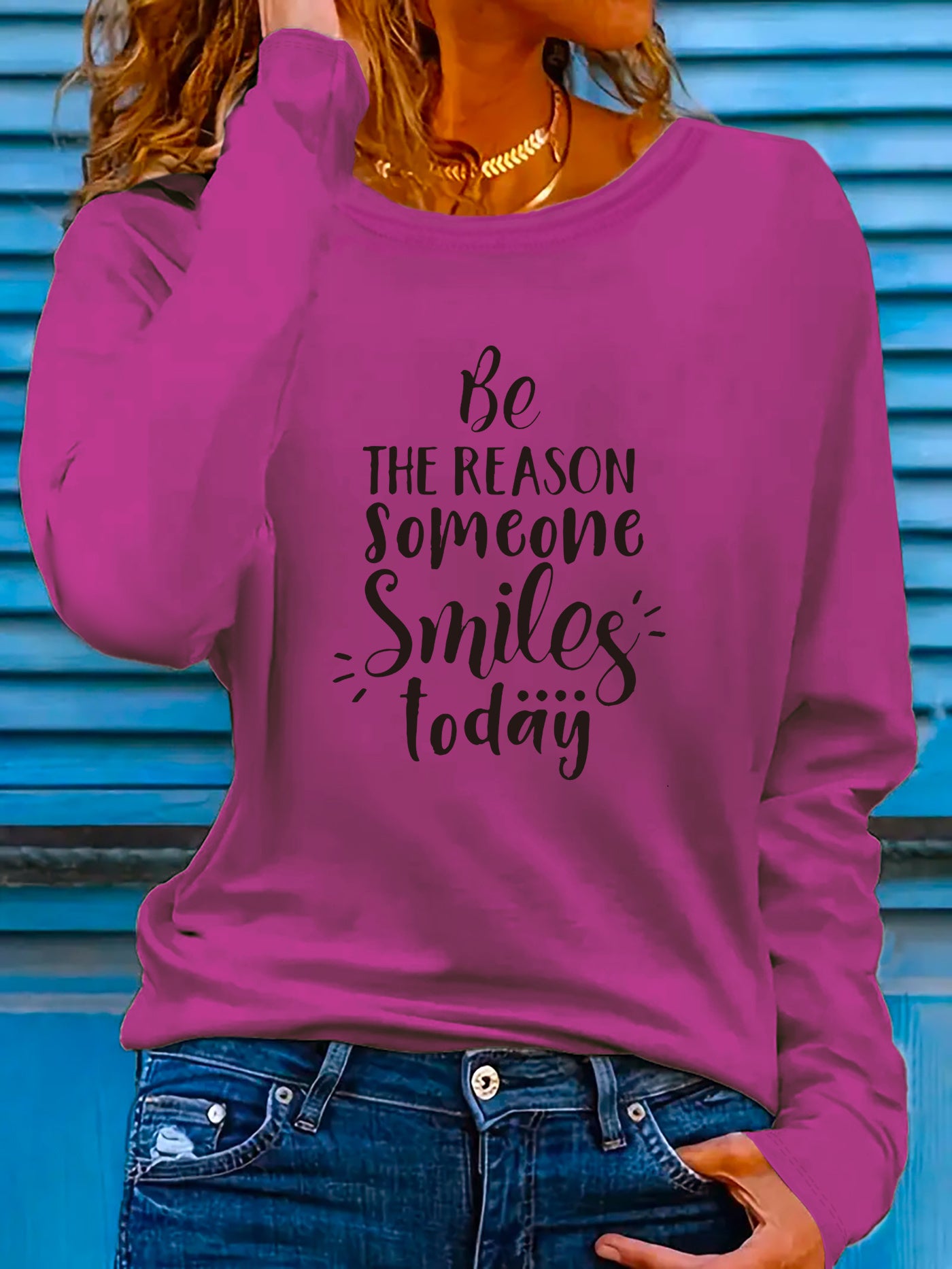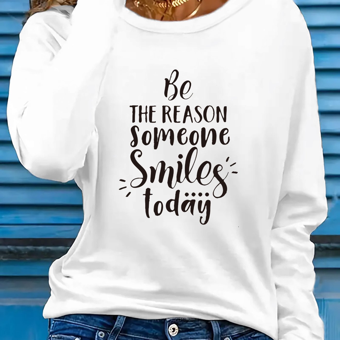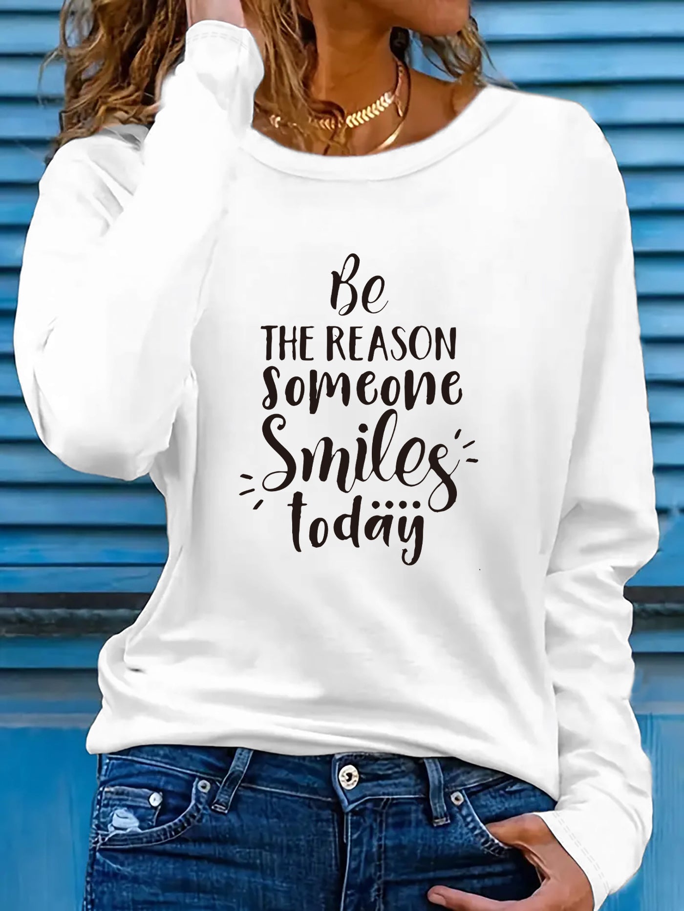 This women's long sleeve T-shirt carries the encouraging phrase "Be the Reason Someone Smiles Today," designed to promote positivity. Constructed from a lightweight polyester blend containing 5% spandex, the fabric provides slight stretch and micro elasticity for all-day comfort. Featuring a crew neckline and regular fit, it delivers a timeless look, with applique detailing adding a touch of texture. The geometric-patterned knit fabric enhances both durability and breathability, ideal for spring and summer wear. Machine washable for easy care, this pullover shirt is a versatile and uplifting staple for any casual collection. Made in Guangdong, China.
