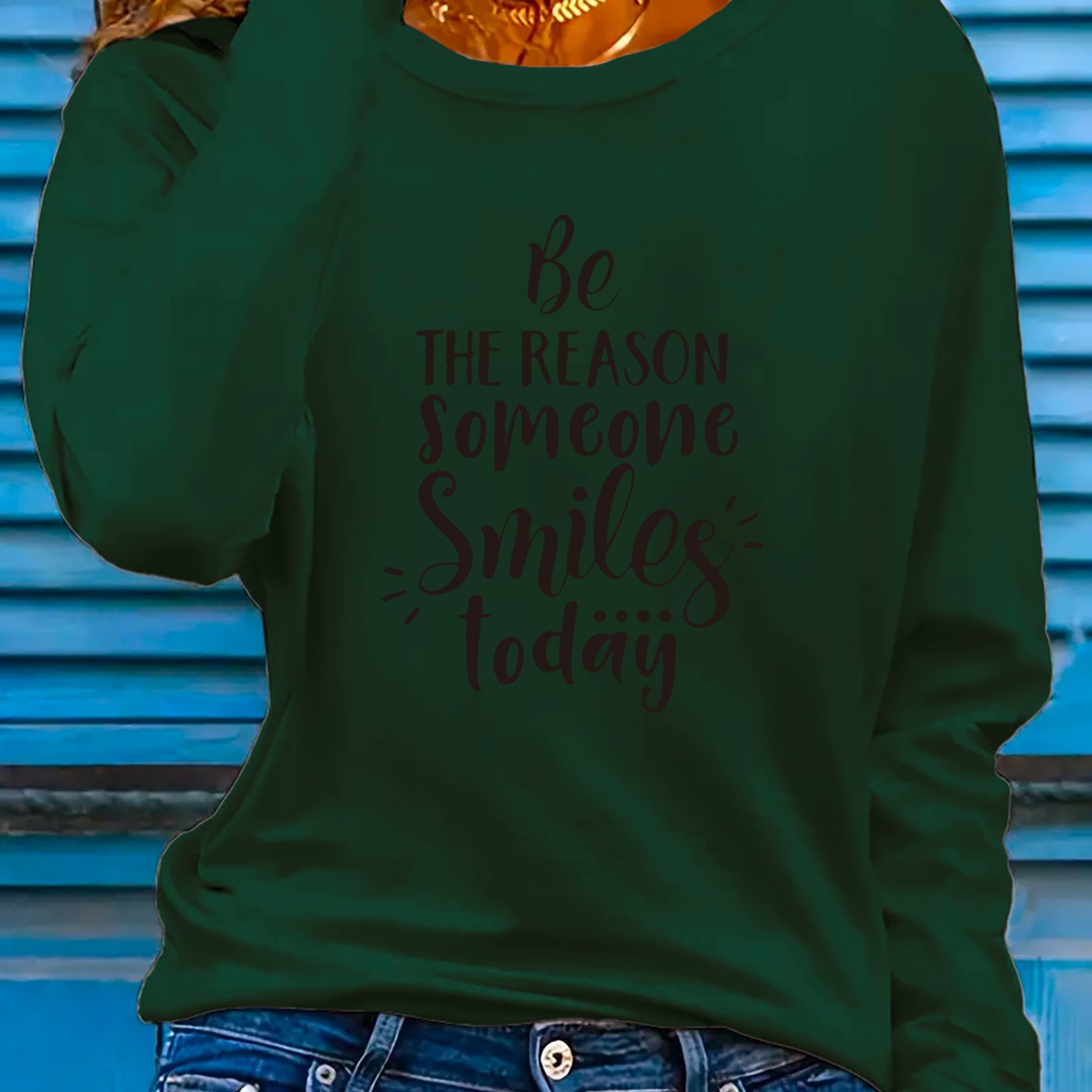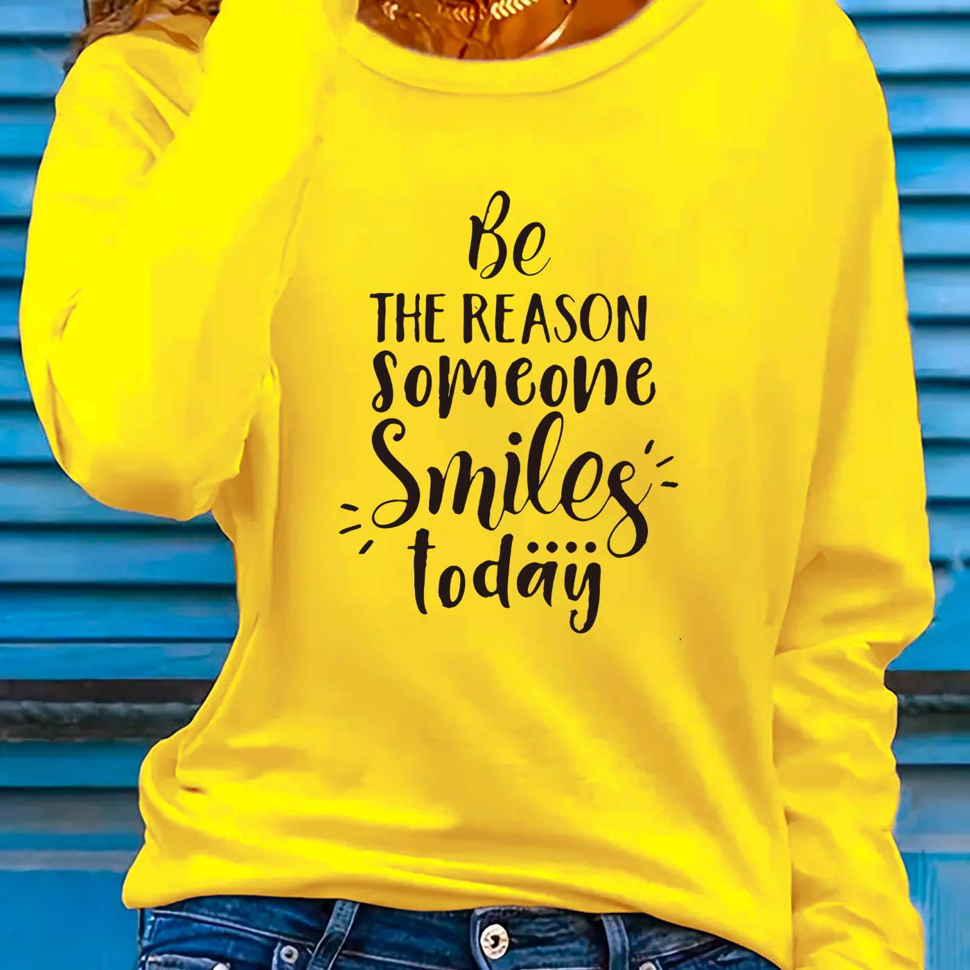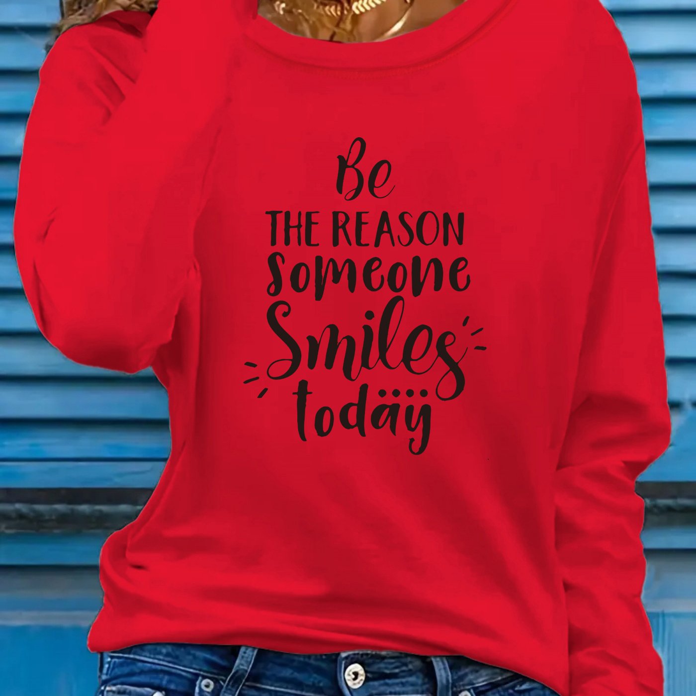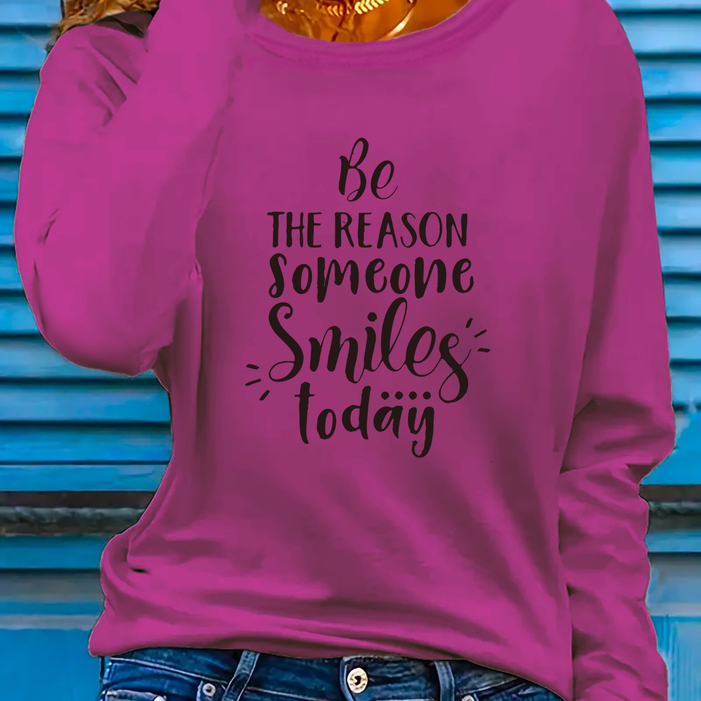 This women's long sleeve T-shirt carries the encouraging phrase "Be the Reason Someone Smiles Today," designed to promote positivity. Constructed from a lightweight polyester blend containing 5% spandex, the fabric provides slight stretch and micro elasticity for all-day comfort. Featuring a crew neckline and regular fit, it delivers a timeless look, with applique detailing adding a touch of texture. The geometric-patterned knit fabric enhances both durability and breathability, ideal for spring and summer wear. Machine washable for easy care, this pullover shirt is a versatile and uplifting staple for any casual collection. Made in Guangdong, China.