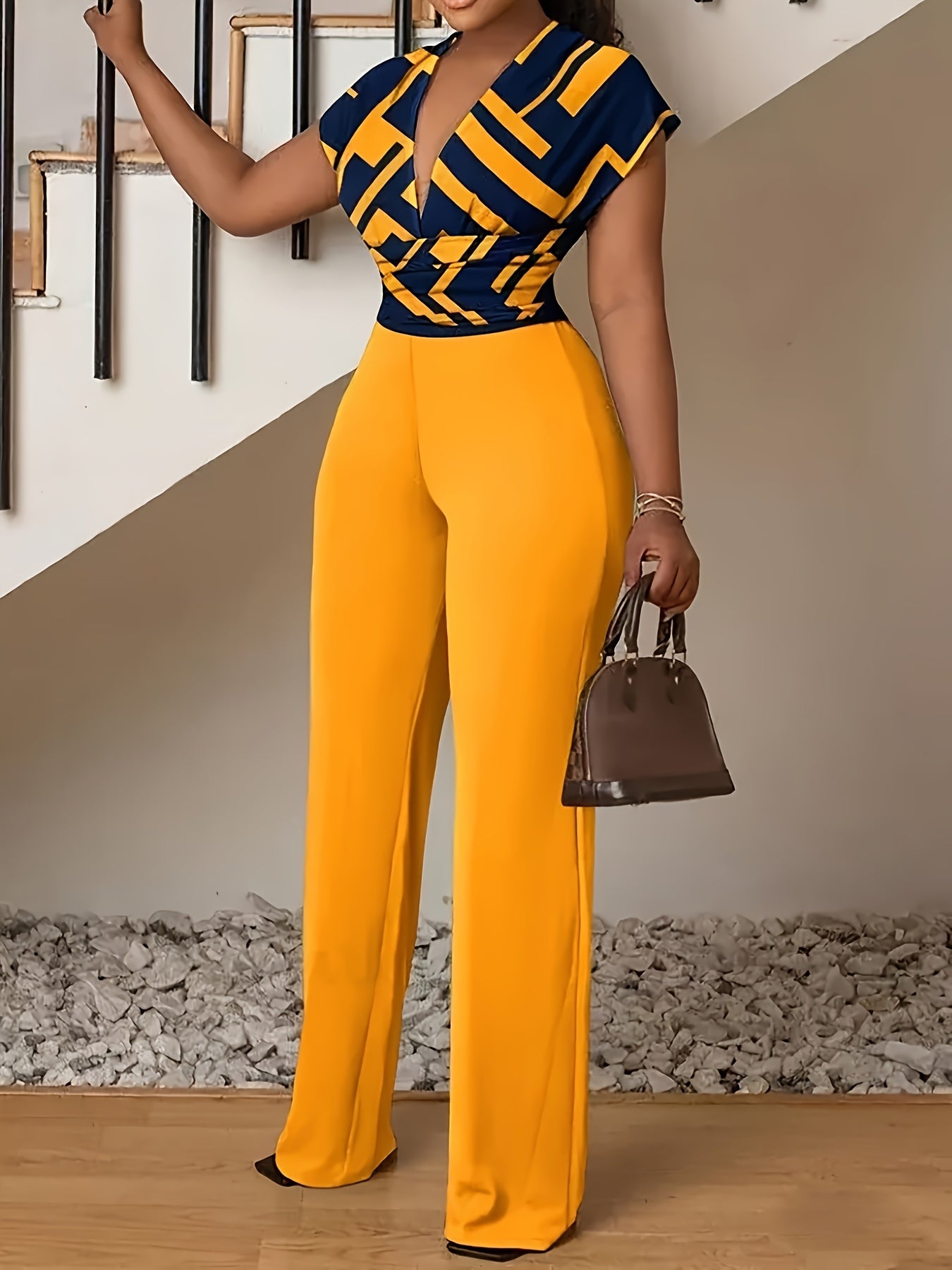 This Women’s Sexy Deep V-Neck Geometric Print Jumpsuit combines bold design with comfortable wearability, suitable for all seasons. Crafted from a blend of 95% polyester and 5% spandex, the knit fabric offers mid-level elasticity, ensuring a flattering fit that moves with you. The deep V-neck collar adds a striking, seductive element, while the geometric pattern, applied through random printing, gives the jumpsuit a modern, stylish look. Machine washable for easy care, this piece is produced in Guangdong, China, and is perfect for those seeking an elegant yet daring outfit option for various occasions.