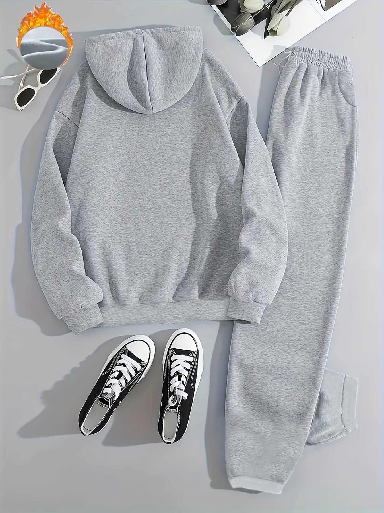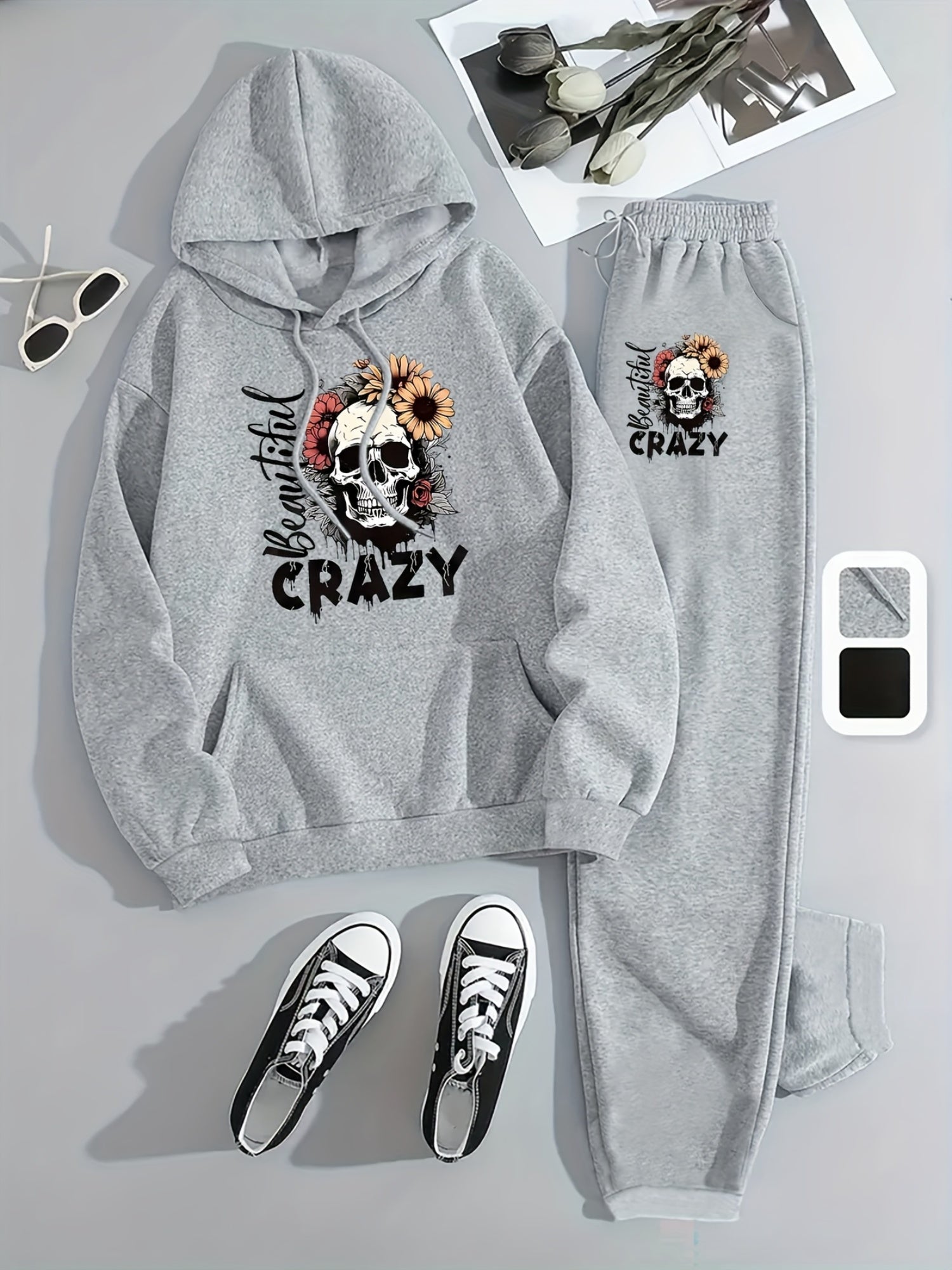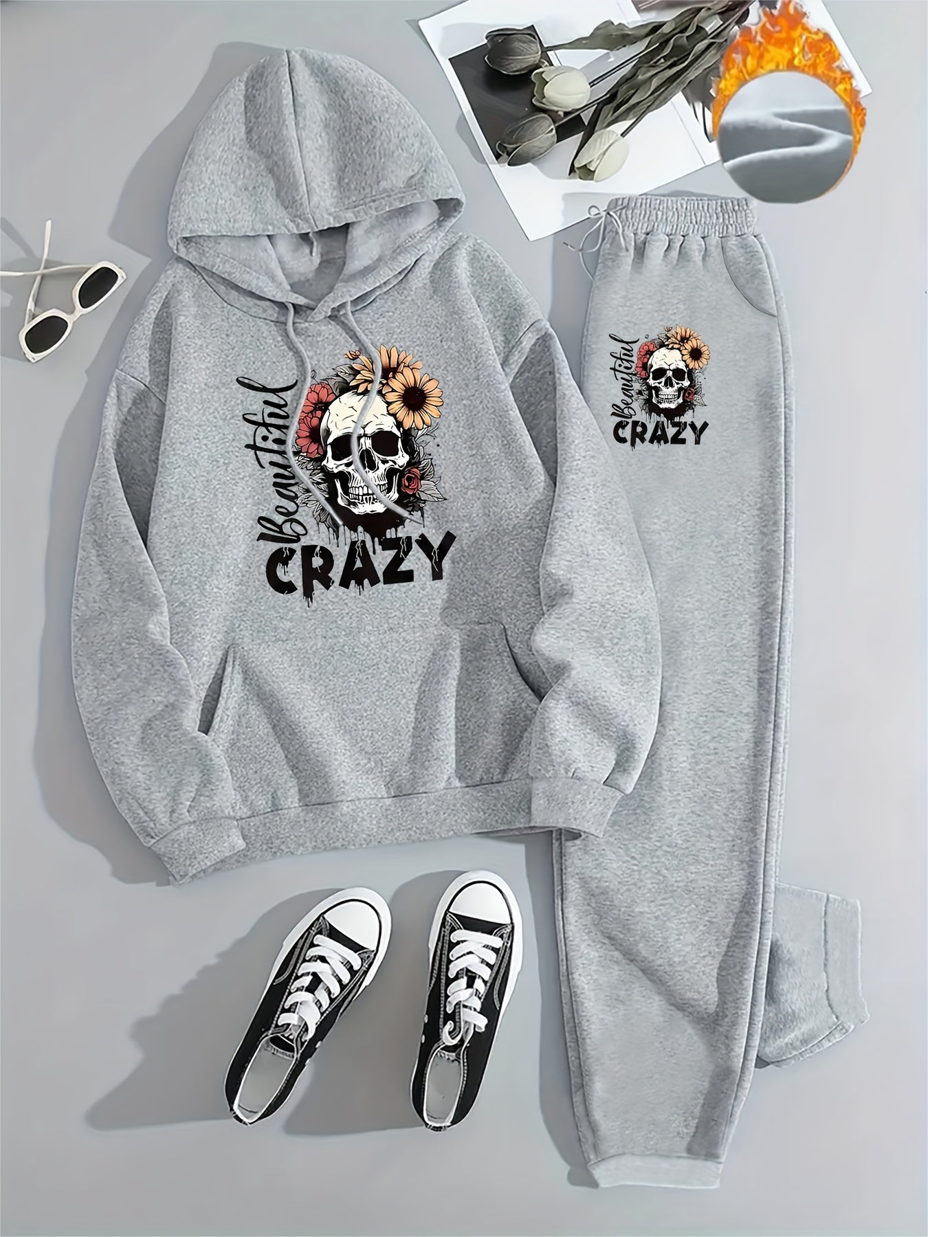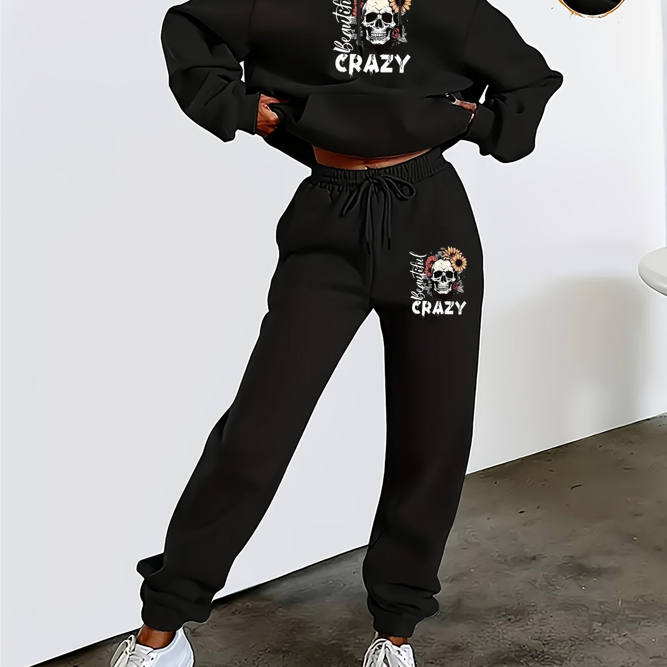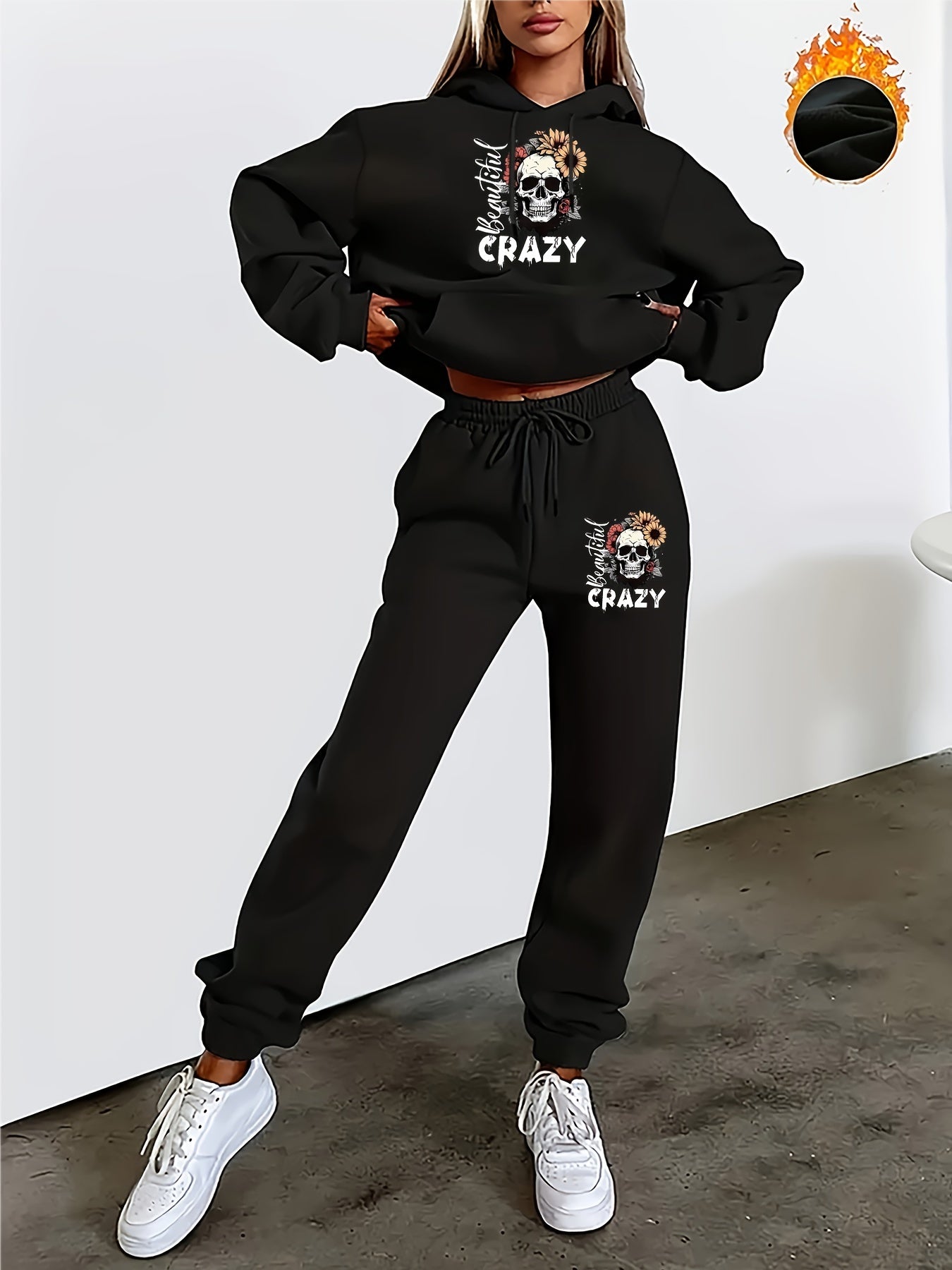 This set features a hooded pullover and coordinating sweatpants, both made from 100% polyester with slight stretch to ensure ease of movement. The striking skull print adds a distinctive Halloween touch to a casual design. The hoodie includes convenient drawstring pockets and a pull-over style for quick dressing, while the pants offer a relaxed silhouette suited for cooler fall and winter days. Produced with knit fabric in Guangdong, China, and machine washable, this ensemble offers a comfortable blend of warmth and breathability, making it a practical yet stylish choice for seasonal casual wear.