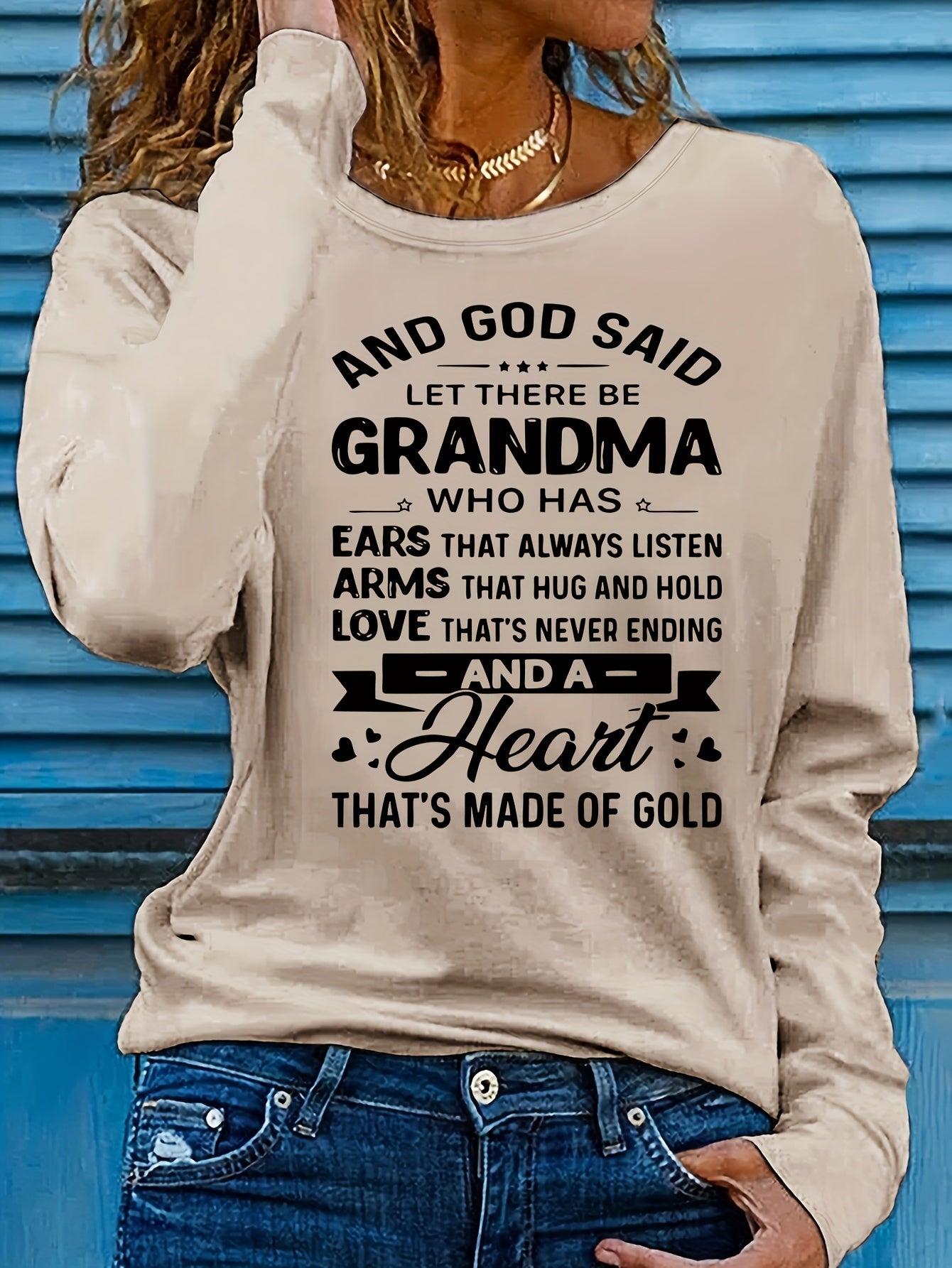 This women’s long sleeve crew neck T-shirt combines comfort and style for everyday wear, featuring a white background adorned with a delightful "Grandma" quote letter print. Constructed from 100% polyester with medium stretch and moderate elasticity, it offers a relaxed yet flattering fit ideal for spring and fall. The applique accents and positioning print enhance its design while ensuring durability. Made from knit fabric in Guangdong, China, this pullover shirt is machine washable and requires no dry cleaning. With a regular length, classic crew neck, and casual long sleeves, it delivers consistent comfort and enduring style, perfect for versatile casual outfits.