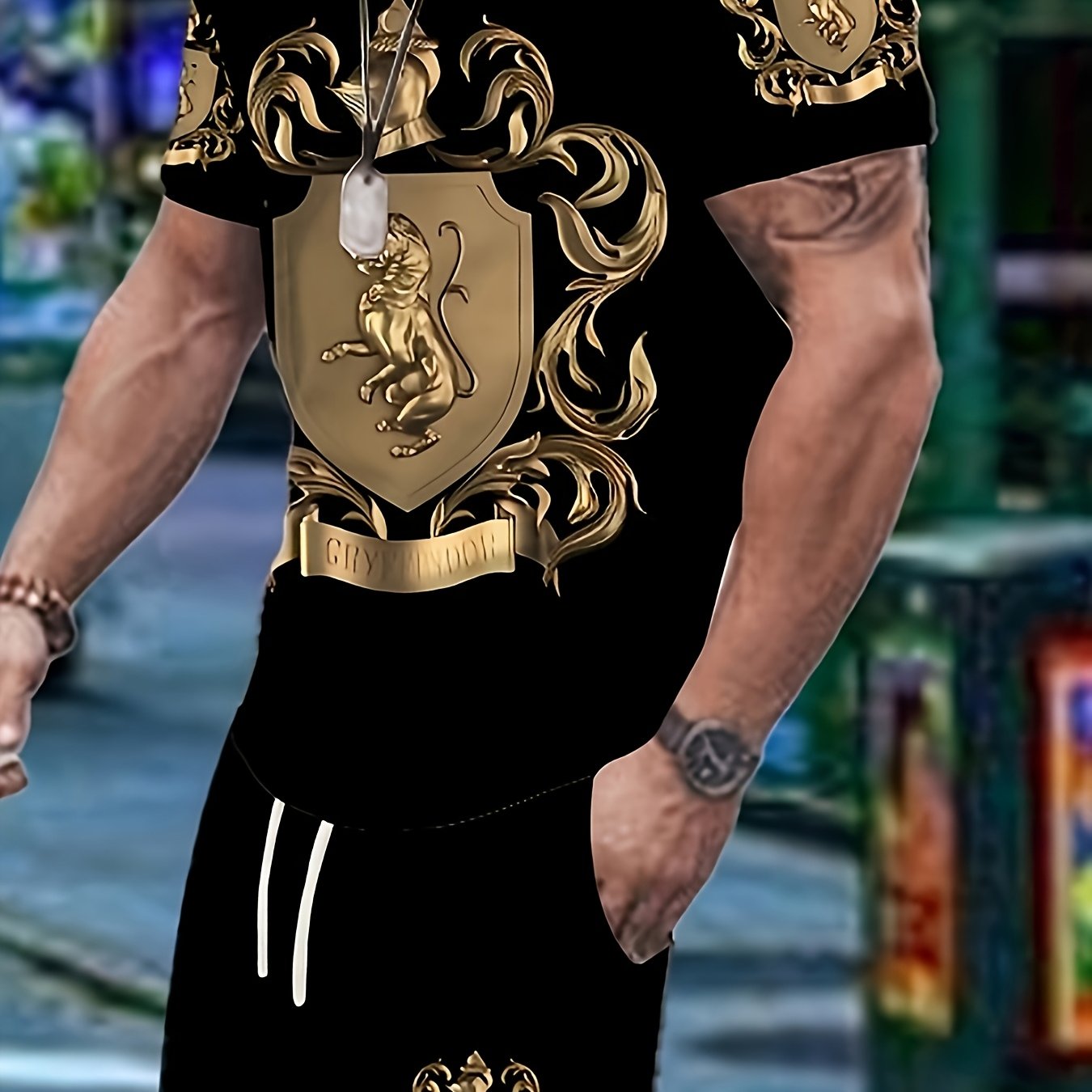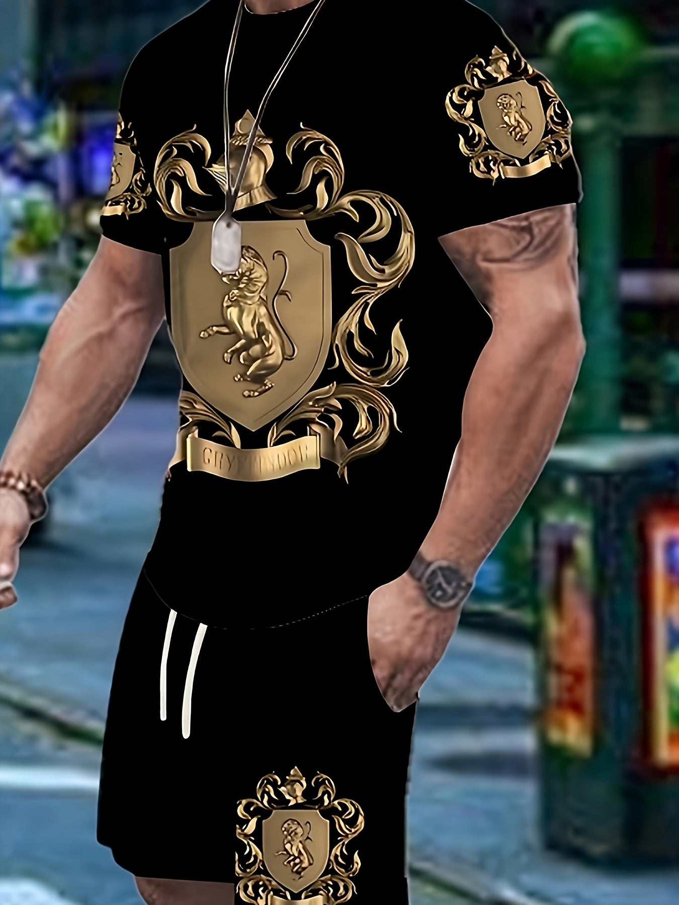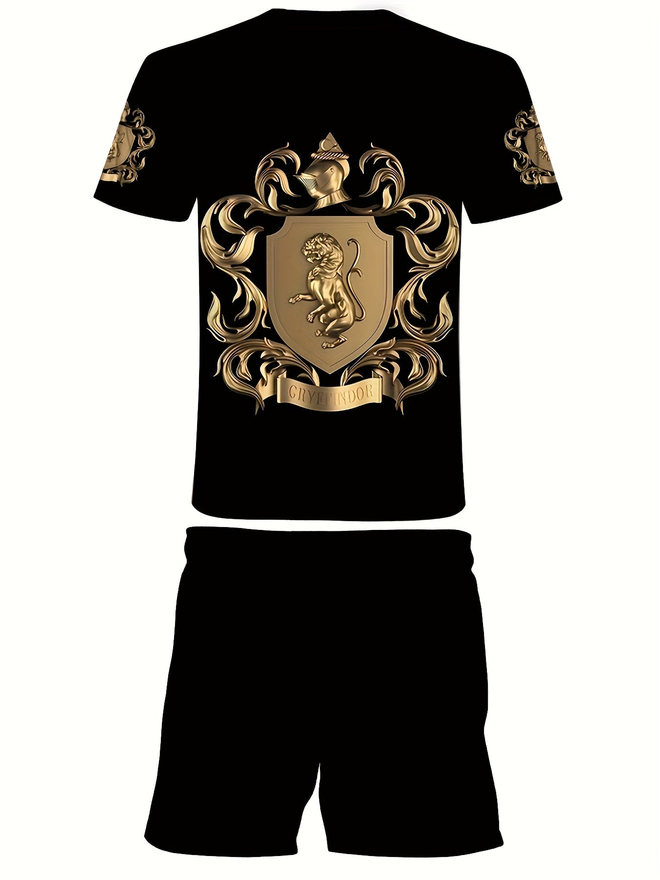 This men's 2-piece casual lash set includes a crew neck T-shirt with 3D digital printing and matching drawstring shorts, both made from 100% polyester with a slight stretch to enhance comfort and mobility. Suitable for year-round wear, the fabric is smooth, lightweight, and breathable, promoting excellent airflow and long-lasting performance. The regular fit and knit construction offer a comfortable yet refined appearance ideal for everyday casual use. This set is easy to maintain, being machine washable or dry-clean friendly. Featuring accurate positioning printing and a distinctive pattern, it blends functionality with modern style. Manufactured in Guangdong, China.