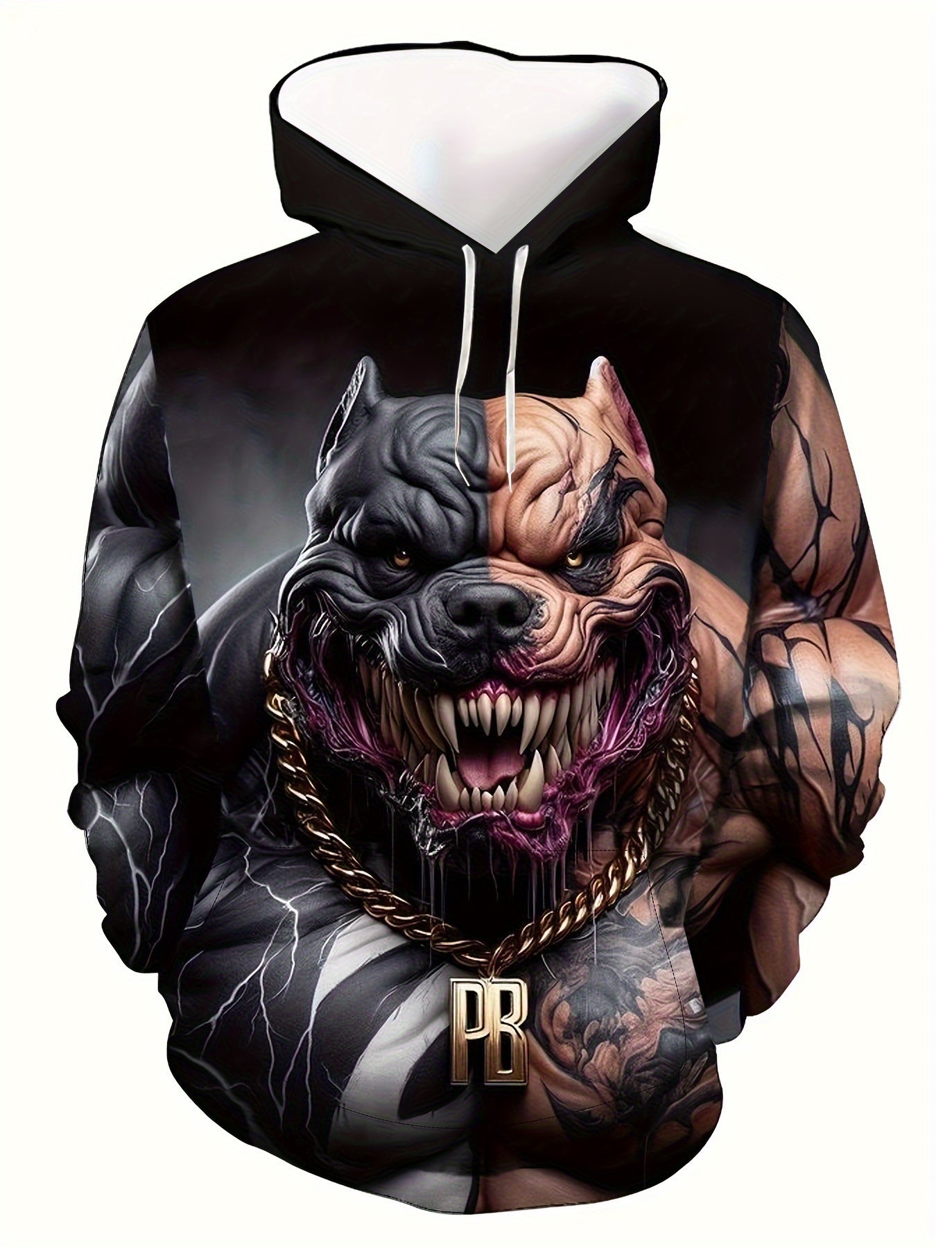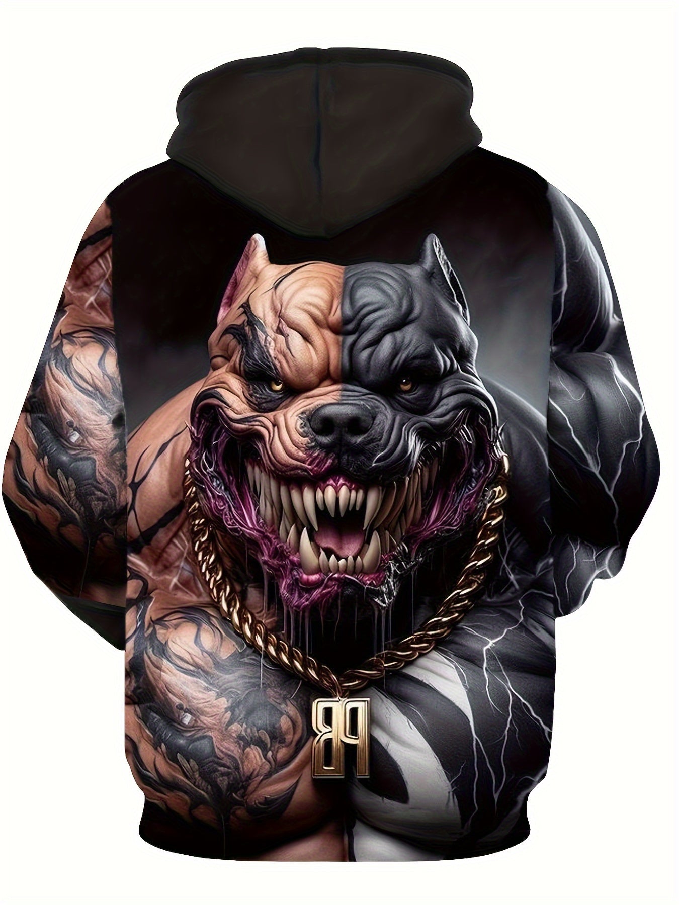This long-length men's hoodie features a striking 3D digital print of a devil pitbull, creating a bold and distinctive appearance. Constructed from 100% polyester French terry fabric with a slight stretch, it offers a soft yet sturdy texture suitable for everyday use. The regular fit provides ease of movement and comfort, while the kangaroo pocket enhances functionality by offering warmth and storage. Ideal for casual wear, this warm hooded sweatshirt blends unique artwork with practical design elements, making it a versatile piece for those who value both comfort and standout style.