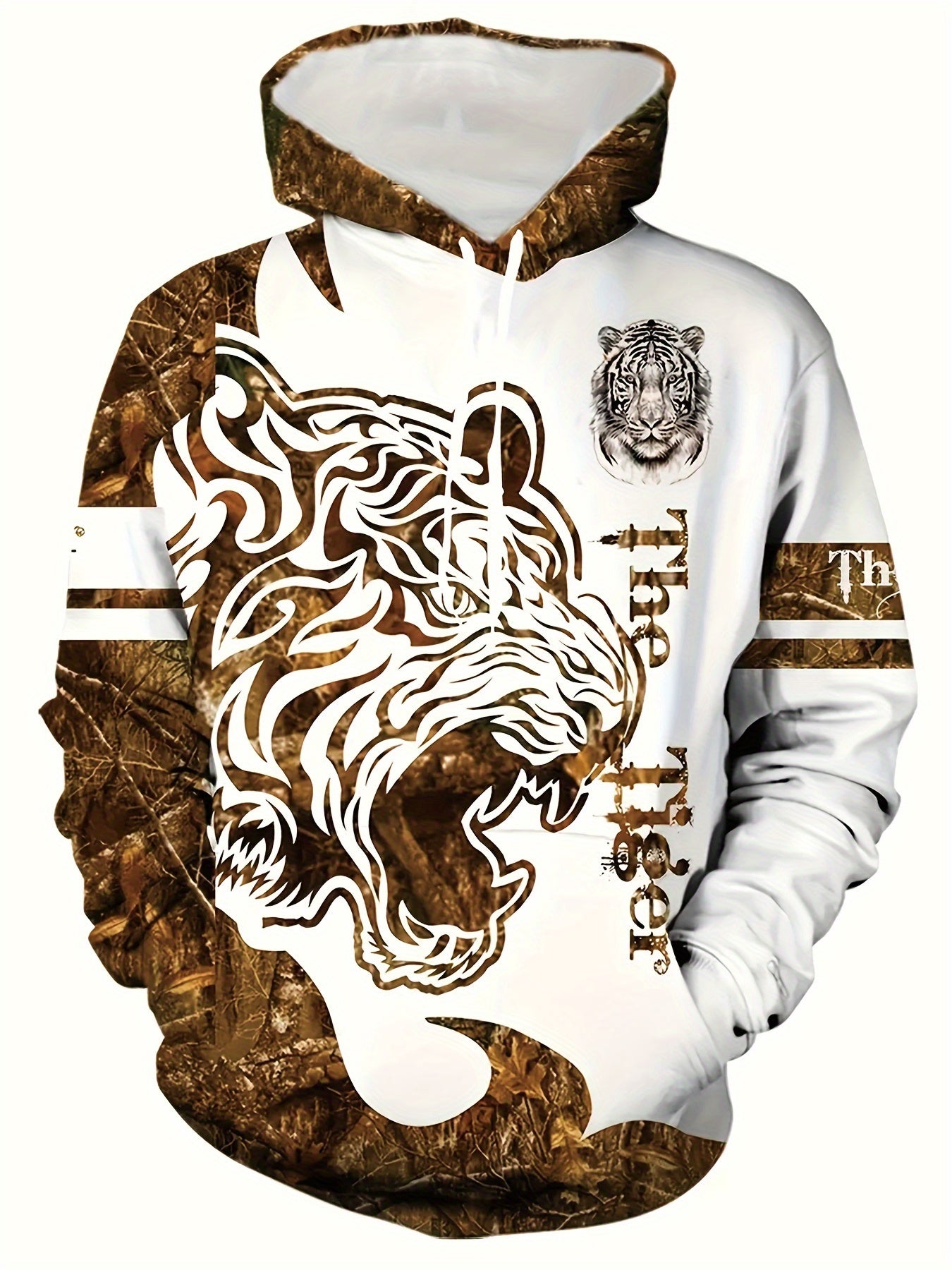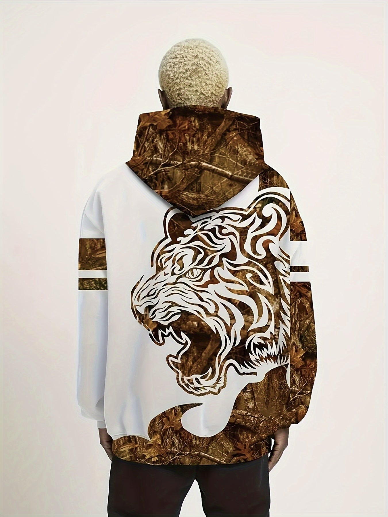 This men's casual ensemble showcases a bold all-over tiger print on a long-sleeve pullover hoodie and coordinating drawstring joggers. Crafted from 100% polyester knit fabric with slight stretch, it offers a regular fit that merges comfort with contemporary style. The hoodie is equipped with functional pockets and a hood for practicality, while the joggers feature an adjustable drawstring waist to personalize the fit. Ideal for spring and fall, this set pairs eye-catching design with relaxed wearability. Easy to maintain through hand washing or professional dry cleaning, it is made in Jiangxi, China, ensuring both durability and quality.