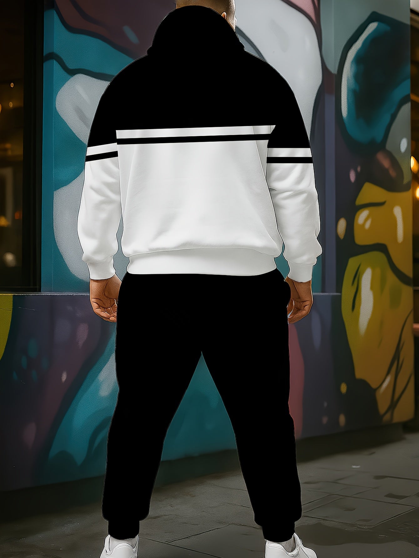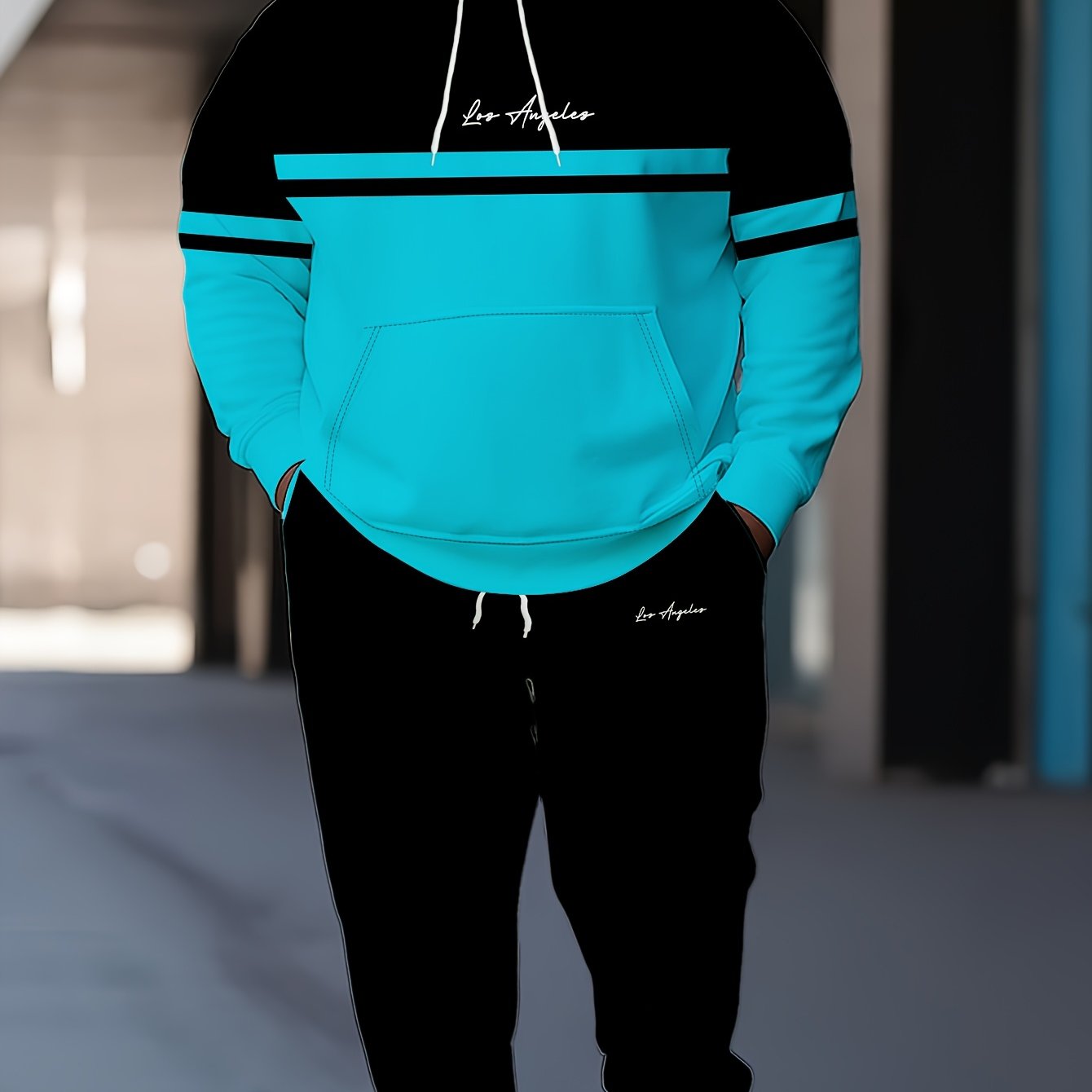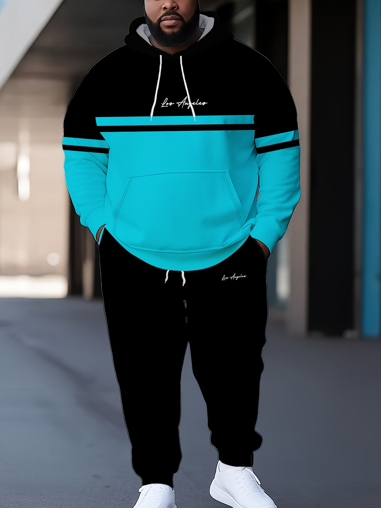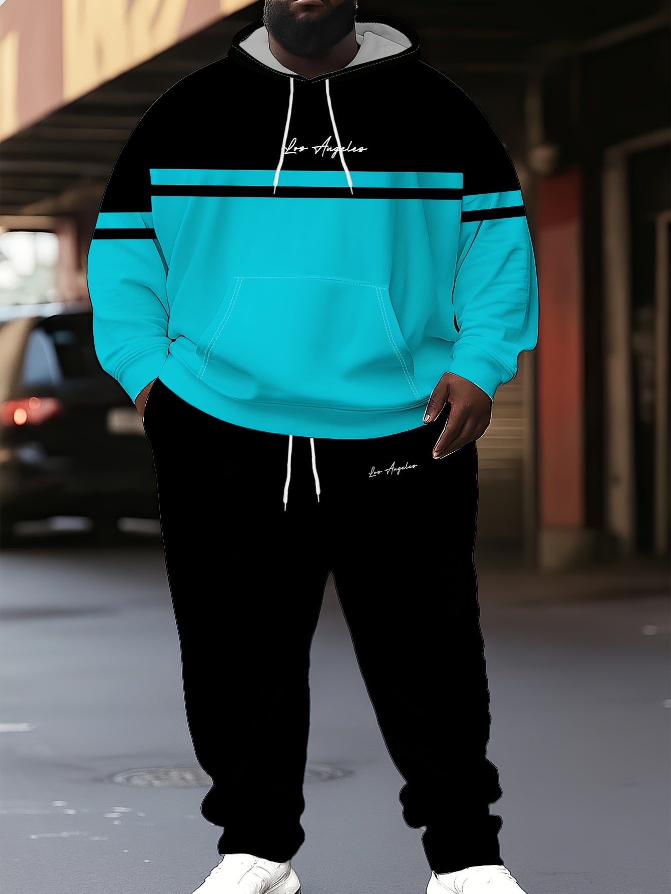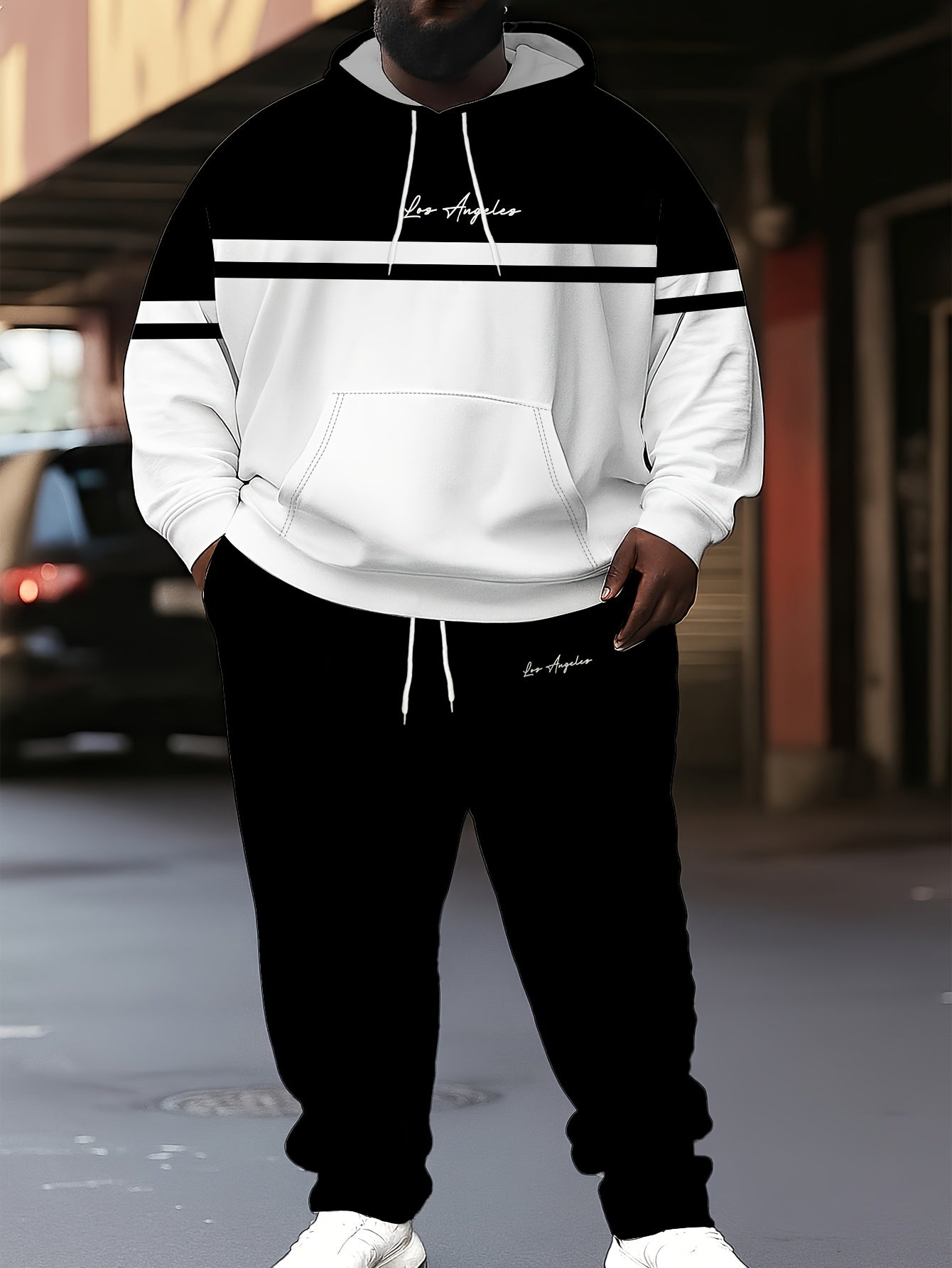 This plus size men's casual set features a hoodie and jogger pants adorned with a trendy Paris letter print, giving it a contemporary urban flair. Constructed from 100% polyester knit fabric, it offers a regular fit with a comfortable, non-stretch feel perfect for daily wear. The hoodie includes a traditional hooded collar, while the jogger pants present a relaxed fit that enhances the laid-back look. Made with durable materials and easy to maintain through machine washing, this set is ideal for casual activities or relaxing. Produced in Jiangxi, China, it blends modern style with functional comfort for plus size men.