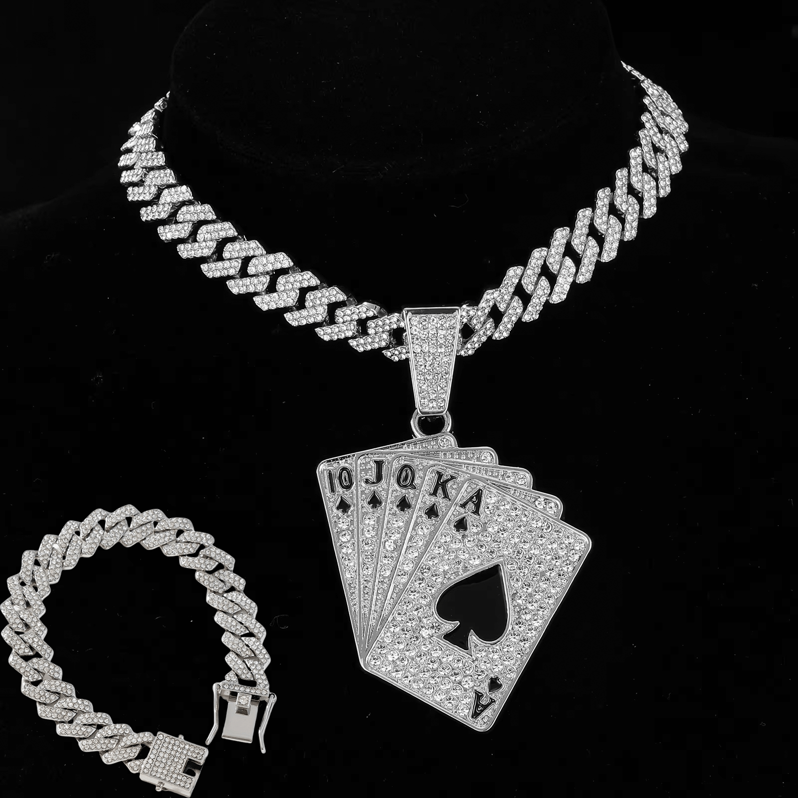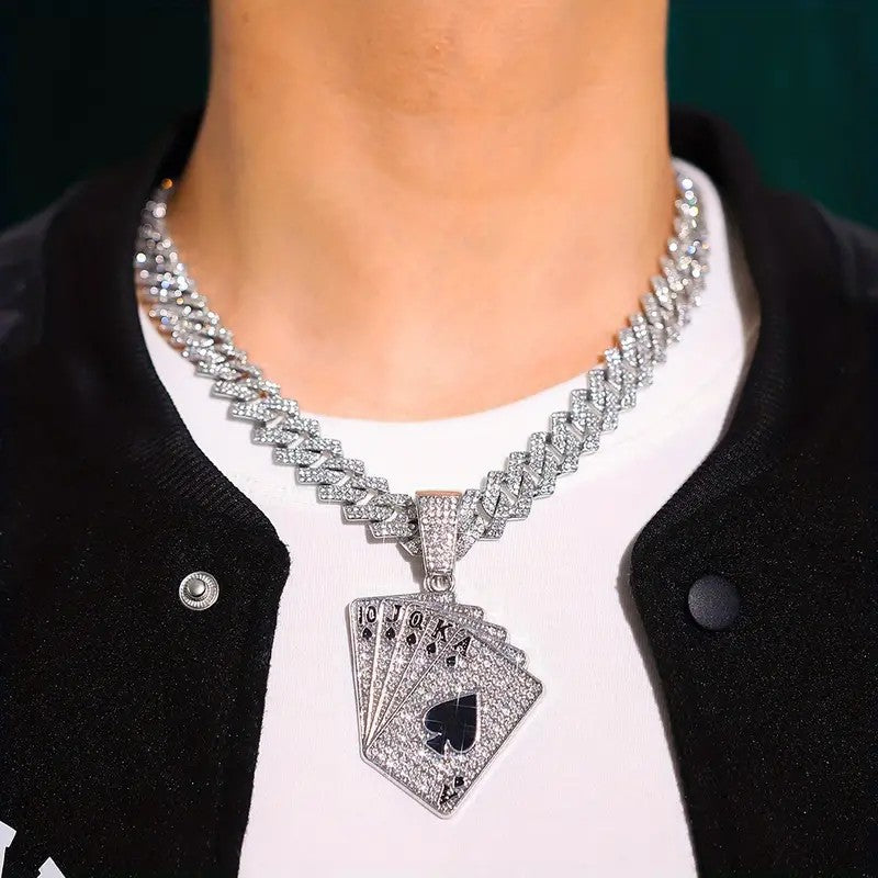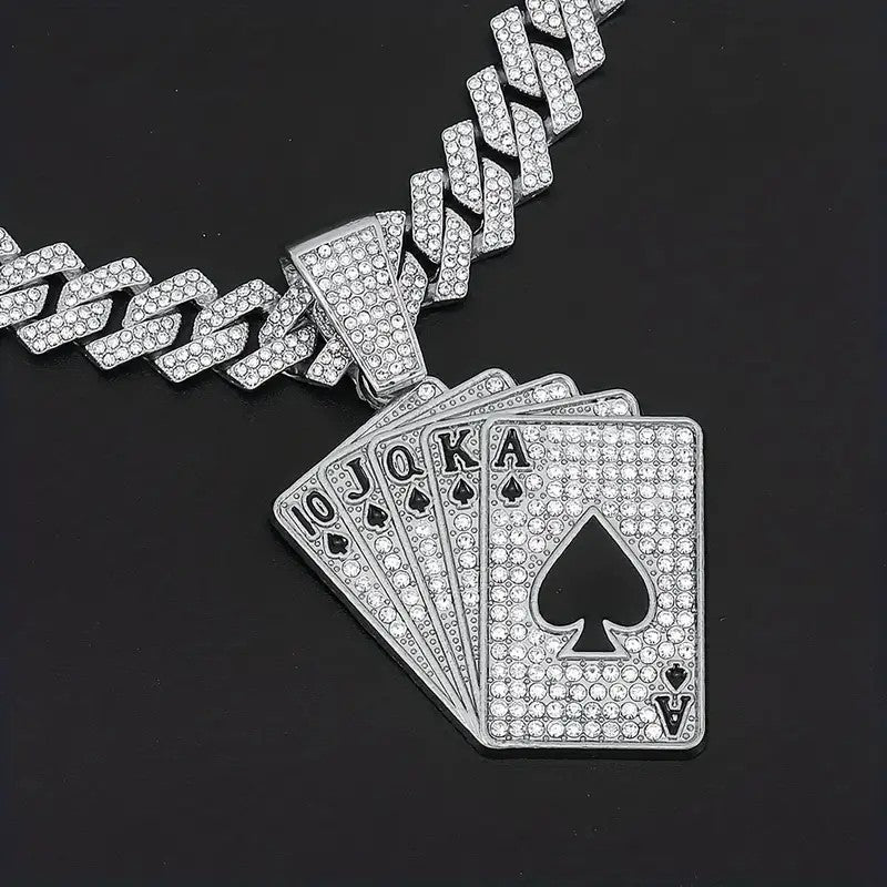 The JUNTAOIC 1 Poker Pendant Cuban Chain Necklace and Bracelet Set showcases a vintage-inspired design made from sturdy zinc alloy. Accented with dazzling rhinestone mosaics, both pieces bring a refined sparkle that enhances everyday looks or special occasions. The classic Cuban chain provides timeless style combined with comfortable wearability. Manufactured in Zhejiang, China, this set merges strong materials with meticulous detailing, offering a fashionable and lasting accessory for those who value vintage charm with a contemporary twist.