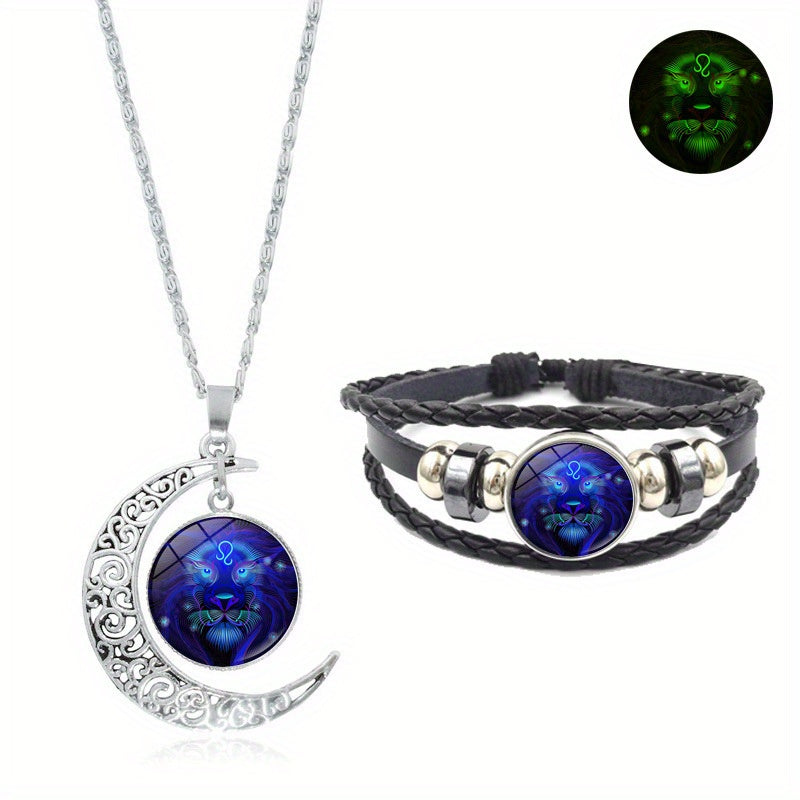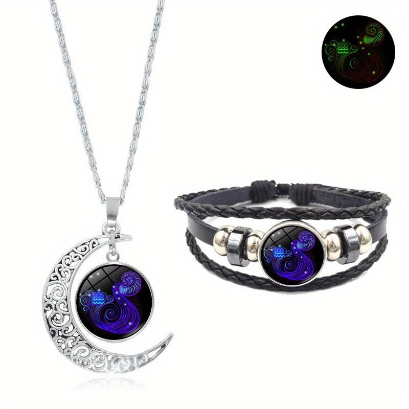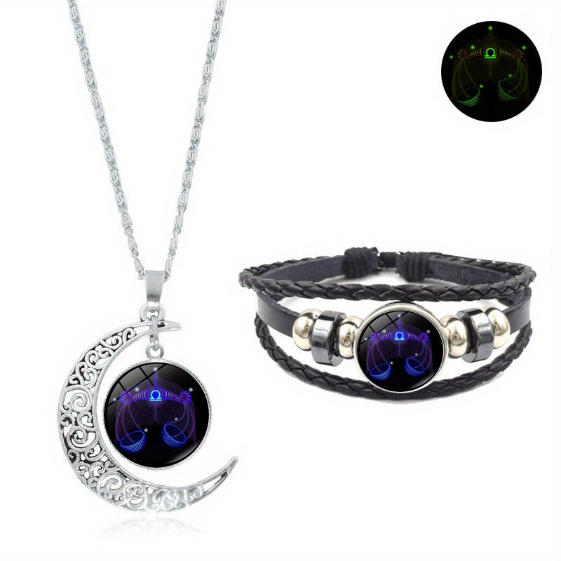 1pc Glow-in-the-Dark Zodiac Necklace Set Hollow Moon Pendant Leather Bracelet Jewelry Set
