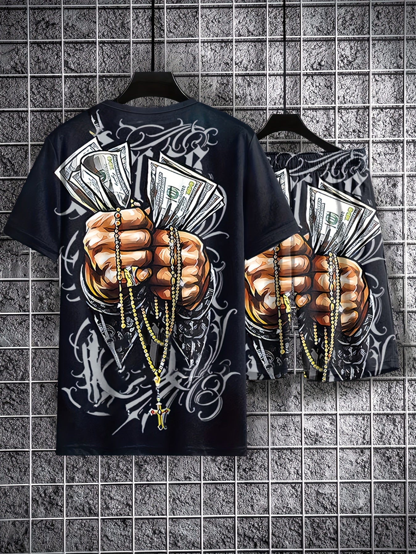 This men's two-piece outfit includes a short-sleeve crew neck T-shirt and drawstring shorts, both adorned with a striking 3D printed money hand pattern that embodies hip hop culture. Crafted from 100% polyester knit fabric, it ensures breathability and durability, ideal for summer. The T-shirt offers a relaxed, comfortable fit, while the shorts feature convenient pockets and an adjustable drawstring for a customizable fit. Merging urban style with practical design, this set is perfect for those who want both fashion and comfort during warm weather.