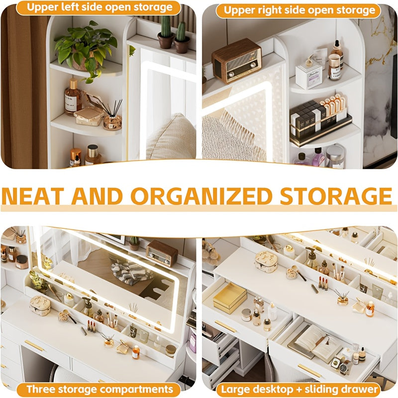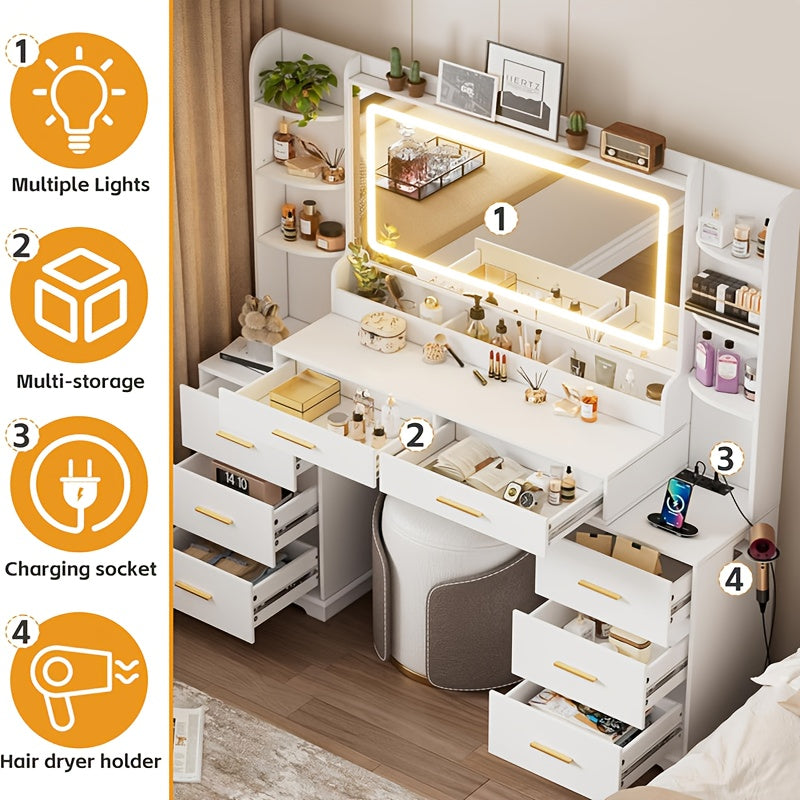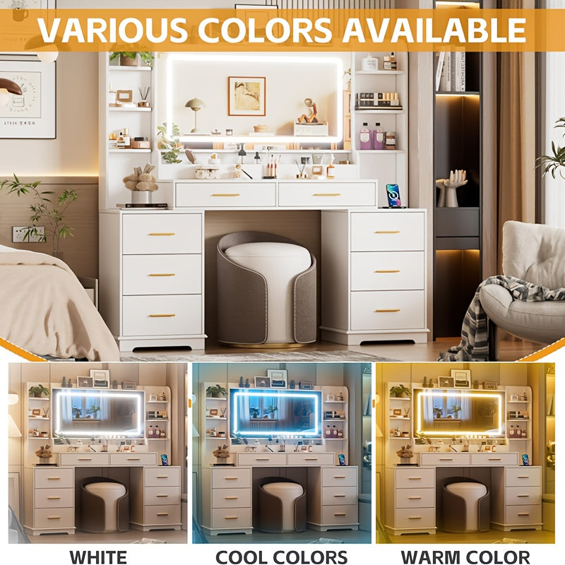The 59" large vanity desk from PAKASEPT combines style and practicality for your bedroom. Constructed from wood and artificial board with a clean white finish, it showcases a modern design that fits well with contemporary interiors. The vanity features an LED mirror with three adjustable color settings to ensure perfect lighting for makeup application. It includes eight roomy drawers offering less than 3.2 cubic feet of storage, helping you keep your beauty essentials neatly organized. A built-in hair dryer stand adds convenience to your daily routine. Measuring at least 27 inches high and weighing under 30 pounds, this pre-assembled unit requires no batteries or electricity. Manufactured in Shanghai, China, it balances quality craftsmanship with functional design, catering to those who value both elegance and utility.