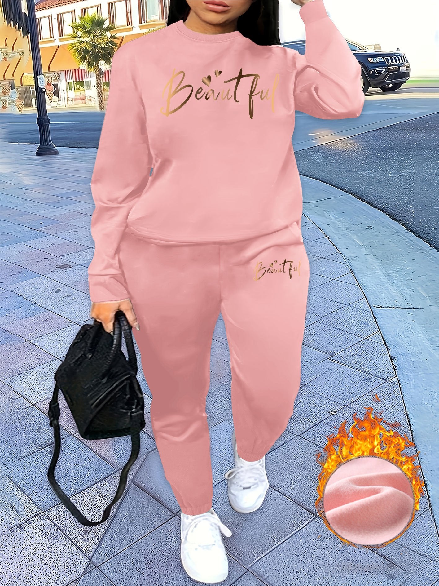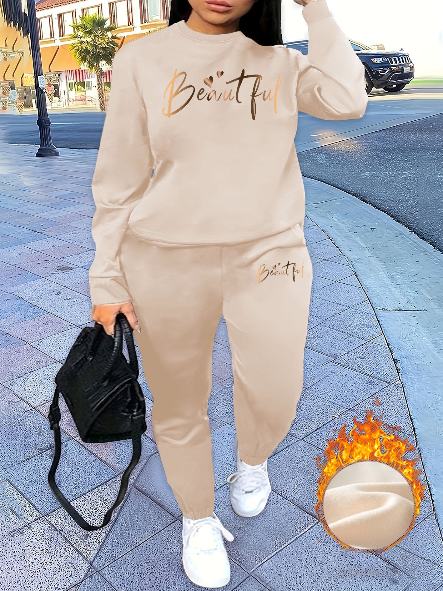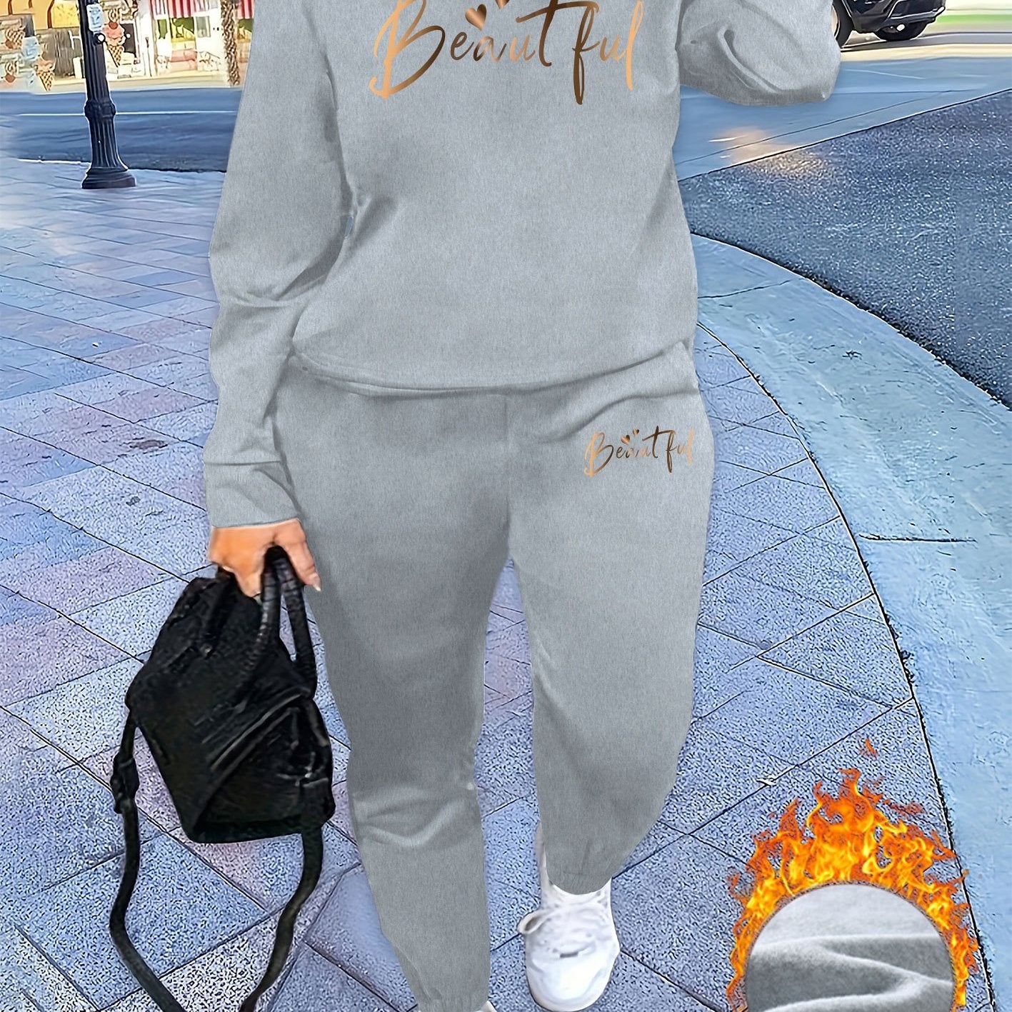 This women's gray two-piece set includes a casual crew neck sweatshirt and coordinating pants, both constructed from 100% polyester knit fabric with mild stretch to provide ease of movement. The sweatshirt features a refined "Beautiful" letter print applied through precise positioning printing, adding a subtle, elegant touch. Suitable for wear throughout the year, this set offers durability and straightforward care with machine washable material. Made in Guangdong, China, it delivers a blend of relaxed style and functional comfort, perfect for daily wear and casual settings.
