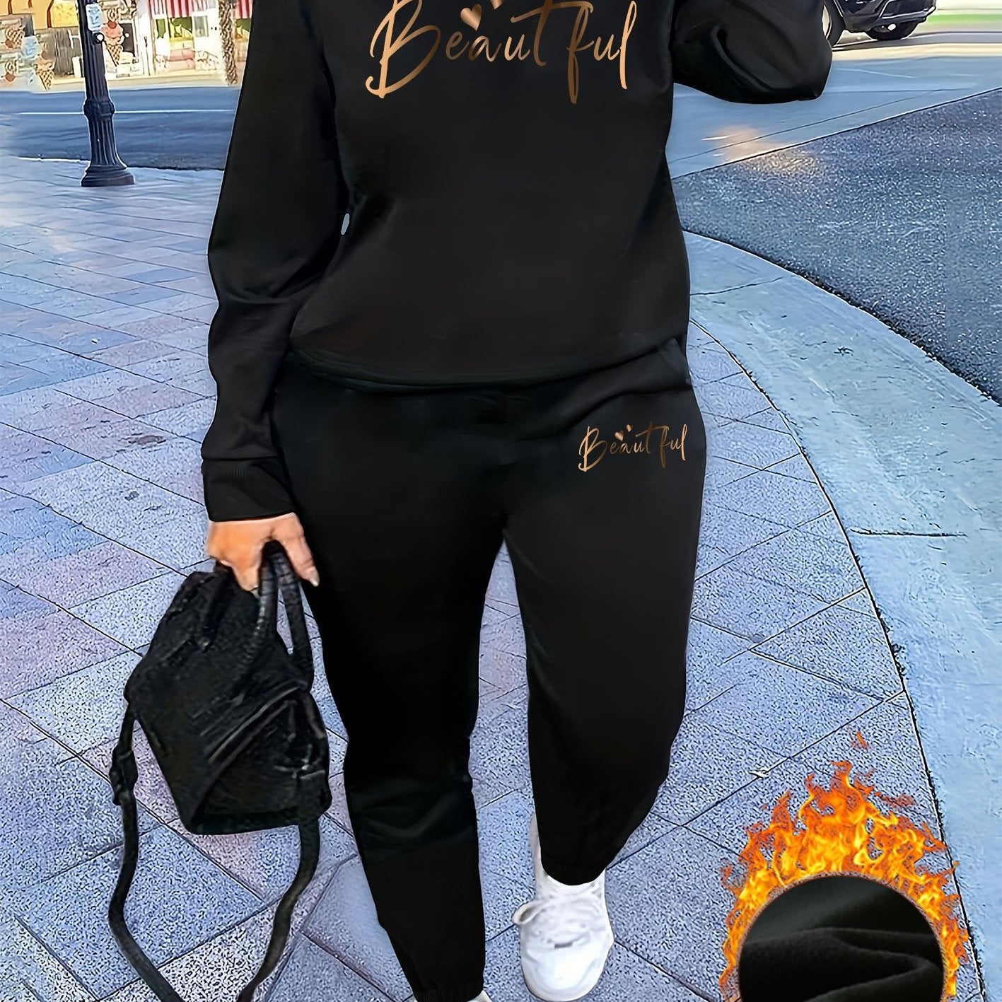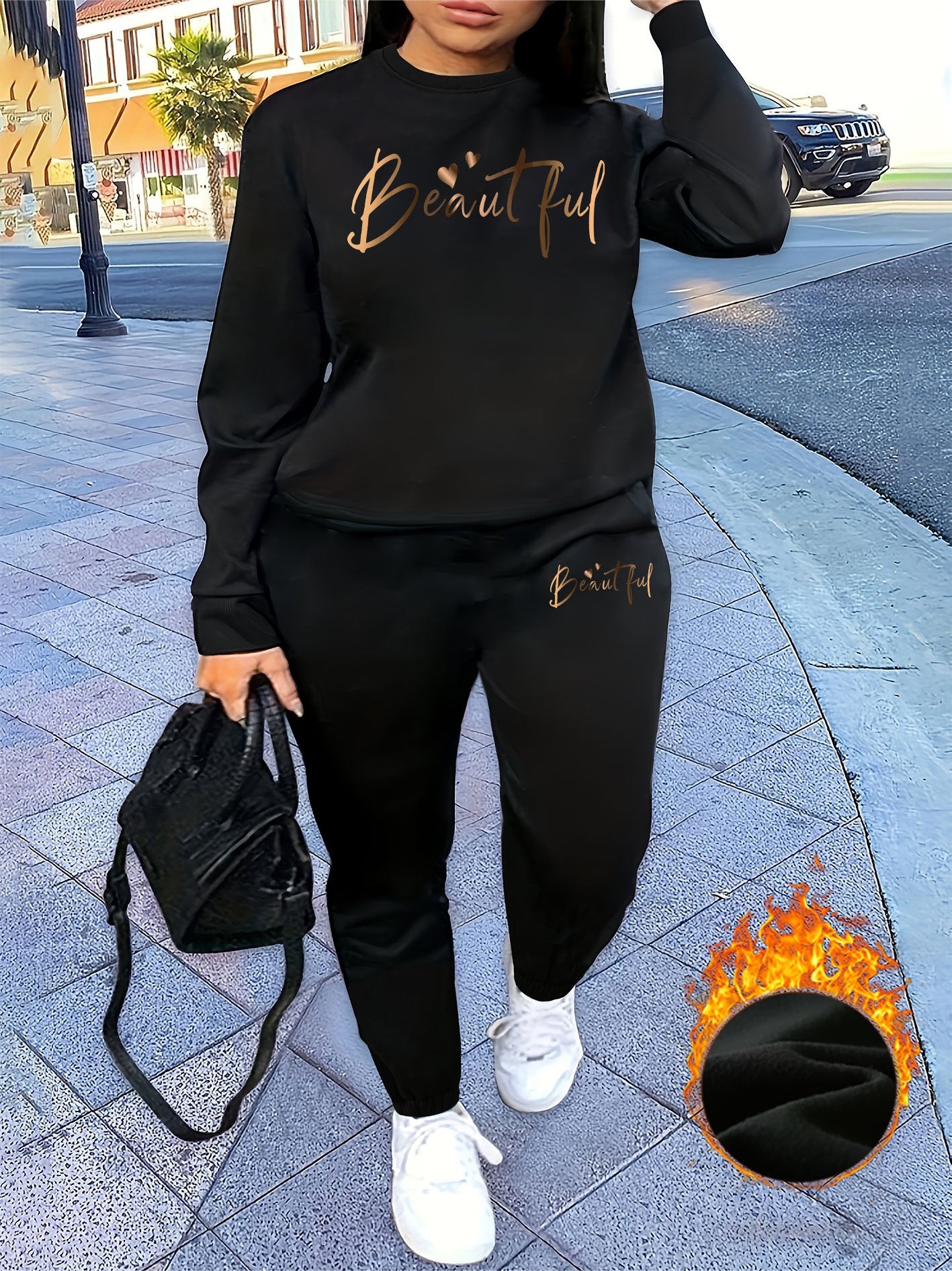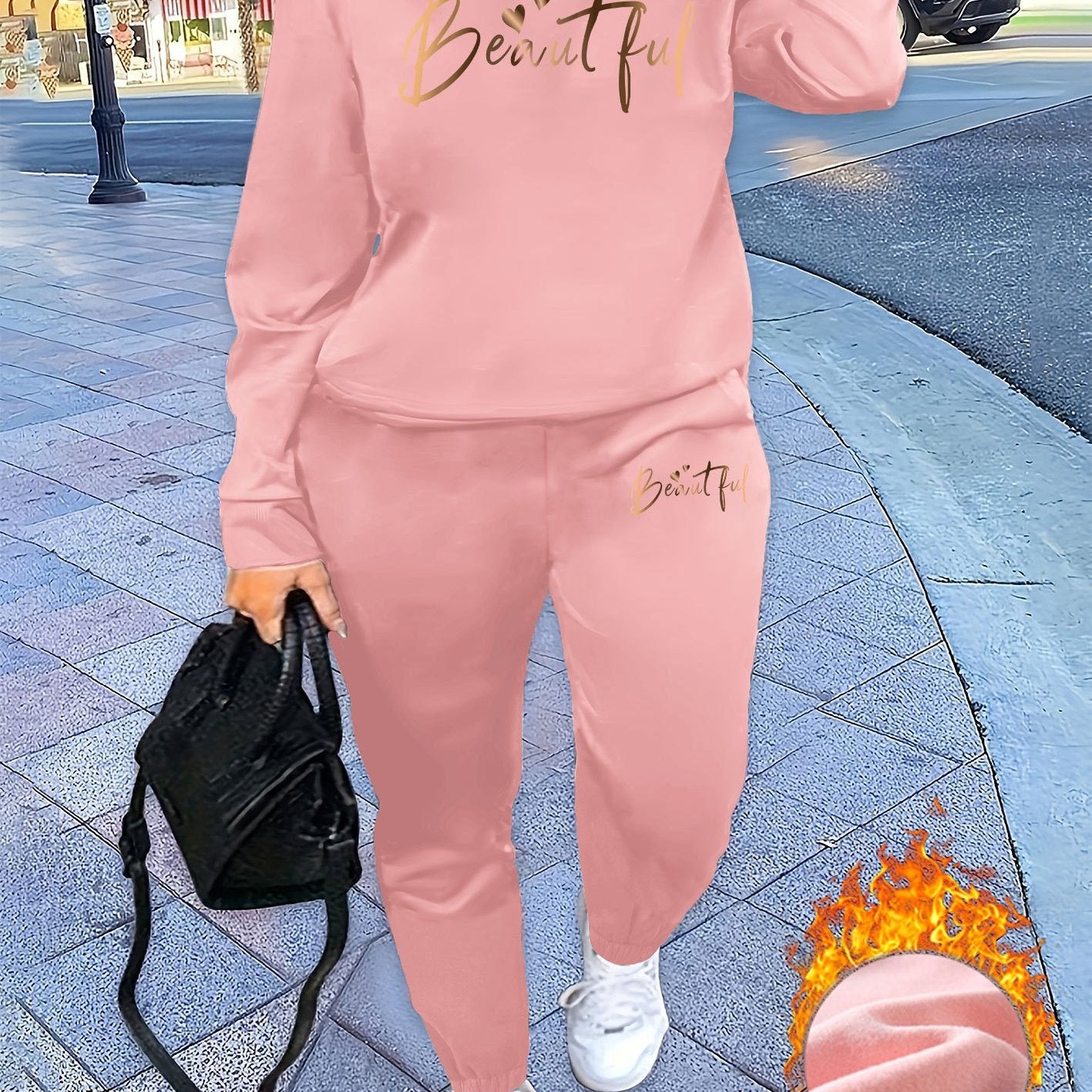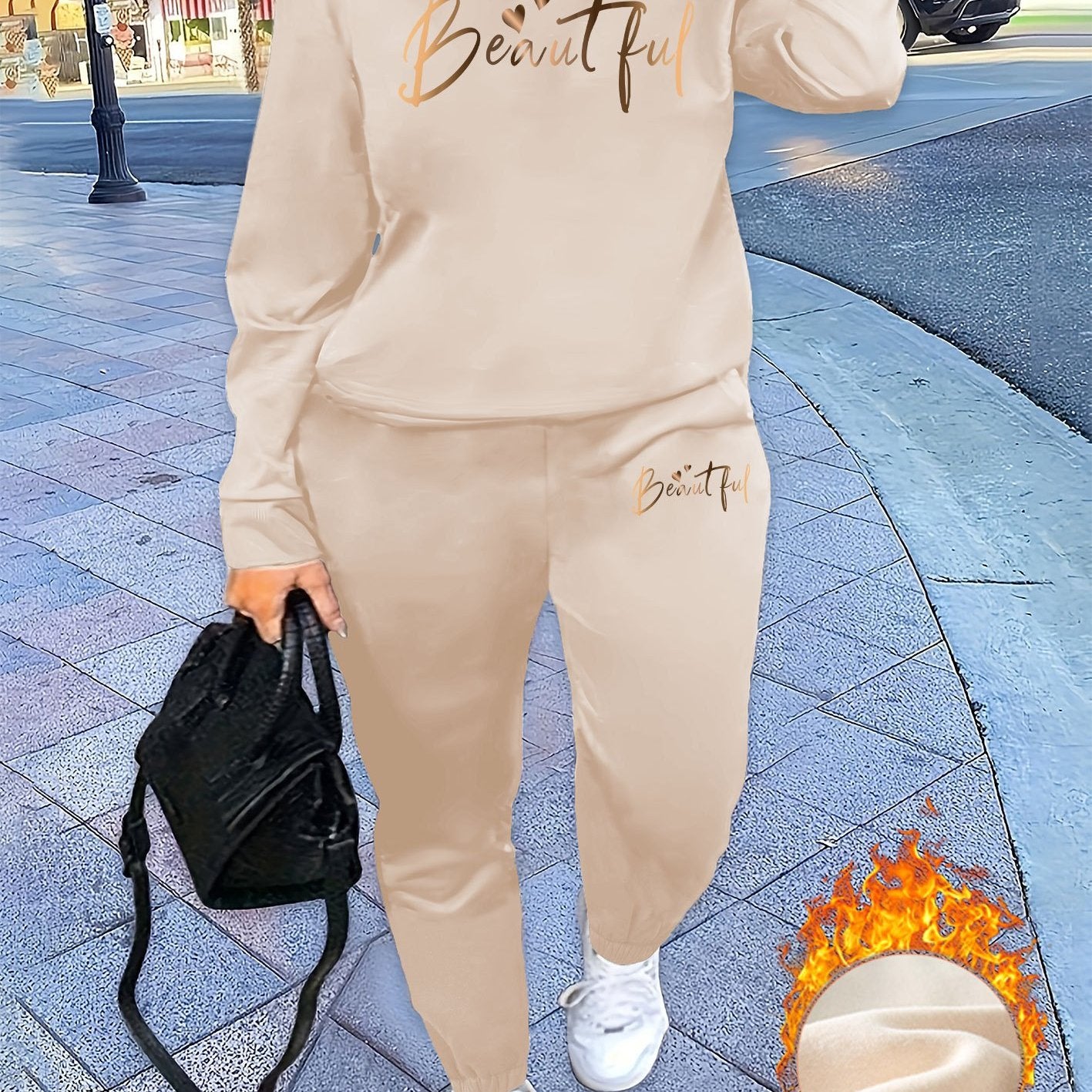 This women's gray two-piece set includes a casual crew neck sweatshirt and coordinating pants, both constructed from 100% polyester knit fabric with mild stretch to provide ease of movement. The sweatshirt features a refined "Beautiful" letter print applied through precise positioning printing, adding a subtle, elegant touch. Suitable for wear throughout the year, this set offers durability and straightforward care with machine washable material. Made in Guangdong, China, it delivers a blend of relaxed style and functional comfort, perfect for daily wear and casual settings.