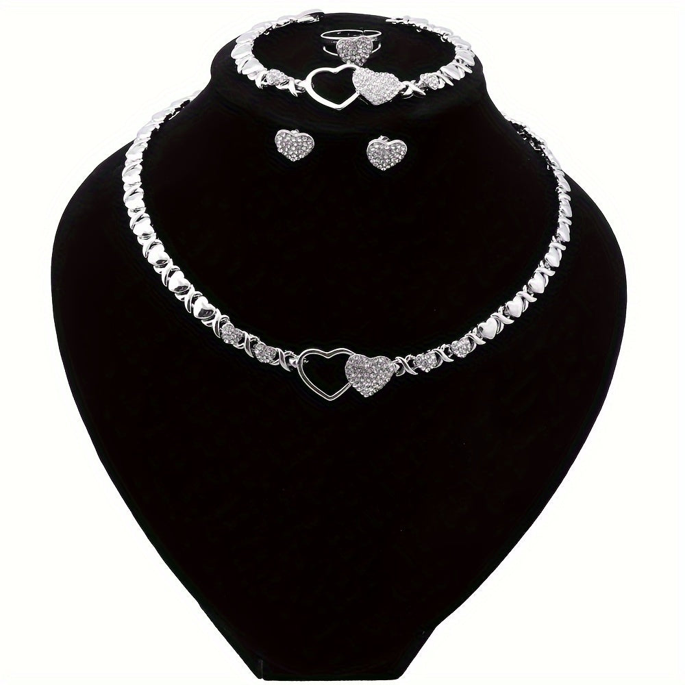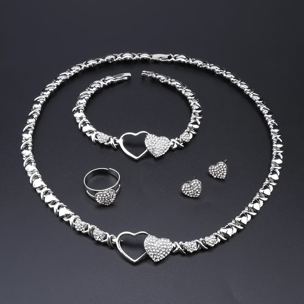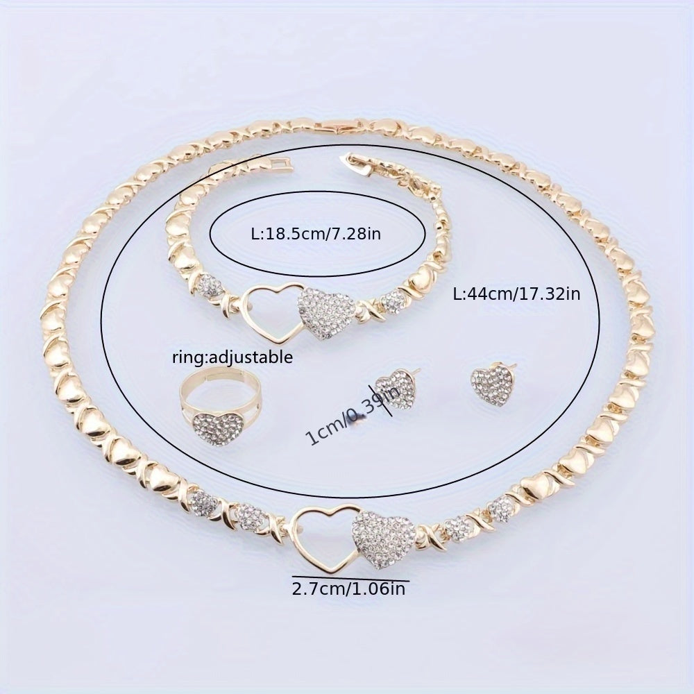 This elegant jewelry set showcases a heart-shaped motif embellished with dazzling rhinestones, adding a touch of sophistication to any party or wedding ensemble. Made from premium alloy and finished with 18K gold plating, it ensures enduring brilliance and strength. The collection includes a necklace, earrings, bracelet, and ring, each designed to harmonize seamlessly for a unified appearance. Perfect for occasions such as the Spring Festival and Mother’s Day, this adaptable set combines understated elegance with celebratory flair, making it an ideal gift or a stylish accessory for
