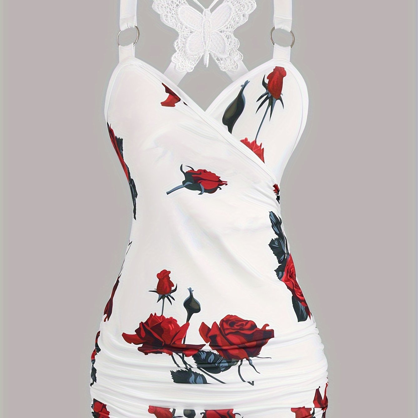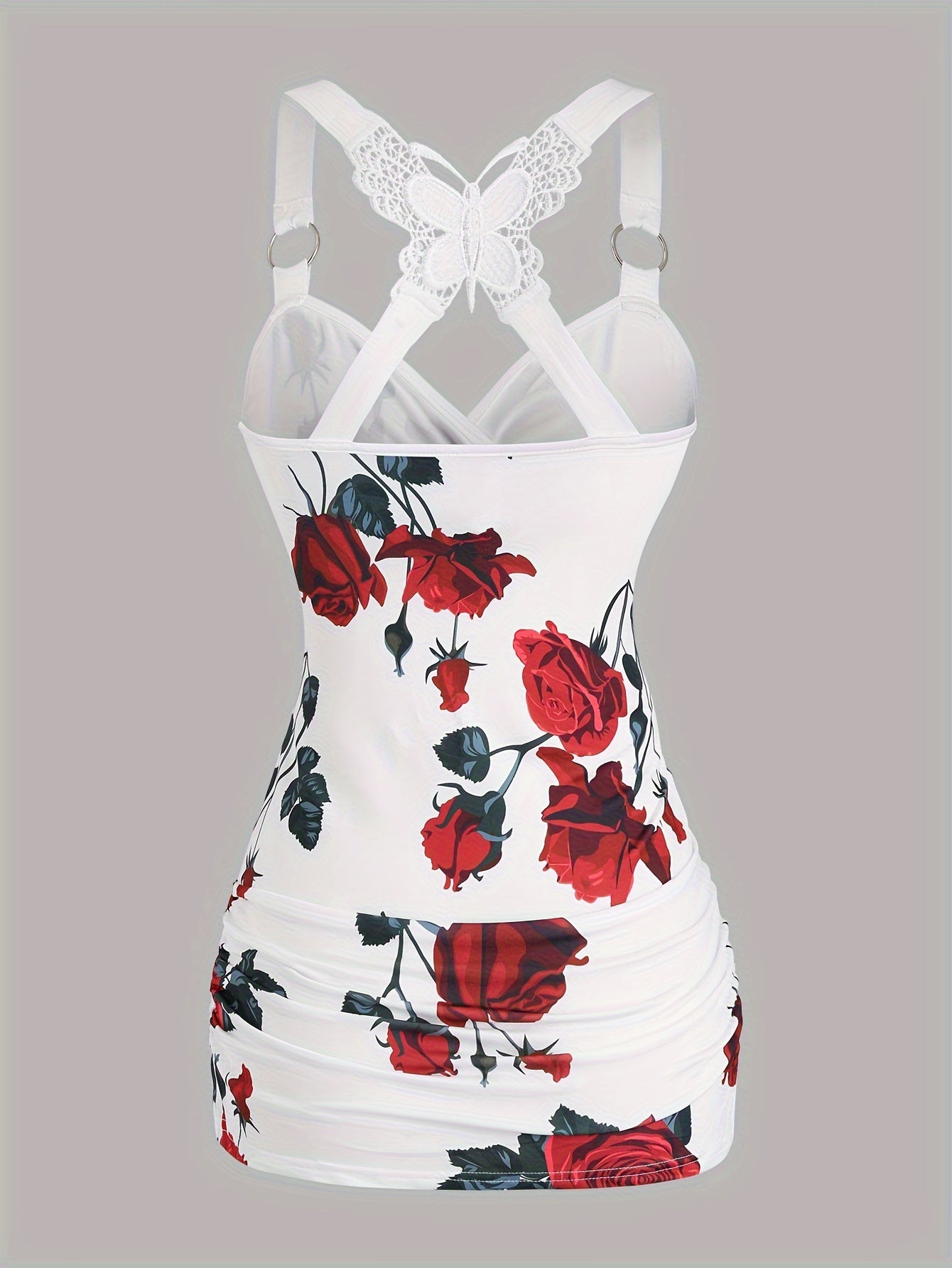 This Floral Print Butterfly Applique Tank Top combines elegance and comfort, ideal for spring and summer seasons. It features a trendy surplice V-neckline with a backless design and a slim fit that flatters the figure, complemented by a stylish O-ring detail for a contemporary edge. Crafted from 100% polyester with micro elasticity, the knit fabric allows ease of movement and feels soft on the skin. Enhanced by a subtle floral print created through random printing and contrasted lace accents, this top delivers a fresh and feminine appeal. It is easy to care for with machine wash instructions, making it a versatile addition to your wardrobe.