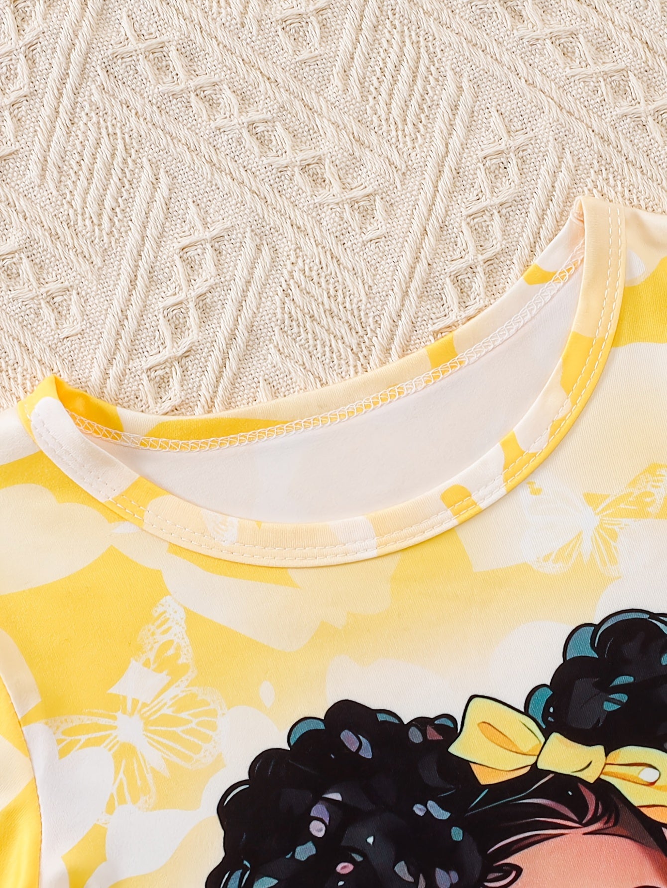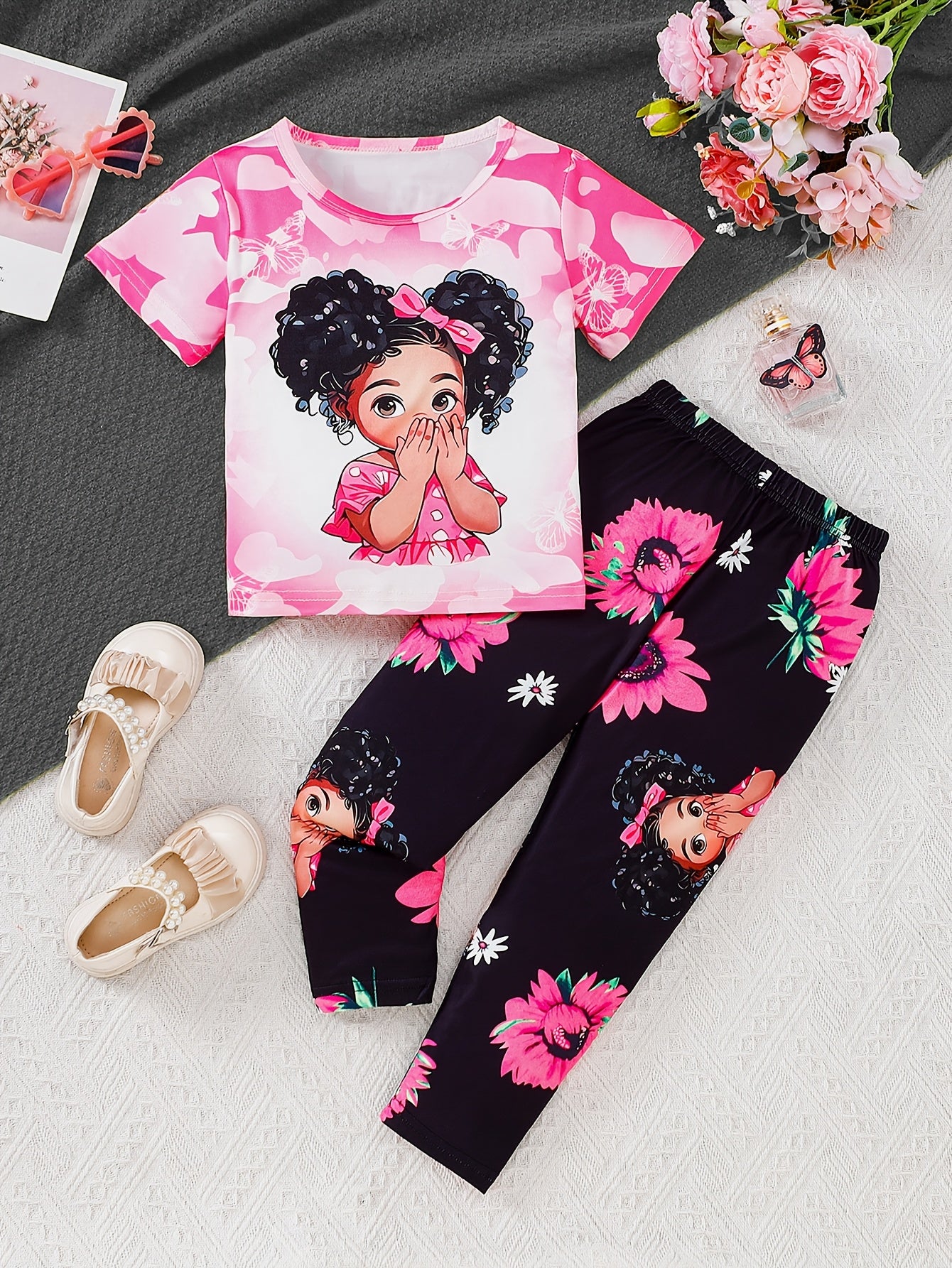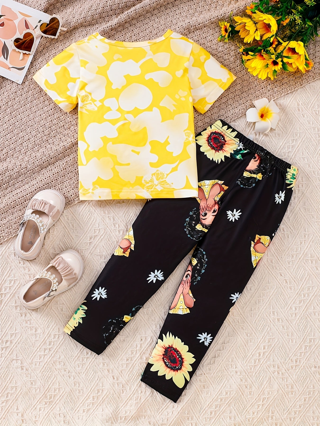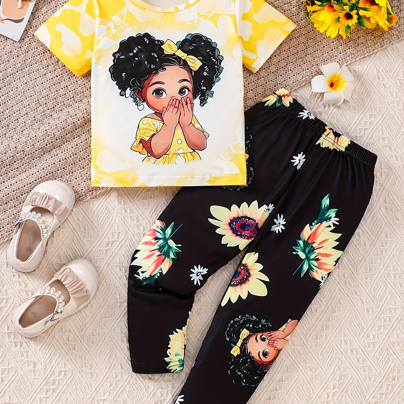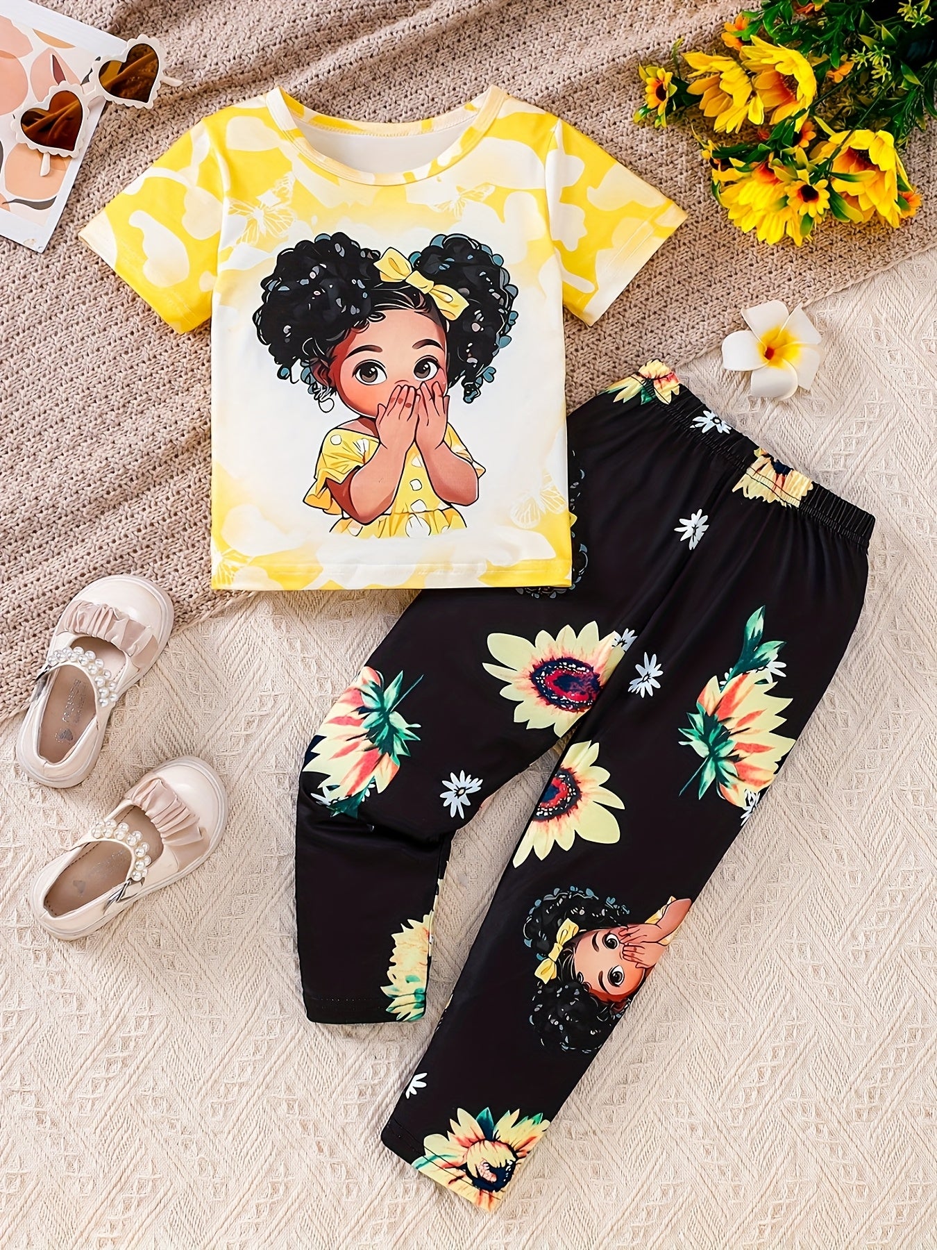 This girls’ two-piece outfit includes a short-sleeve T-shirt adorned with a captivating portrait print and matching pants featuring a bright sunflower pattern. Both pieces are made from a medium-stretch knitted fabric blend of 95% polyester and 5% spandex, providing a comfortable regular fit with a classic crew neck. Designed for breathability and ease, the pullover top is ideal for spring and summer wear. The lively sunflower-printed pants complete a casual yet stylish ensemble perfect for outdoor play. Machine washable for convenience (dry cleaning not recommended), this durable set is produced in Guangdong, China, offering a blend of fun design and everyday comfort for girls aged 3 and older.