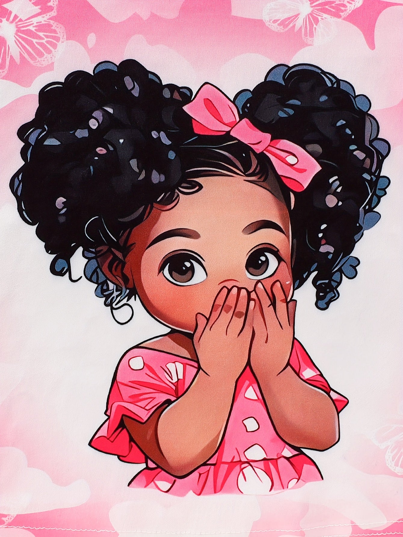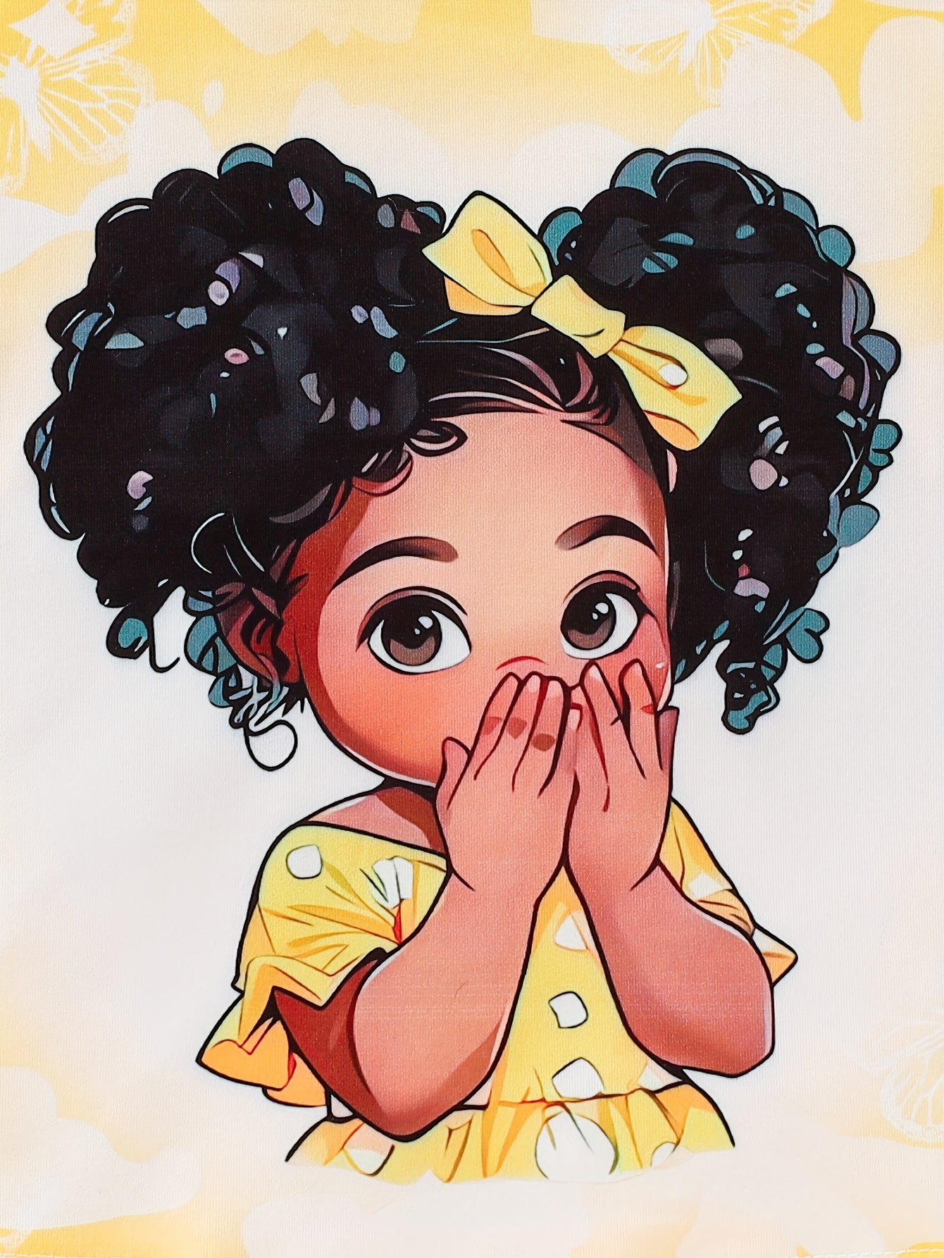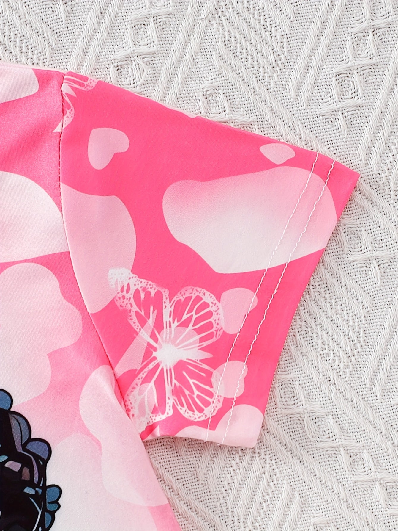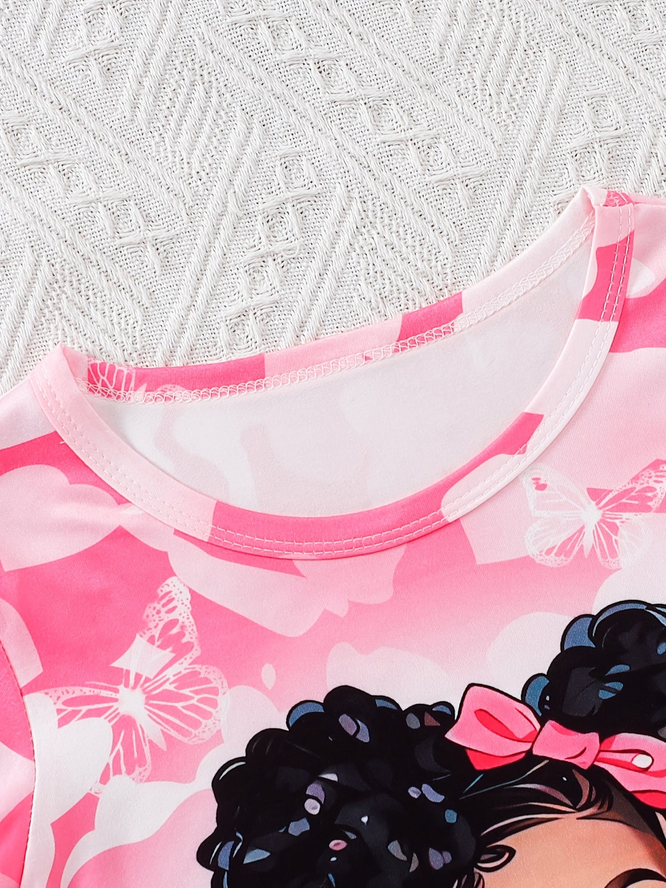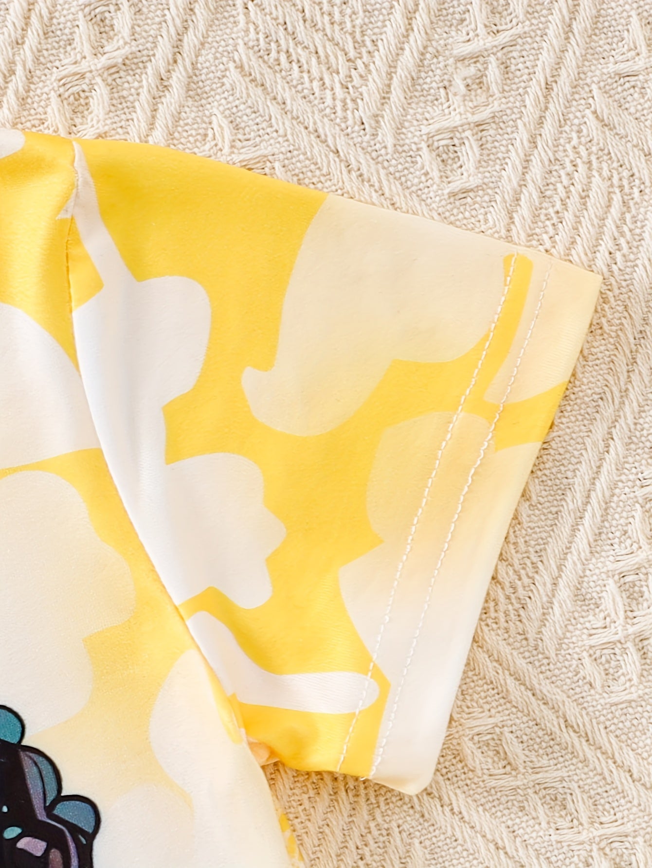 This girls’ two-piece outfit includes a short-sleeve T-shirt adorned with a captivating portrait print and matching pants featuring a bright sunflower pattern. Both pieces are made from a medium-stretch knitted fabric blend of 95% polyester and 5% spandex, providing a comfortable regular fit with a classic crew neck. Designed for breathability and ease, the pullover top is ideal for spring and summer wear. The lively sunflower-printed pants complete a casual yet stylish ensemble perfect for outdoor play. Machine washable for convenience (dry cleaning not recommended), this durable set is produced in Guangdong, China, offering a blend of fun design and everyday comfort for girls aged 3 and older.