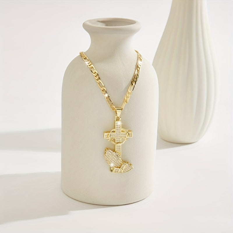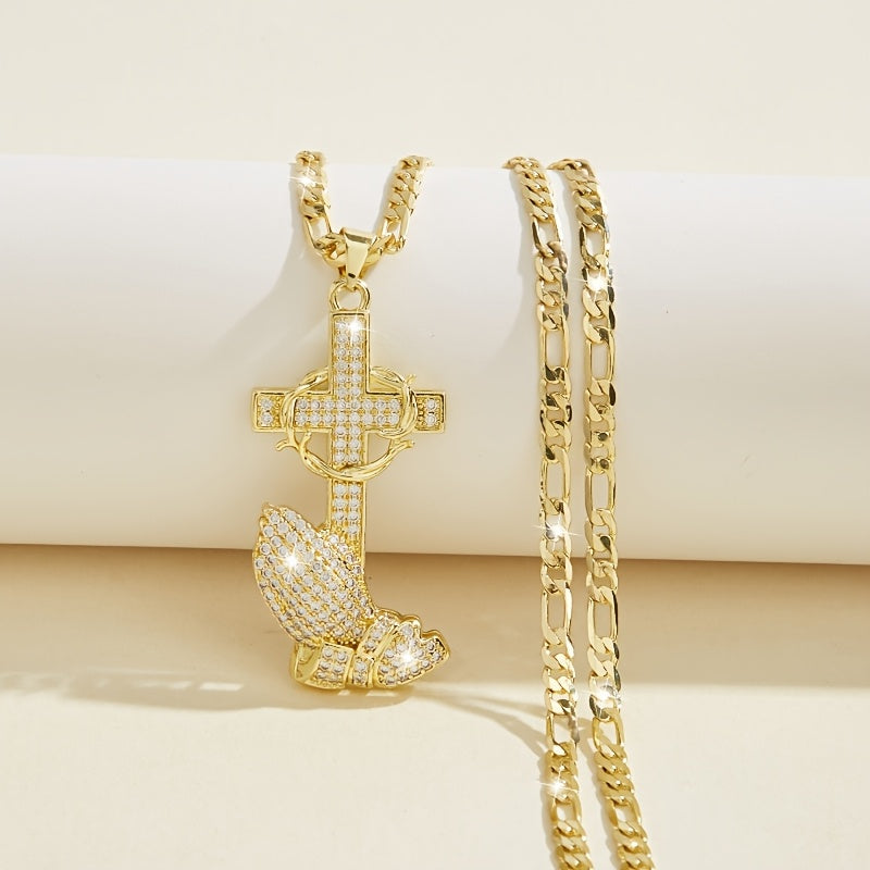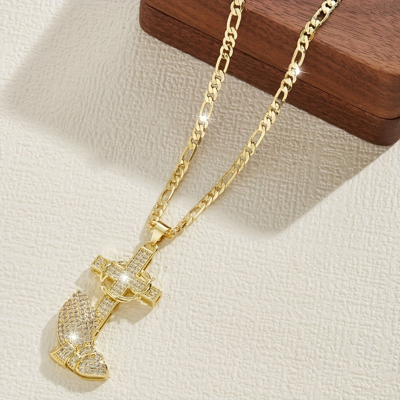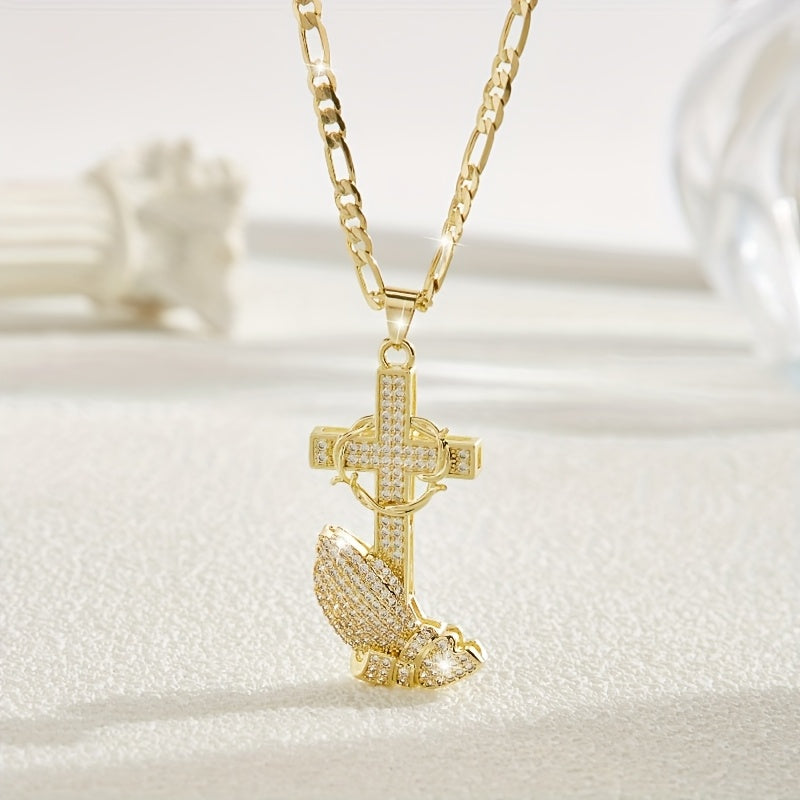 This 14K gold-plated pendant necklace showcases a detailed cross and prayer hand motif, accented with brilliant 3A zirconia stones for refined elegance. Made from sturdy copper with premium plating, it ensures durability and a lasting polished finish. Ideal for weddings, parties, and other special events, this versatile accessory complements both religious and celestial-themed outfits. Its boho-inspired design adds a distinctive festive charm, making it an excellent gift choice for occasions like Valentine’s Day and Thanksgiving. Manufactured in Guangdong, China, this necklace combines symbolic meaning with expert craftsmanship for year-round wear.