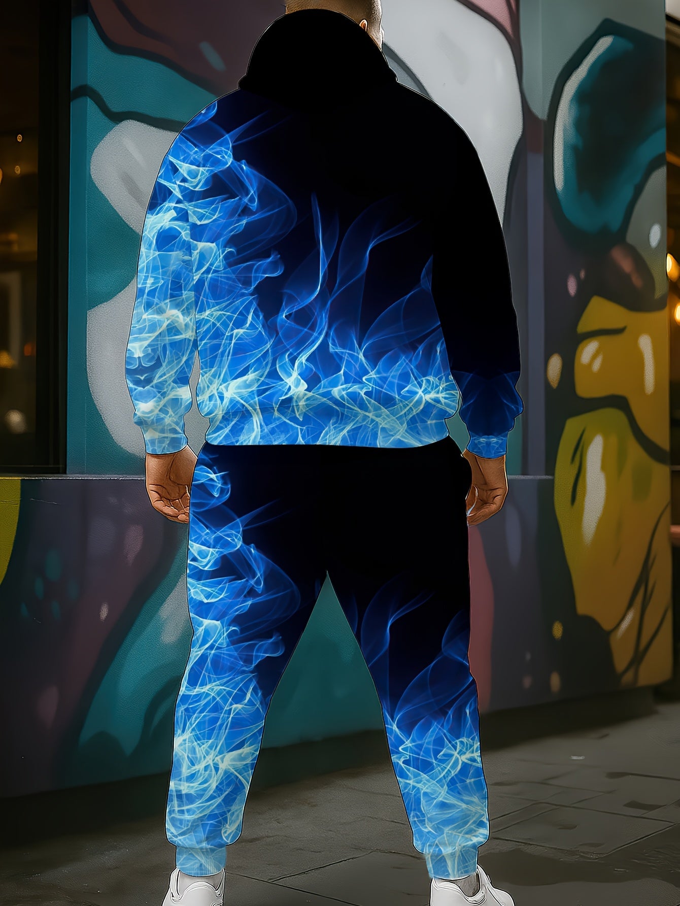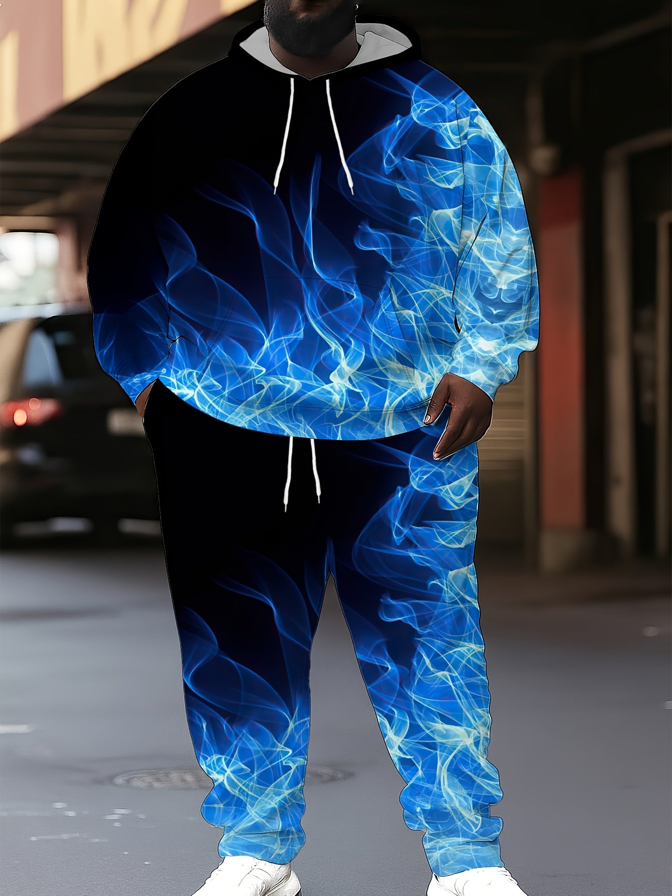Men Plus Casual Blue Flame Print Large Size Sweatshirt And Pants Two-Piece Set