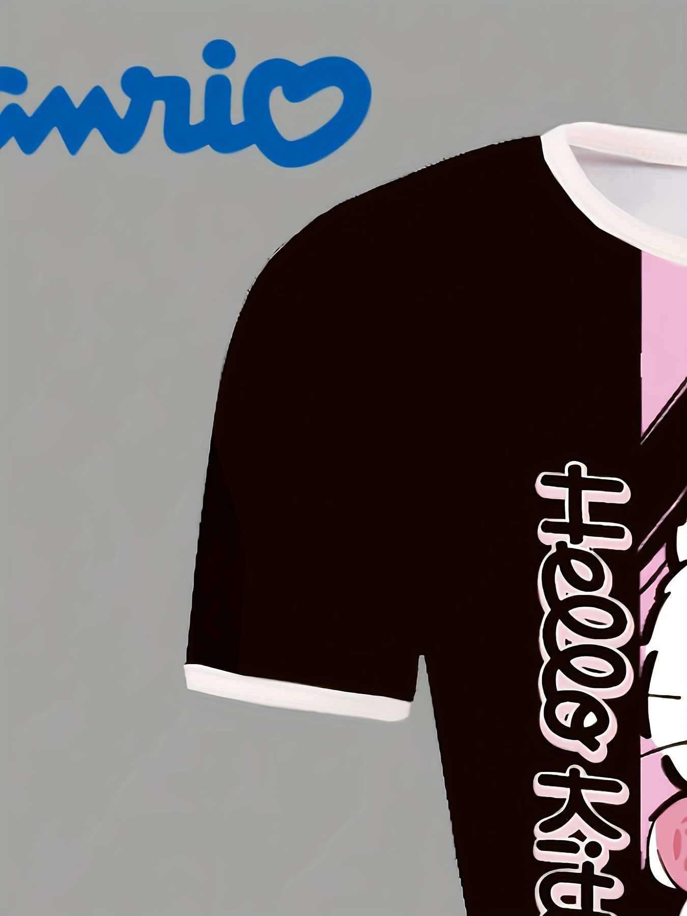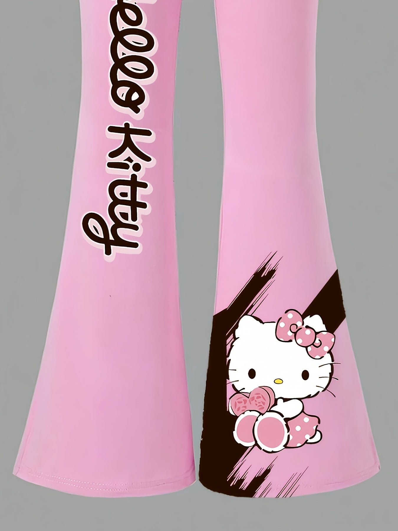This Sanrio Ku'luo'm two-piece outfit is perfect for teenage girls aged 12 and older, blending fun design with comfort. It features a short round neck T-shirt adorned with a charming heart bow and slim fit flared pants, both made from a slightly stretchy polyester-spandex blend to provide flexibility and maintain shape. The crew neck top and fitted pants deliver a sleek silhouette ideal for relaxed summer wear. Crafted from durable knit fabric, this set is machine washable for easy care, offering lasting comfort and style for active teens.