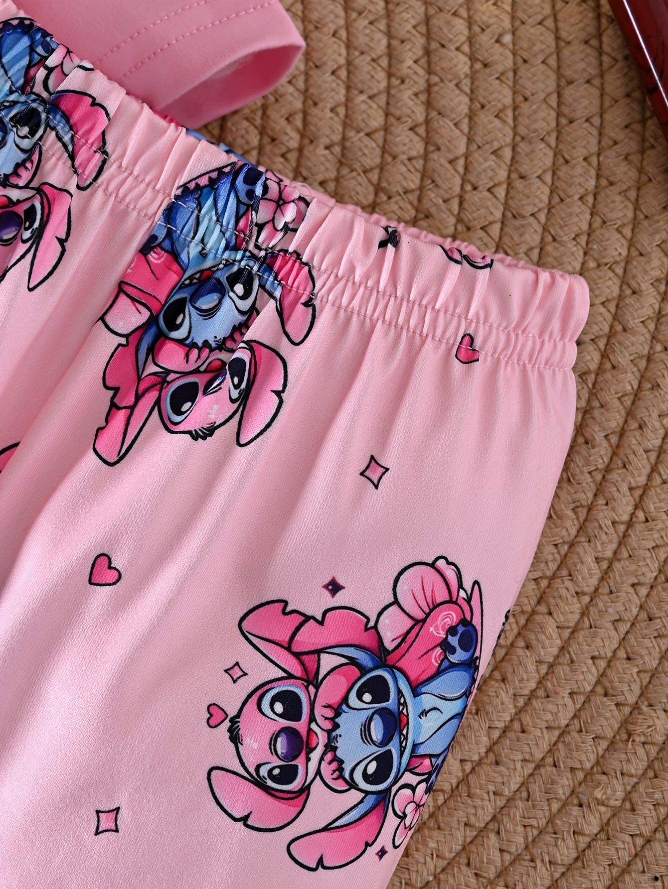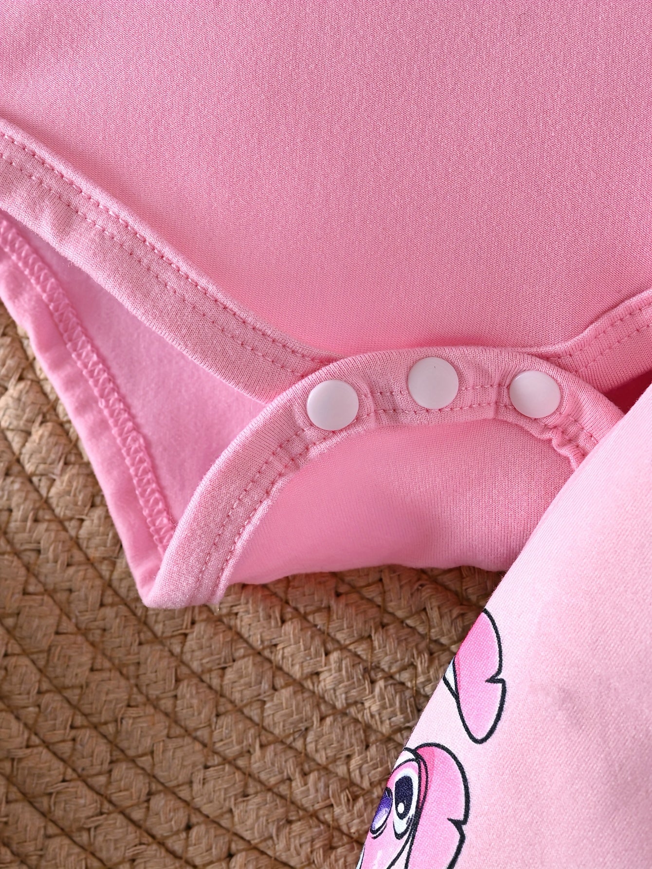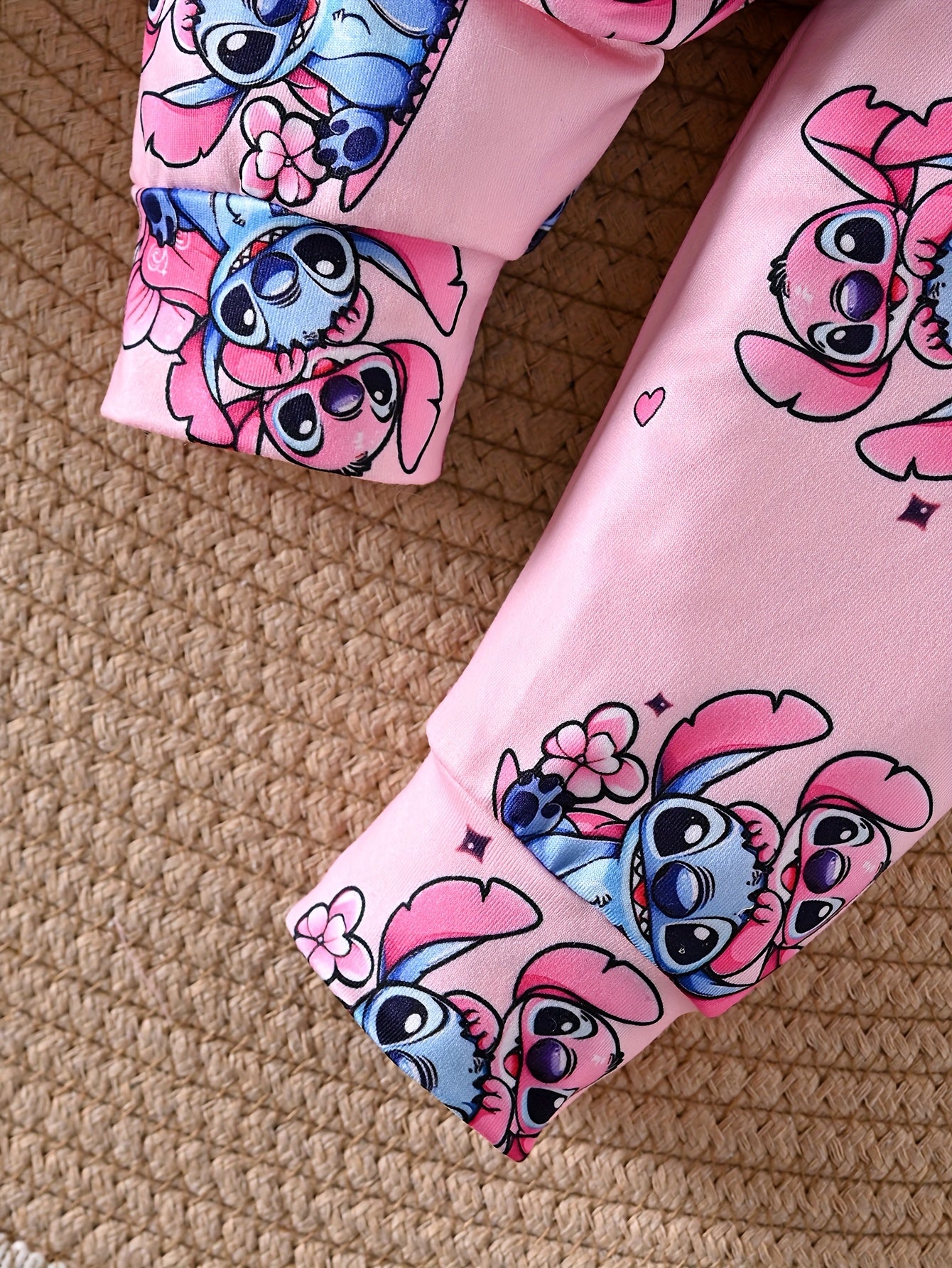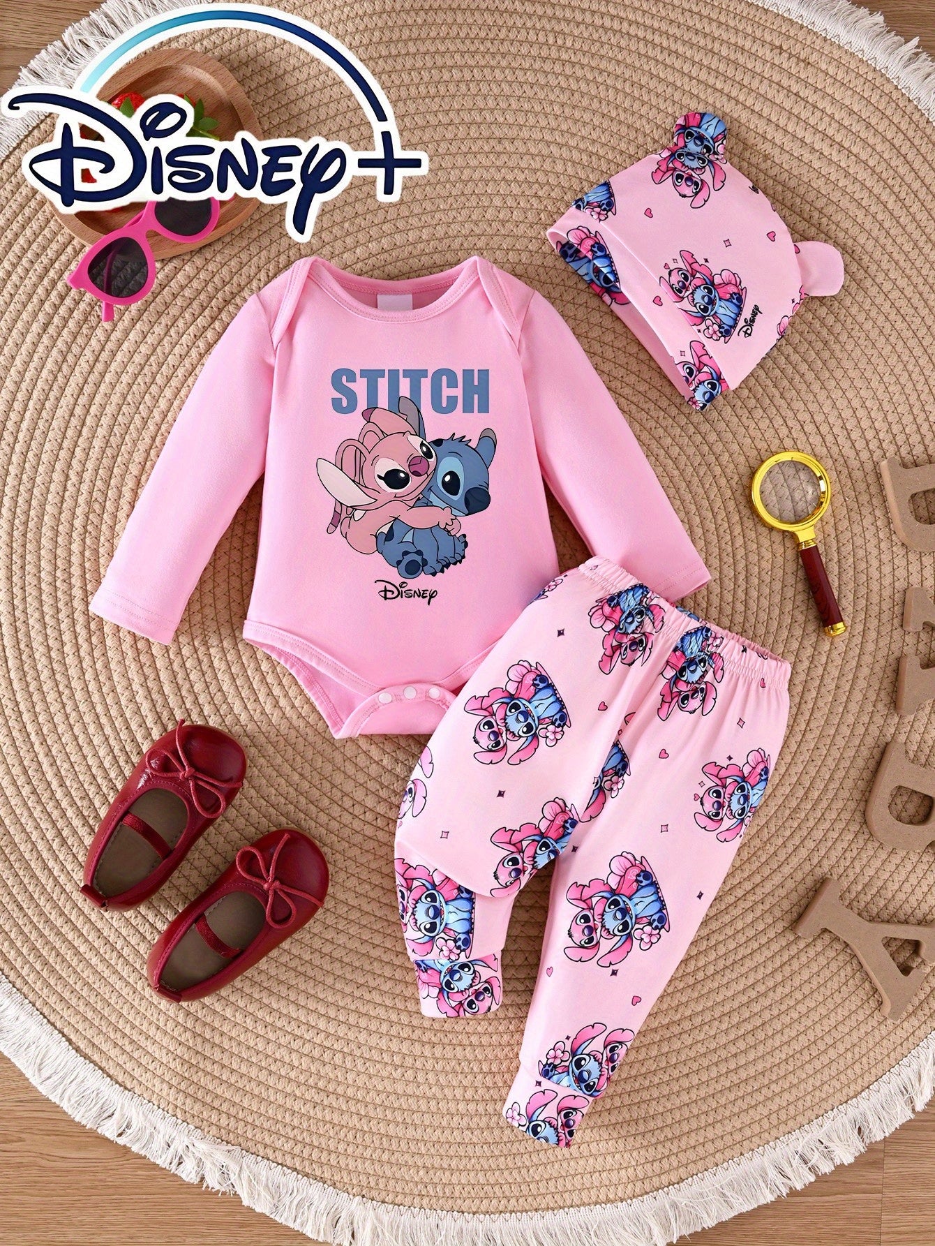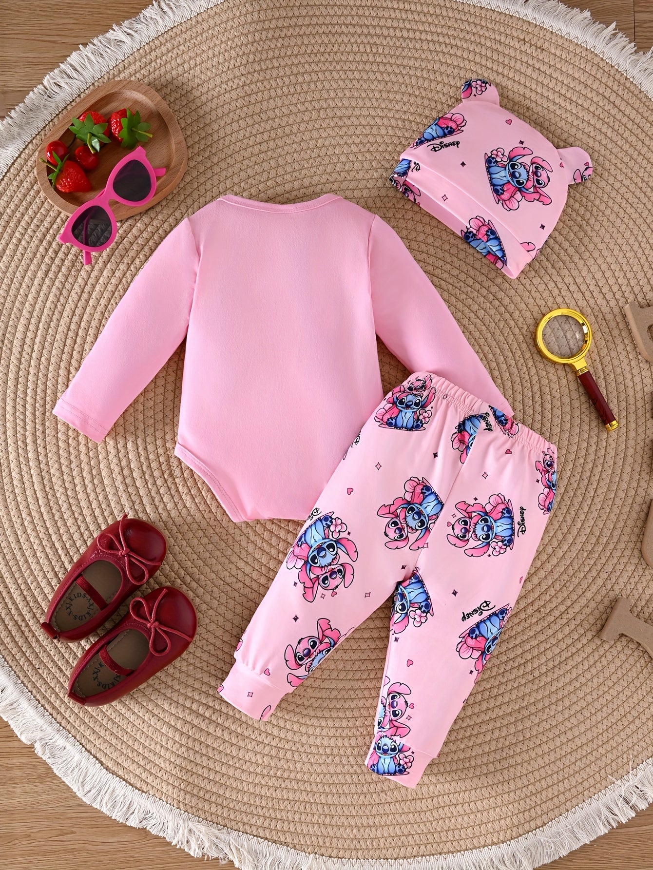 This three-piece set for newborn boys and girls features a charming Stitch and angel cartoon print, combining adorable style with practical design. The set includes a long-sleeve knit bodysuit with a crew neck and applique details, matching all-over Stitch print pants, and a coordinating hat to complete the outfit. Crafted from a soft, slightly stretchy blend of 95% polyester and 5% spandex, the regular fit offers comfort and flexibility for babies aged 0-12 months. Suitable for all seasons—spring, summer, autumn, and winter—this breathable, knit fabric set is perfect for outdoor activities and everyday casual wear. Easy to care for with machine wash or professional dry cleaning, it is made in Guangdong, China, ensuring quality and durability.